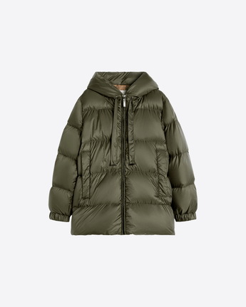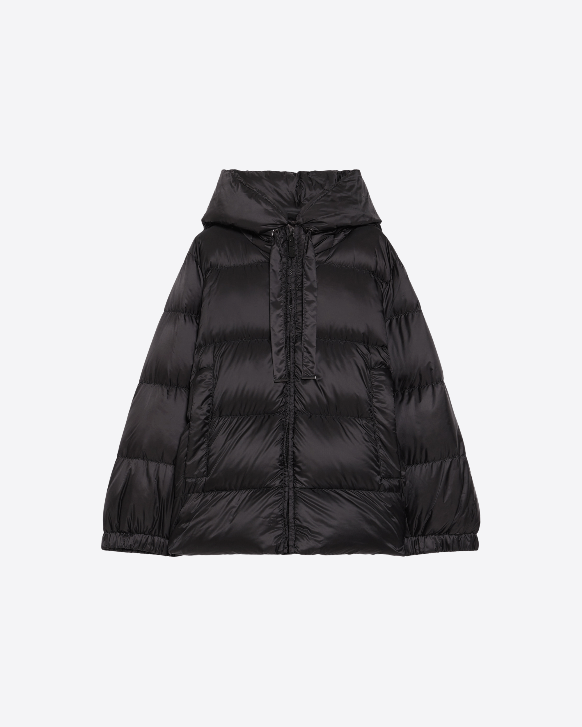 Piumino corto leggermente over, con motivo trapuntato all over a righe orizzontali.