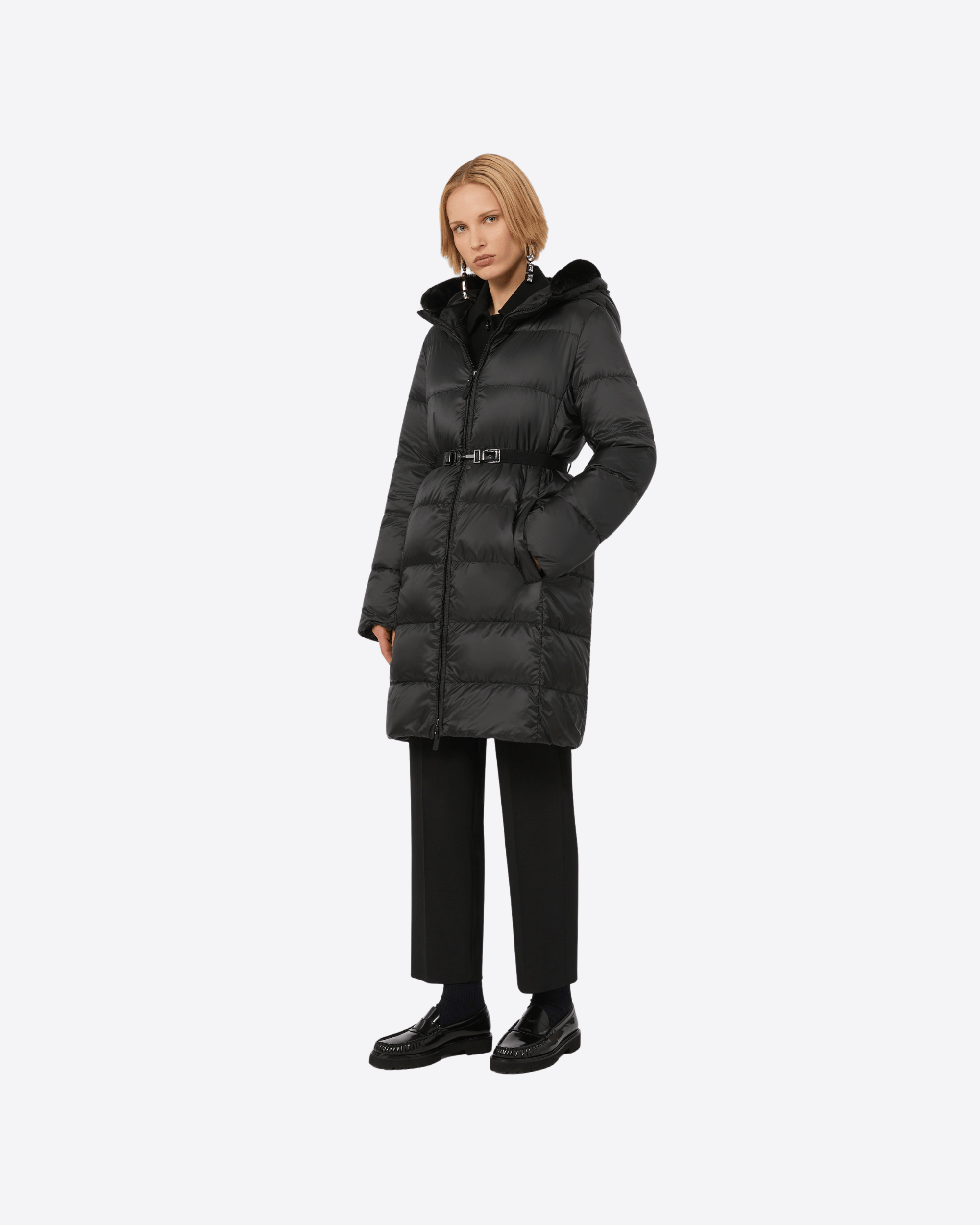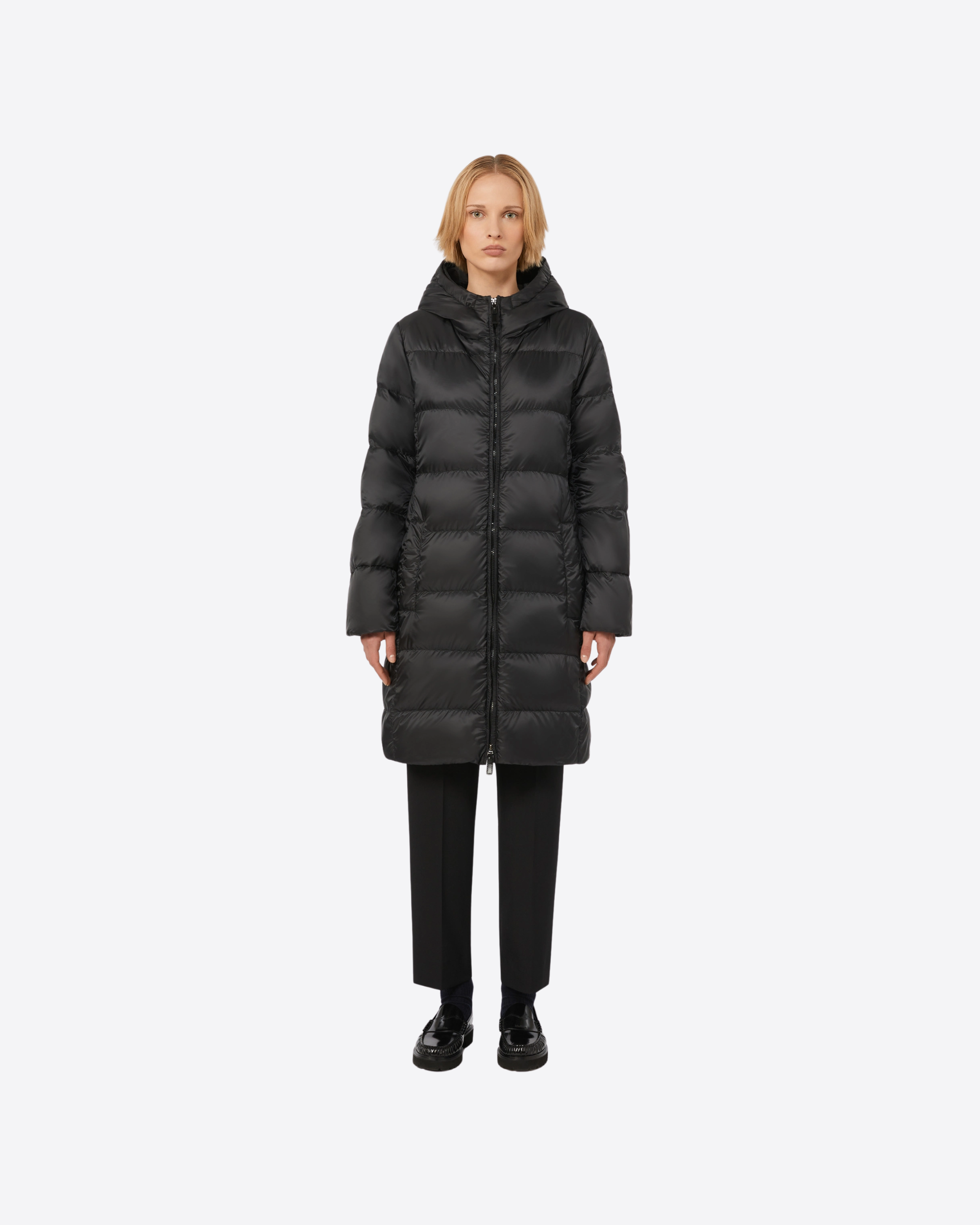 Piumino midi caratterizzato da una silhouette dritta con vita elasticizzata sul retro.