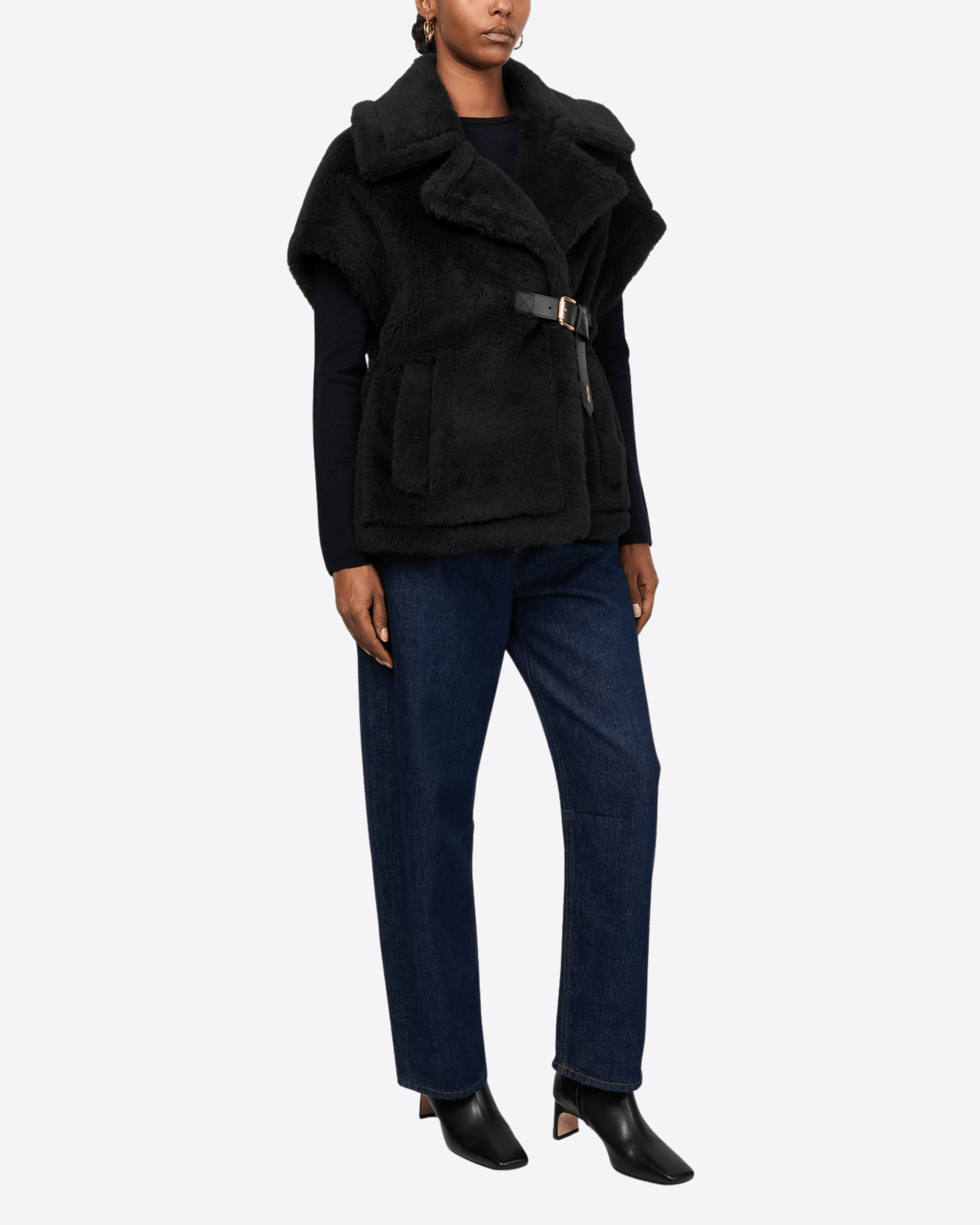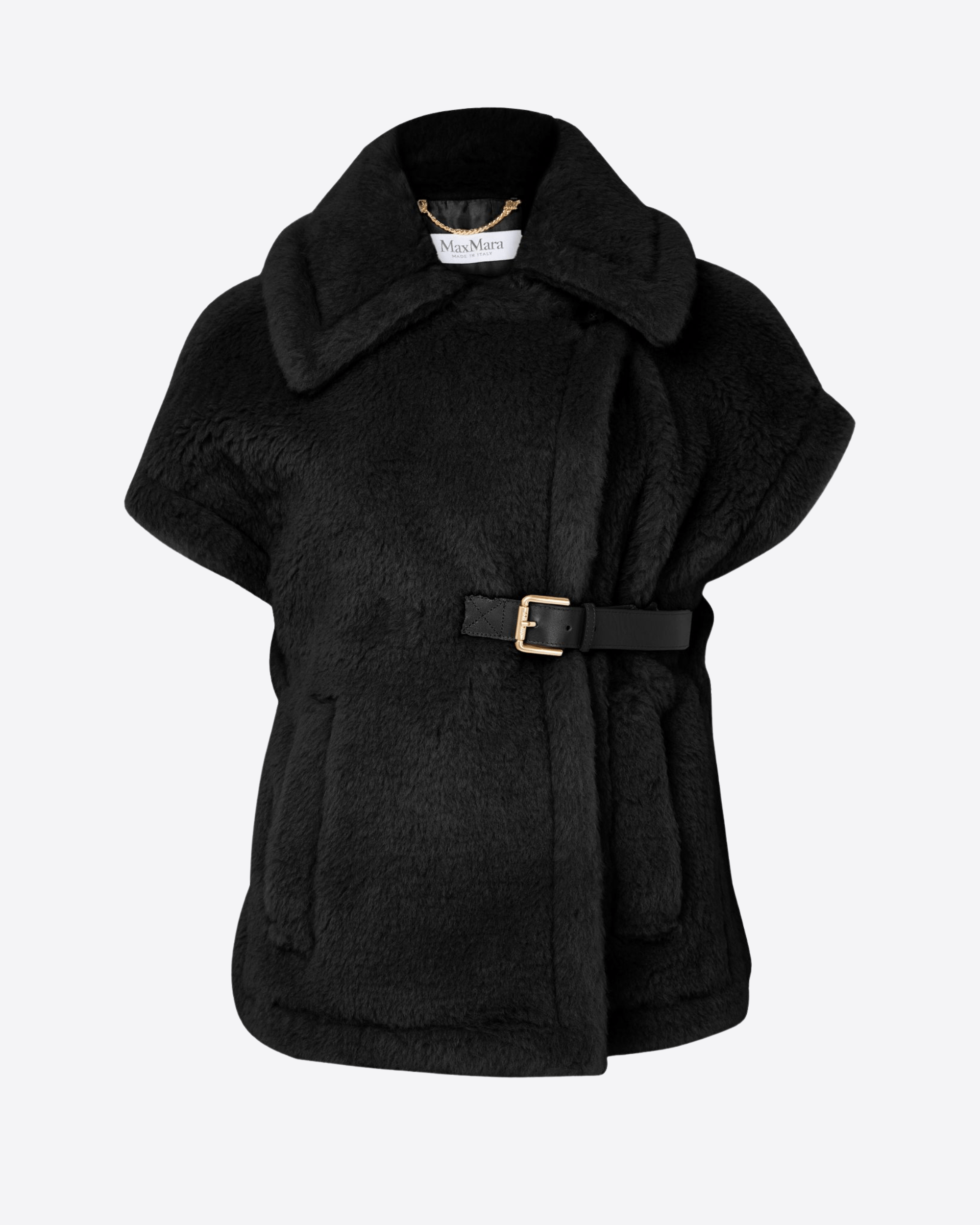 Iconica e sofisticata, la cappa Max Mara Newabavo è realizzata nell’inconfondibile tessuto Teddy colore nero su base seta, simbolo di lusso e morbidezza. Il design avvolgente è caratterizzato da un ampio scollo a rever che si posa delicatamente sulle spalle, esaltando la linea fluida del capo.
