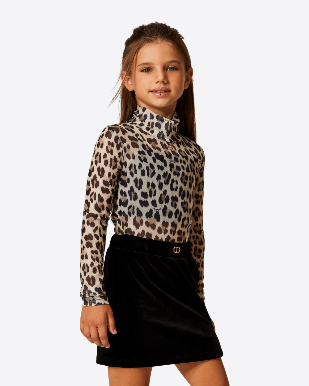 Top Made of animal-print tulle with a turtleneck, long sleeves, a metal Oval T logo on the front, and a straight fit. It pairs with a cotton jersey cropped top with thin shoulder straps.