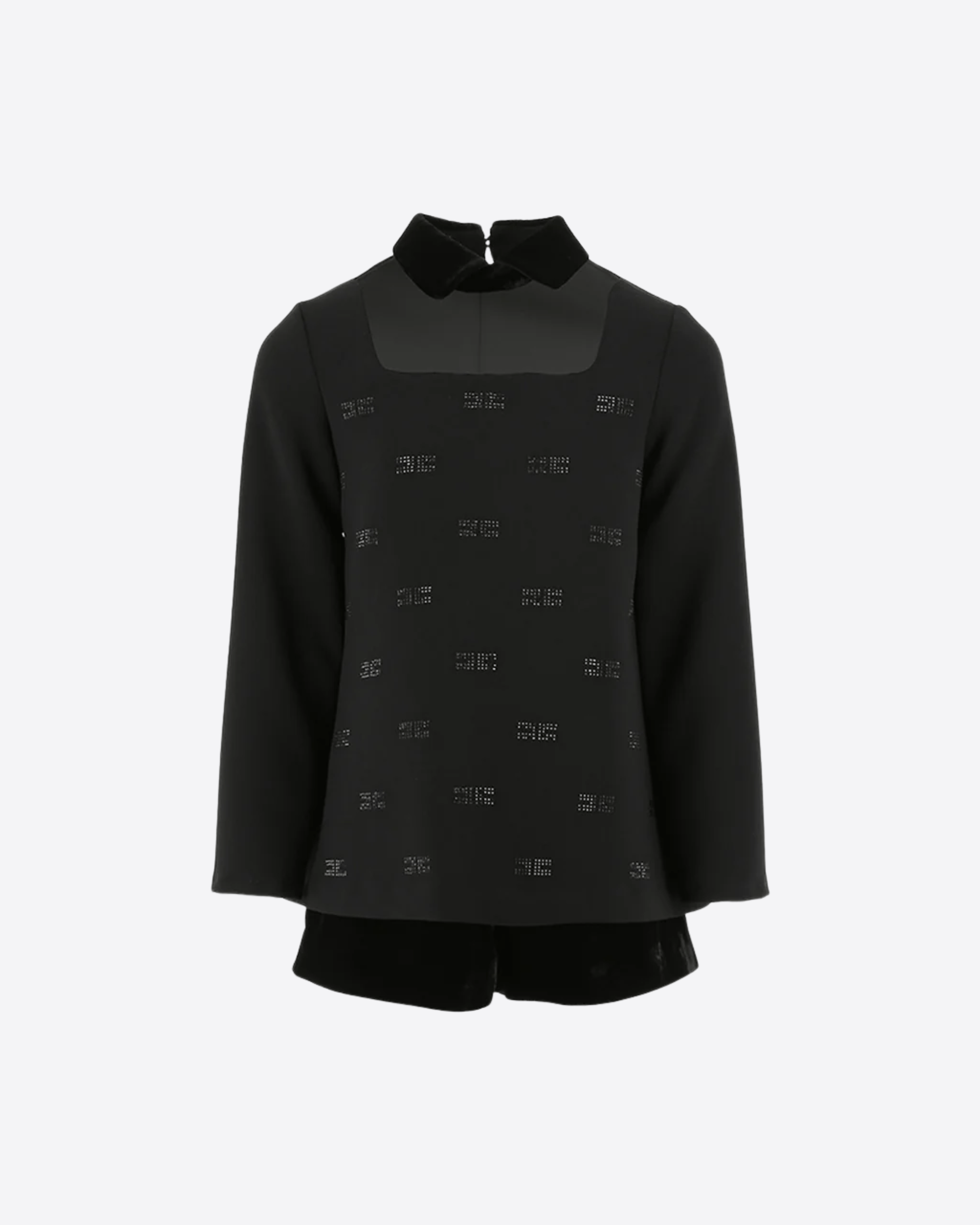 Elegante tuta nera per bambina firmata Elisabetta Franchi La Mia Bambina, caratterizzata da un raffinato colletto in velluto e dal logo con strass luccicanti che aggiunge un tocco di glamour. A maniche lunghe, perfetta per occasioni speciali o momenti in cui la tua piccola vuole distinguersi con stile e raffinatezza.