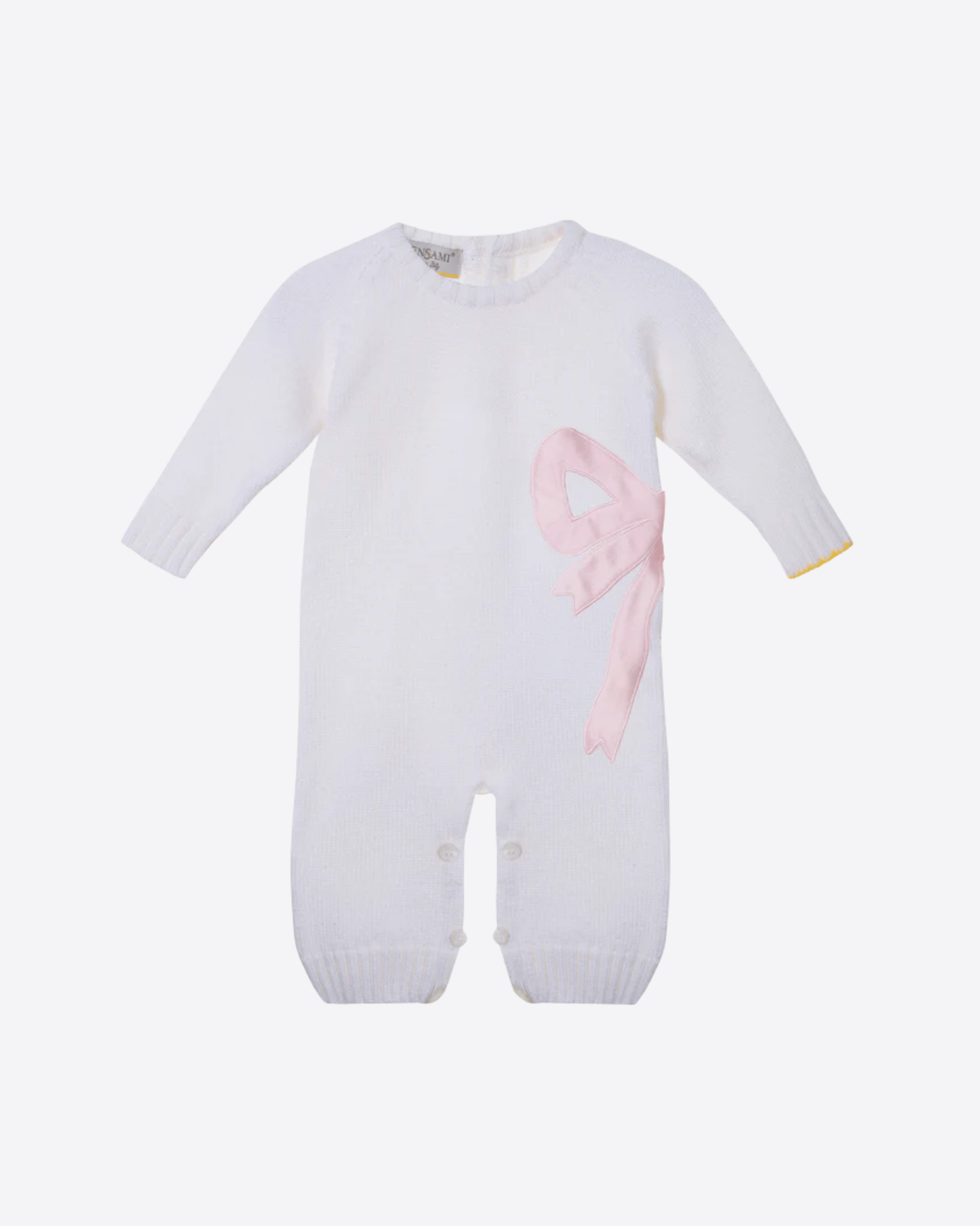 Pensata per i momenti più preziosi, questa tutina con scollo a U unisce raffinatezza e praticità. Il morbido lavoro a maglia accarezza la pelle del neonato assicurando comfort e traspirabilità in ogni stagione. Il maxi fiocco in raso applicato sul lato è il dettaglio che illumina il design, donando un tocco elegante e romantico. Le chiusure con bottoni in madreperla sul retro e al cavallo facilitano la vestizione e il cambio. La Linea Gialla sul polsino sinistro è la firma stilistica del marchio, che ricorda un raggio di sole e il ruolo che i bambini hanno nelle nostre vite. Un capo speciale, perfetto come dono di nascita.