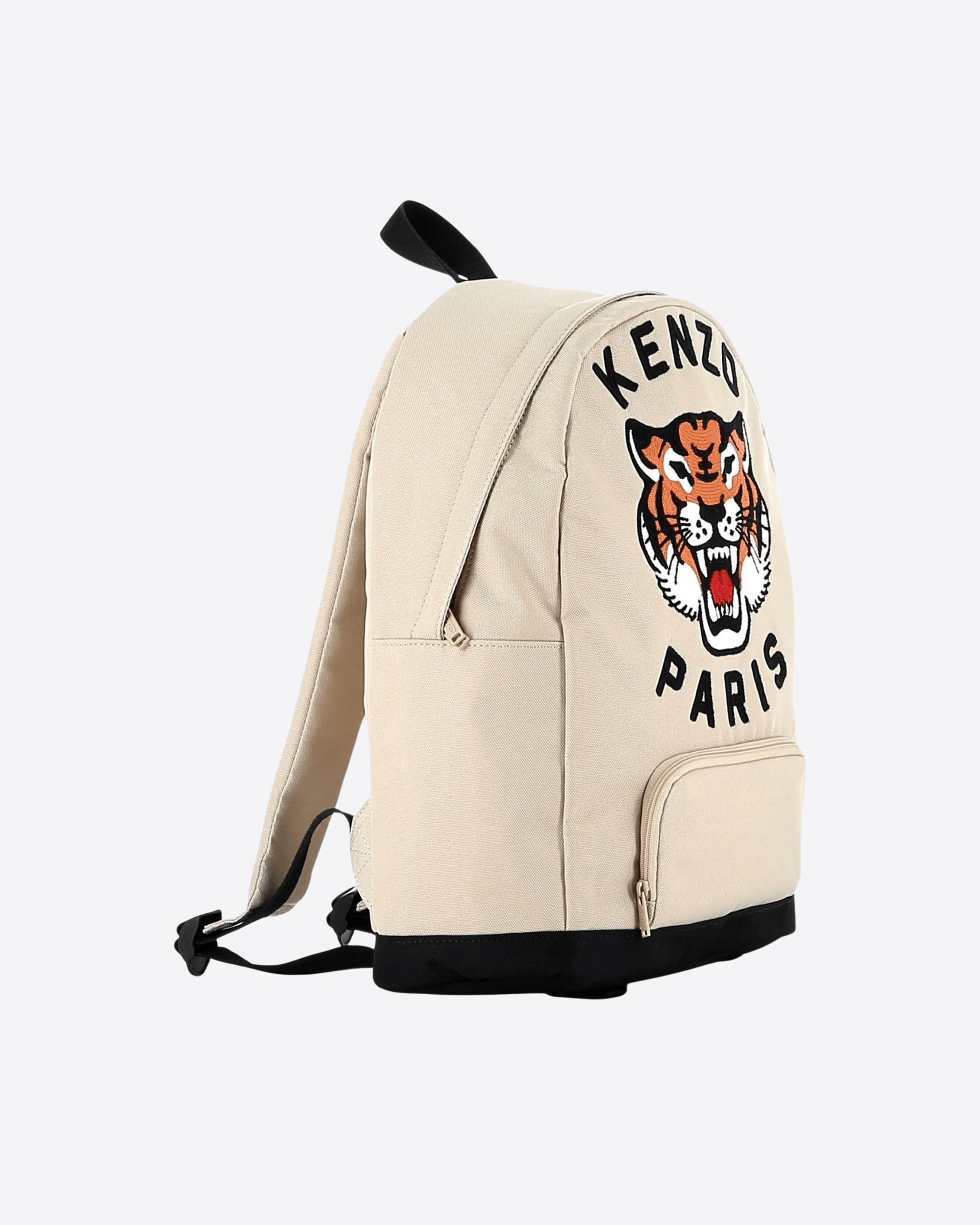 Zaino beige caratterizzato dal distintivo motivo tigre, simbolo iconico dello stile Kenzo. Realizzato con materiali resistenti, presenta una pratica chiusura con zip, un manico superiore per un facile trasporto e spallacci regolabili che garantiscono comfort e adattabilità. Perfetto per accompagnare i più piccoli nelle attività quotidiane con un tocco di originalità e stile.