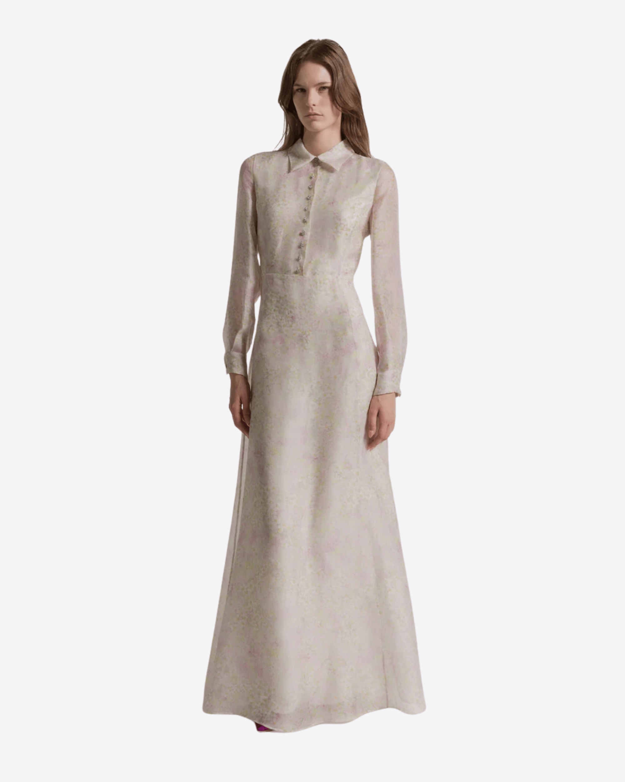 Il design con colletto a camicia dona struttura al capo, mentre i bottoni gioiello aggiungono un prezioso dettaglio luminoso. Il corpo e la gonna foderati garantiscono comfort e vestibilità, mantenendo la leggerezza e la trasparenza tipiche dell’organza.