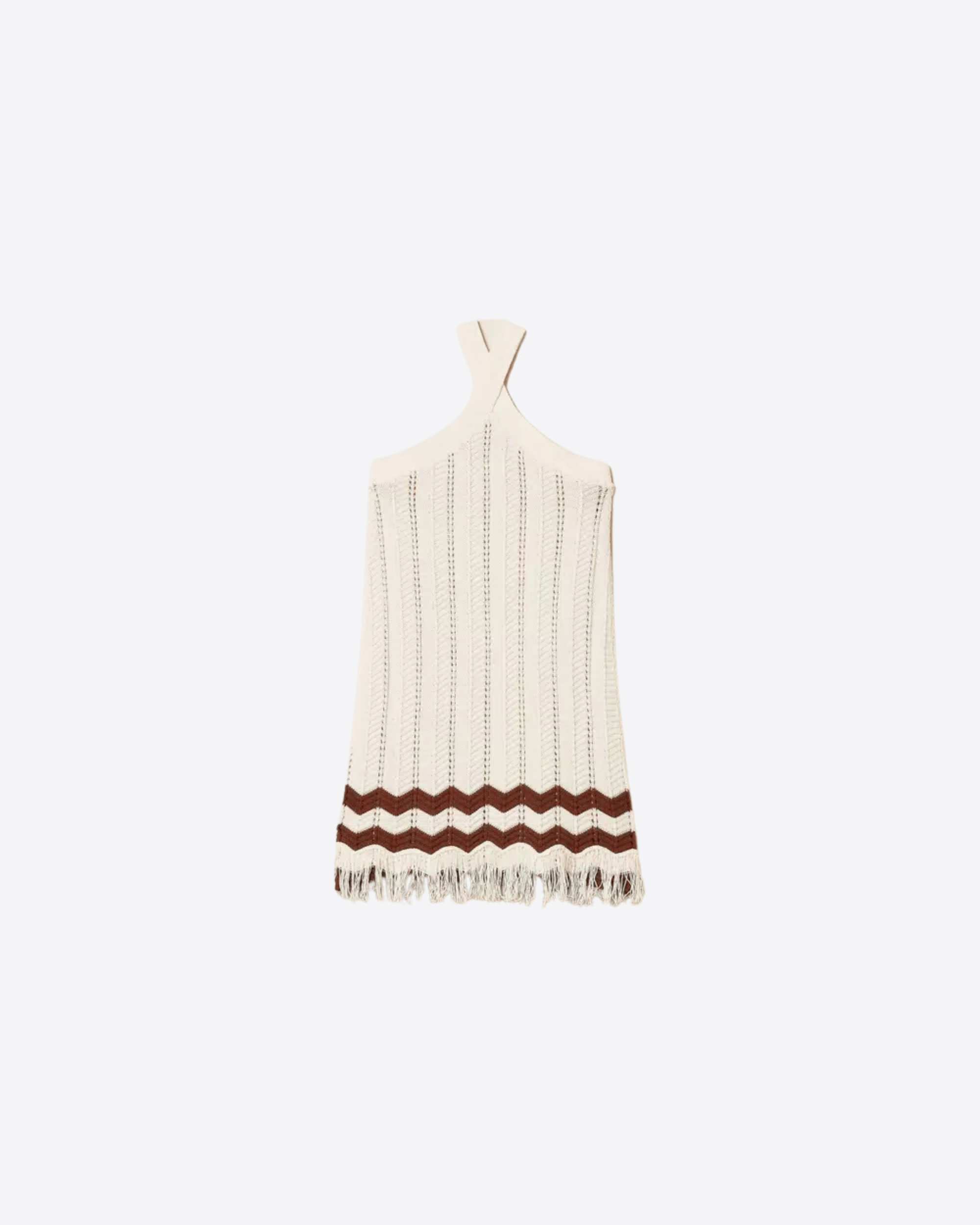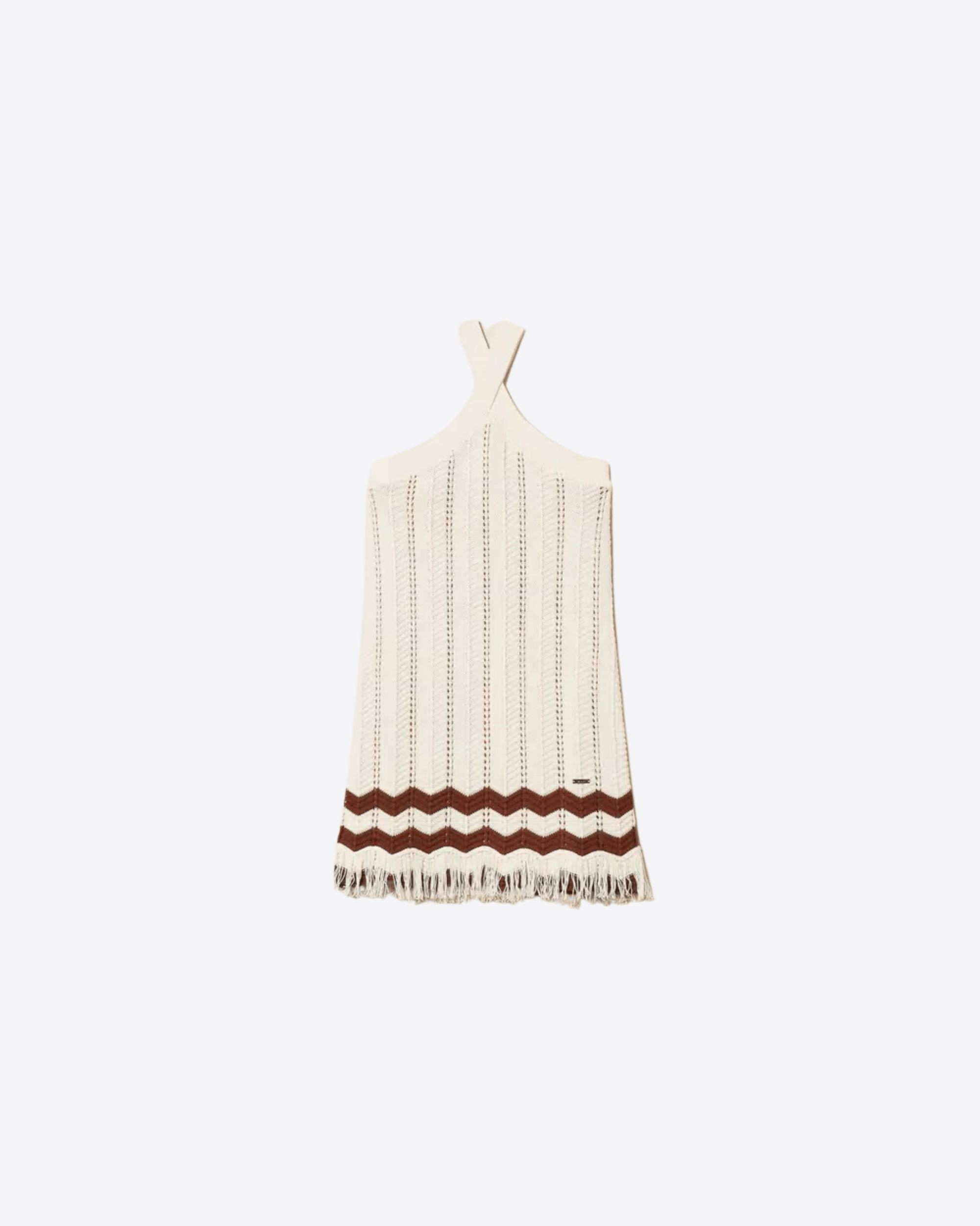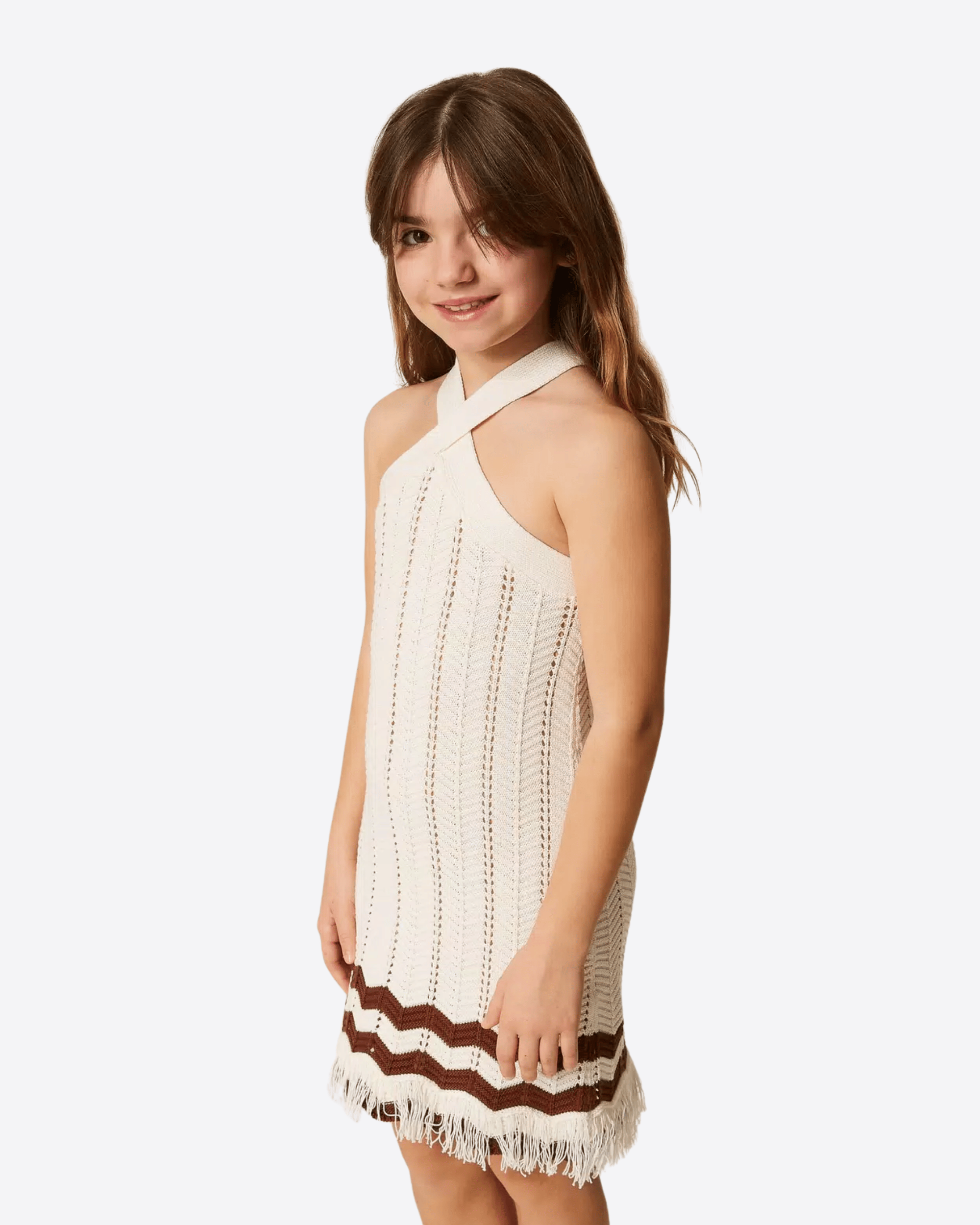 Abito corto da bambina in maglia di puro cotone, morbido e traspirante, ideale per garantire comfort durante tutta la giornata. Il capo si distingue per il motivo a coste punzonate, che dona texture e carattere, e per il disegno a zig-zag al fondo arricchito da frange, dettaglio originale che aggiunge movimento e stile.