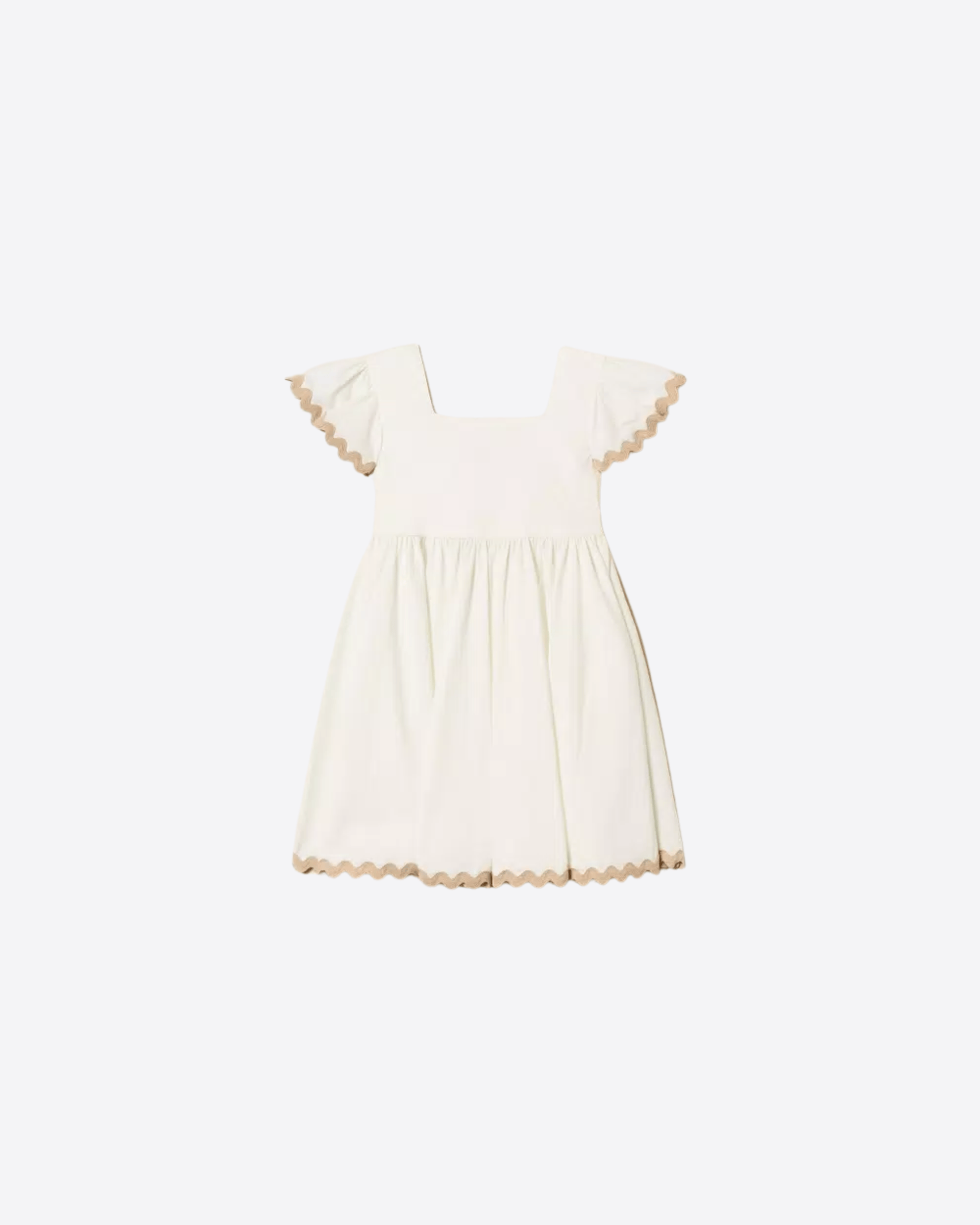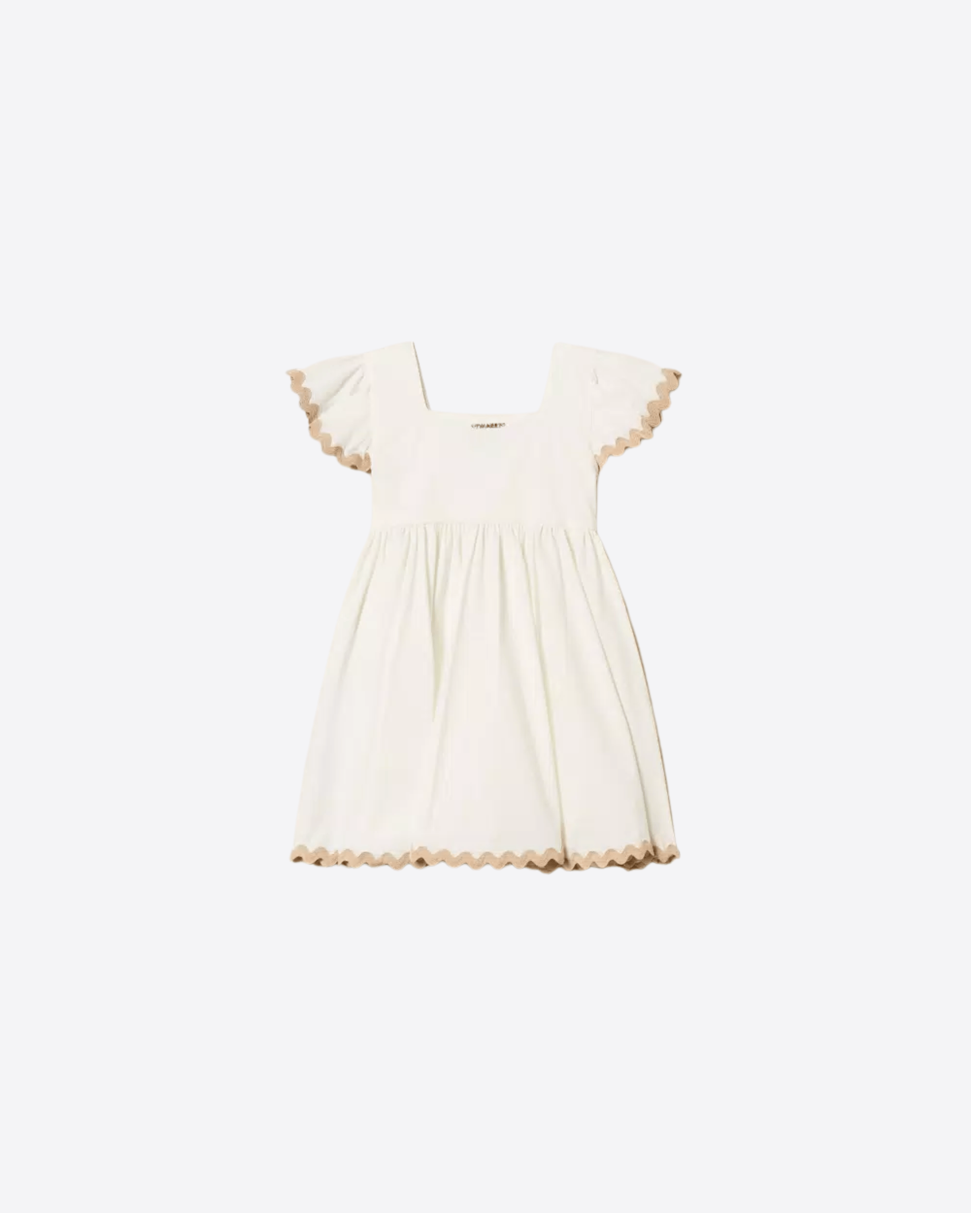 Il collo squadrato dona un aspetto moderno e raffinato, mentre le maniche corte ad aletta aggiungono leggerezza e femminilità. Il taglio impero con arricciatura valorizza la vestibilità, creando volume e movimento, mentre la linea svasata assicura comfort e libertà nei movimenti.