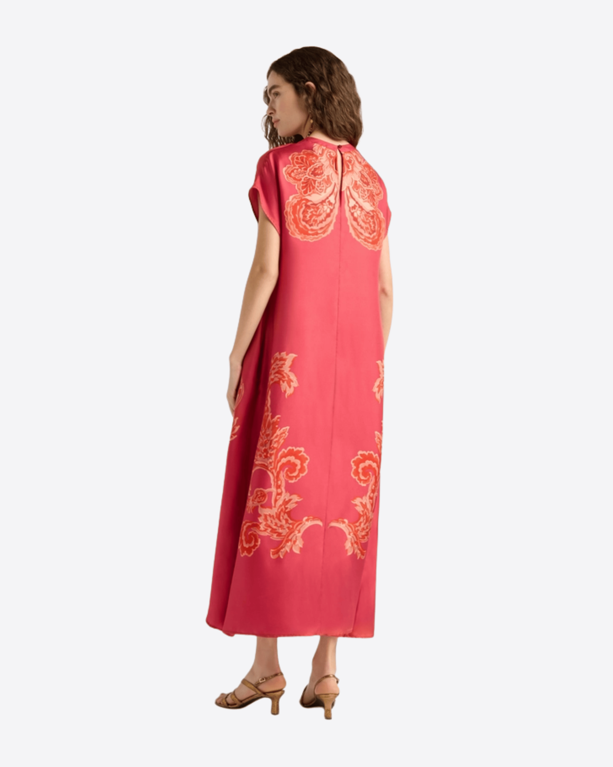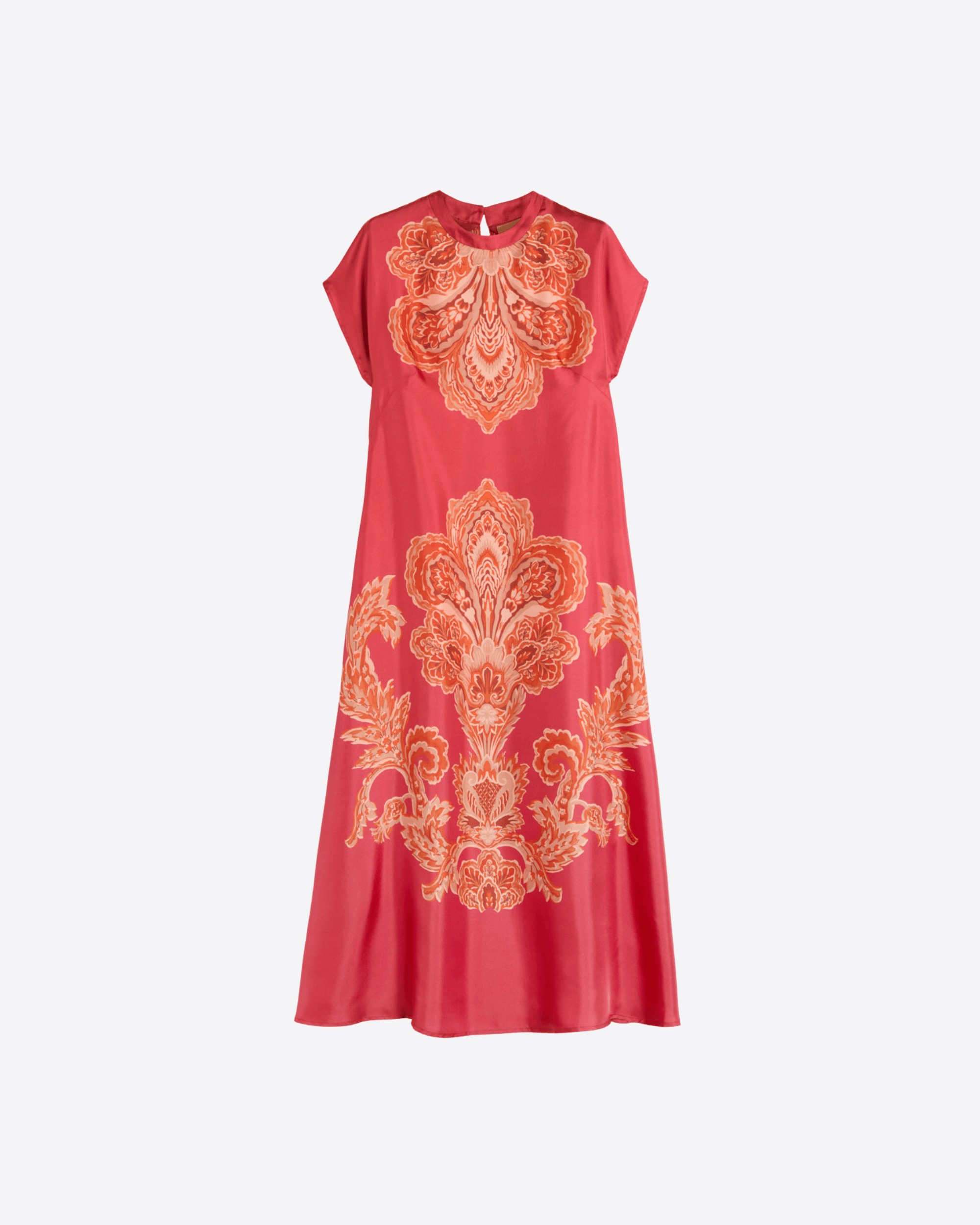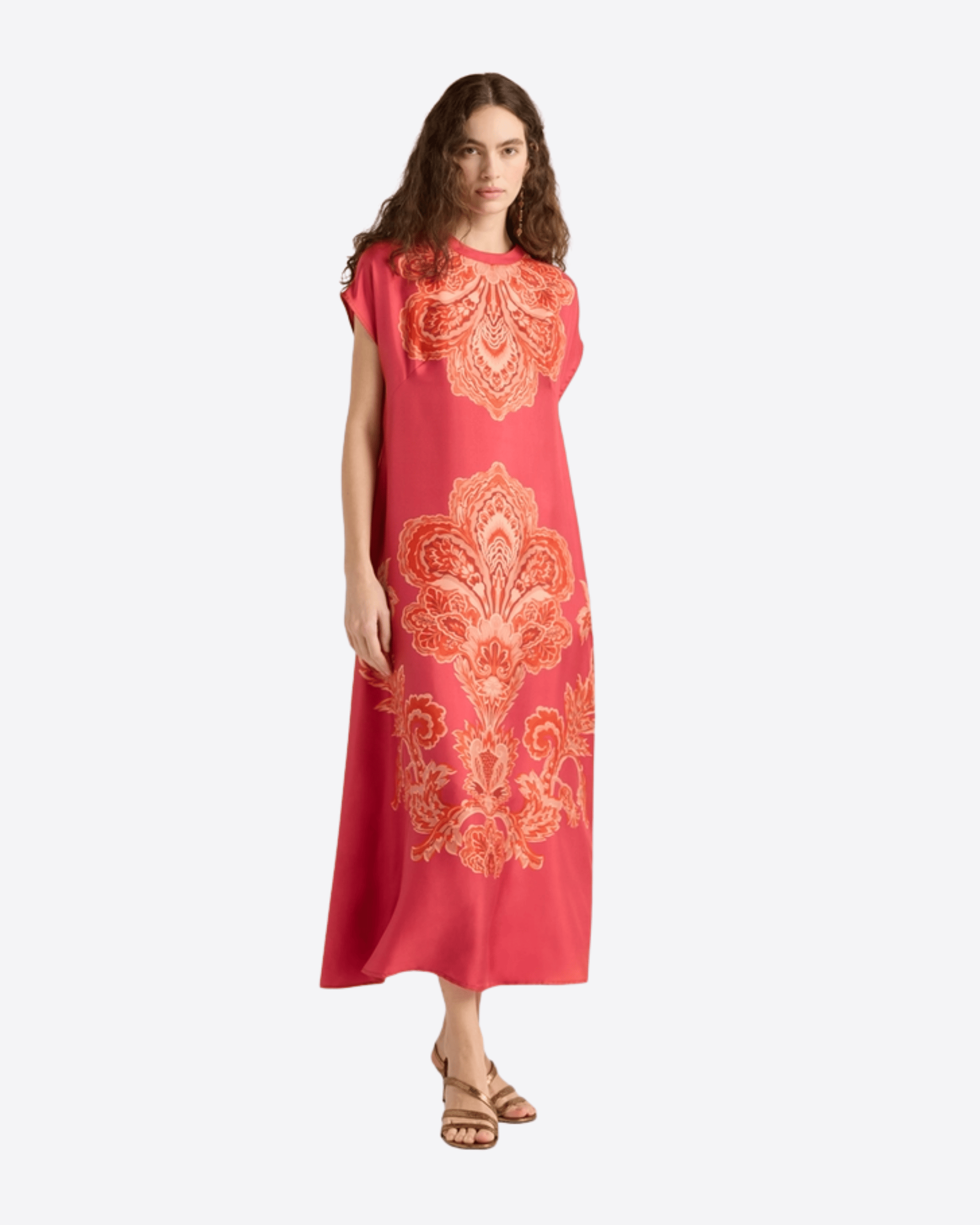 Abito a tunica over con girocollo e maniche corte a kimono, realizzato in twill di seta stampata in Italia. Il volume ampio valorizza l’esclusivo motivo ramage, ispirato ai paesaggi e ai colori del New Mexico, per un look elegante e contemporaneo.