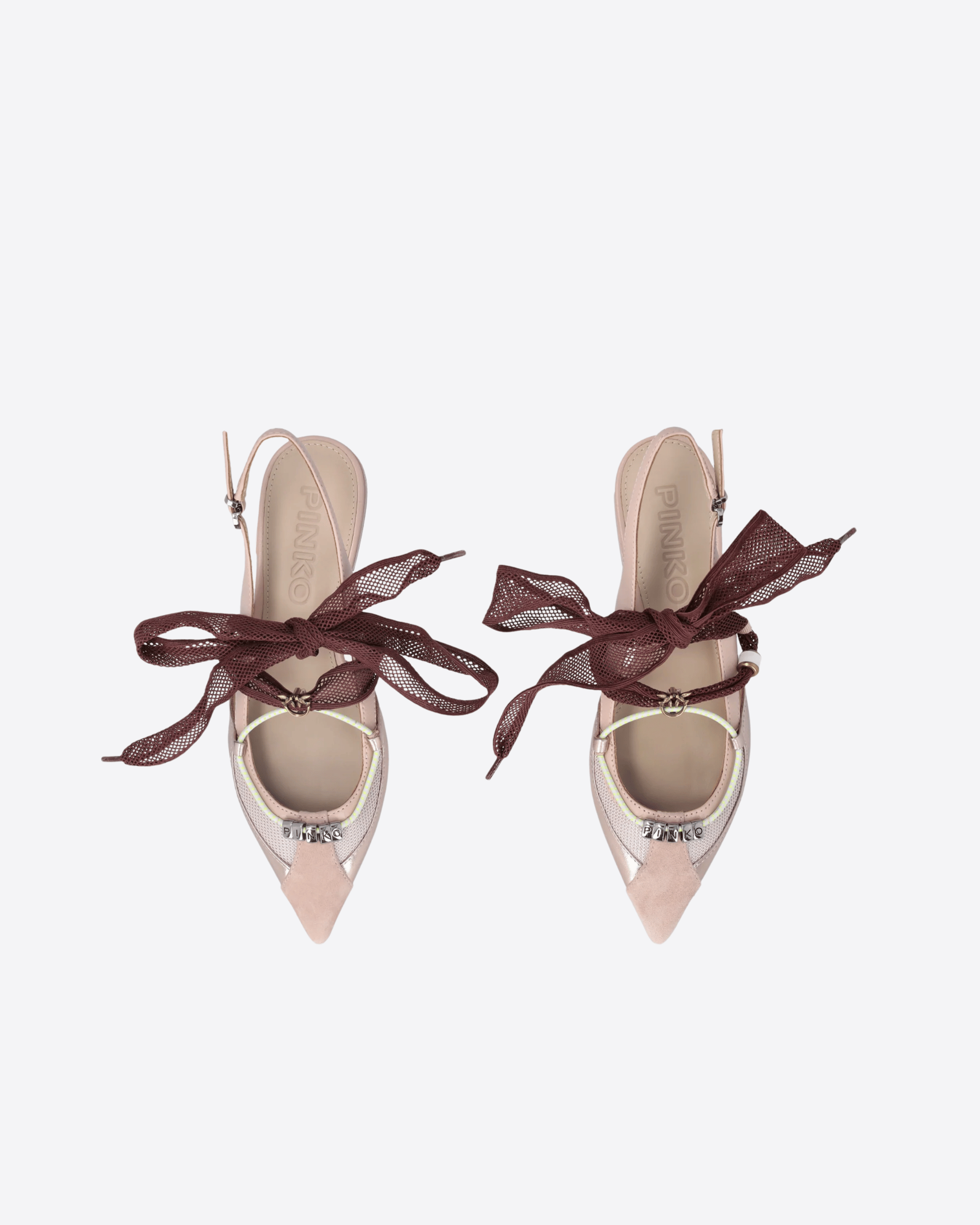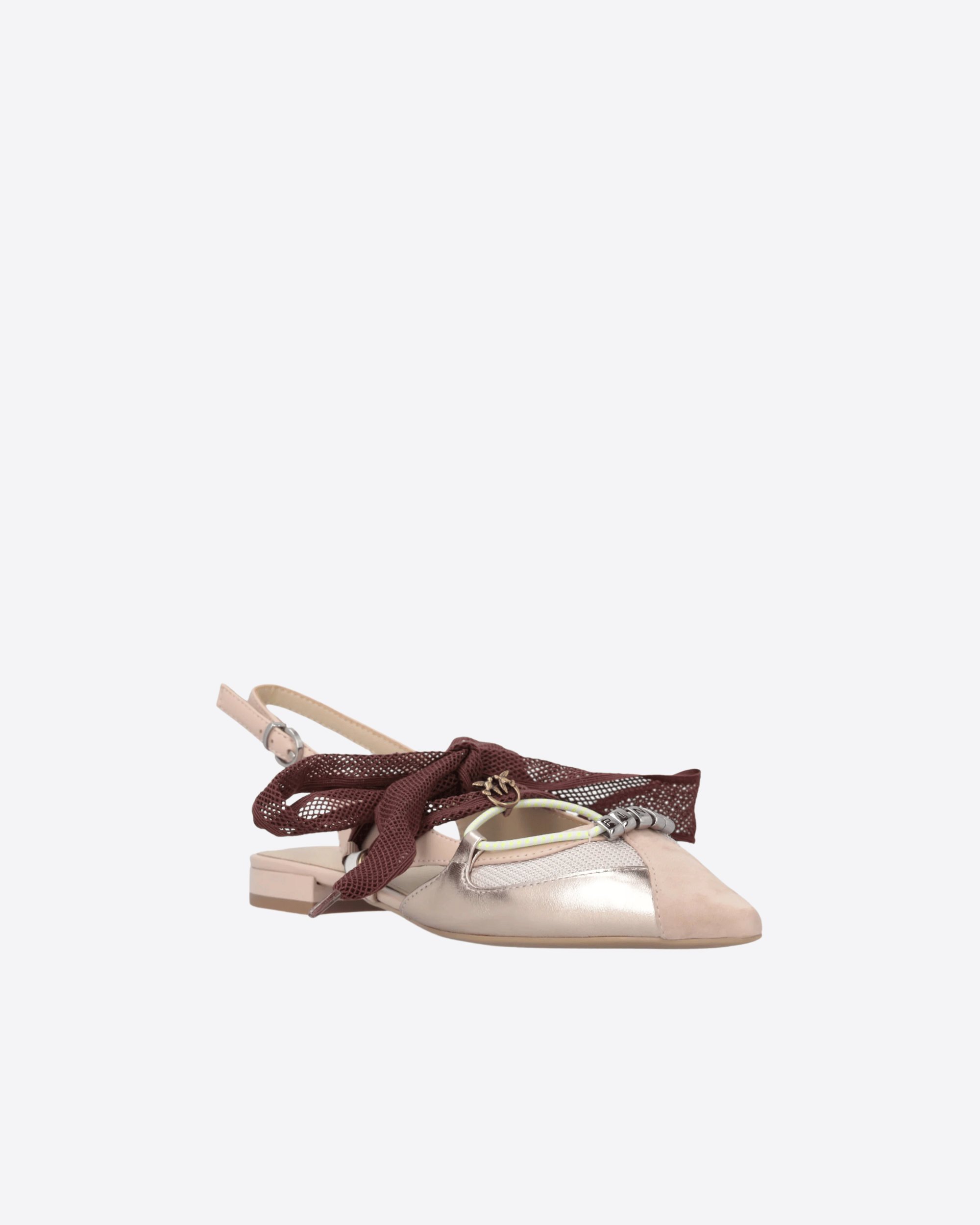 Questa primavera dona al tuo guardaroba un tocco di sofisticata femminilità con queste slingback flat in morbida nappa liscia, arricchite da punta in suede e inserti in mesh. I lacci da annodare a fiocco, anch’essi in mesh, sono impreziositi da un charm e da un’applicazione metallica con logo Love Birds, mentre il cordino inferiore con sottili dettagli grafici è completato da anelli metallici che formano l’iconico lettering PINKO. La silhouette affusolata con punta sfilata slancia la figura, mentre la suola flat garantisce leggerezza e comfort per un utilizzo quotidiano senza rinunciare allo stile. Perfette per look da giorno e da sera, queste ballerine aggiungono un accento distintivo e raffinato a ogni outfit.