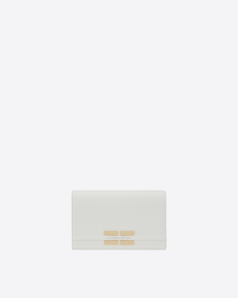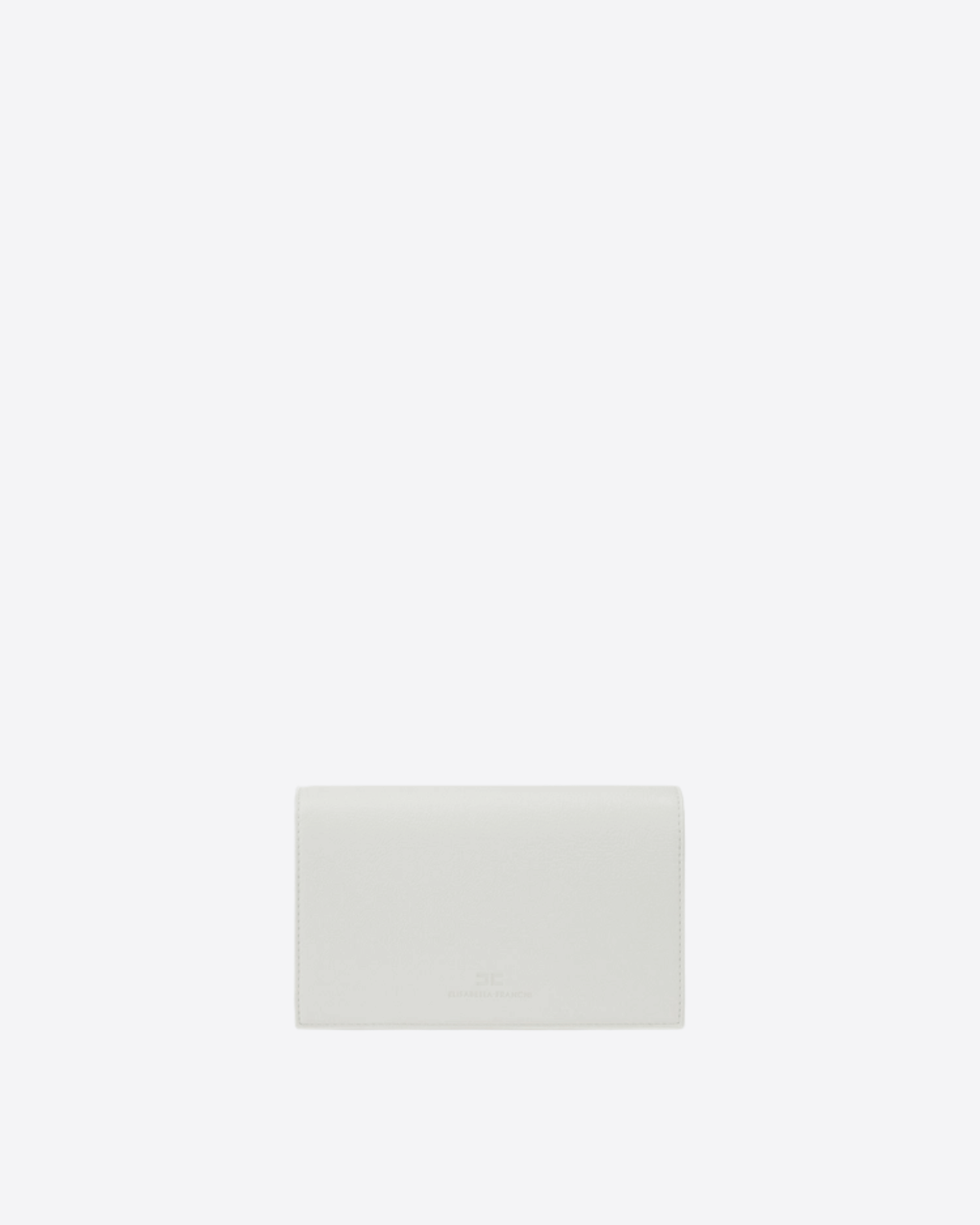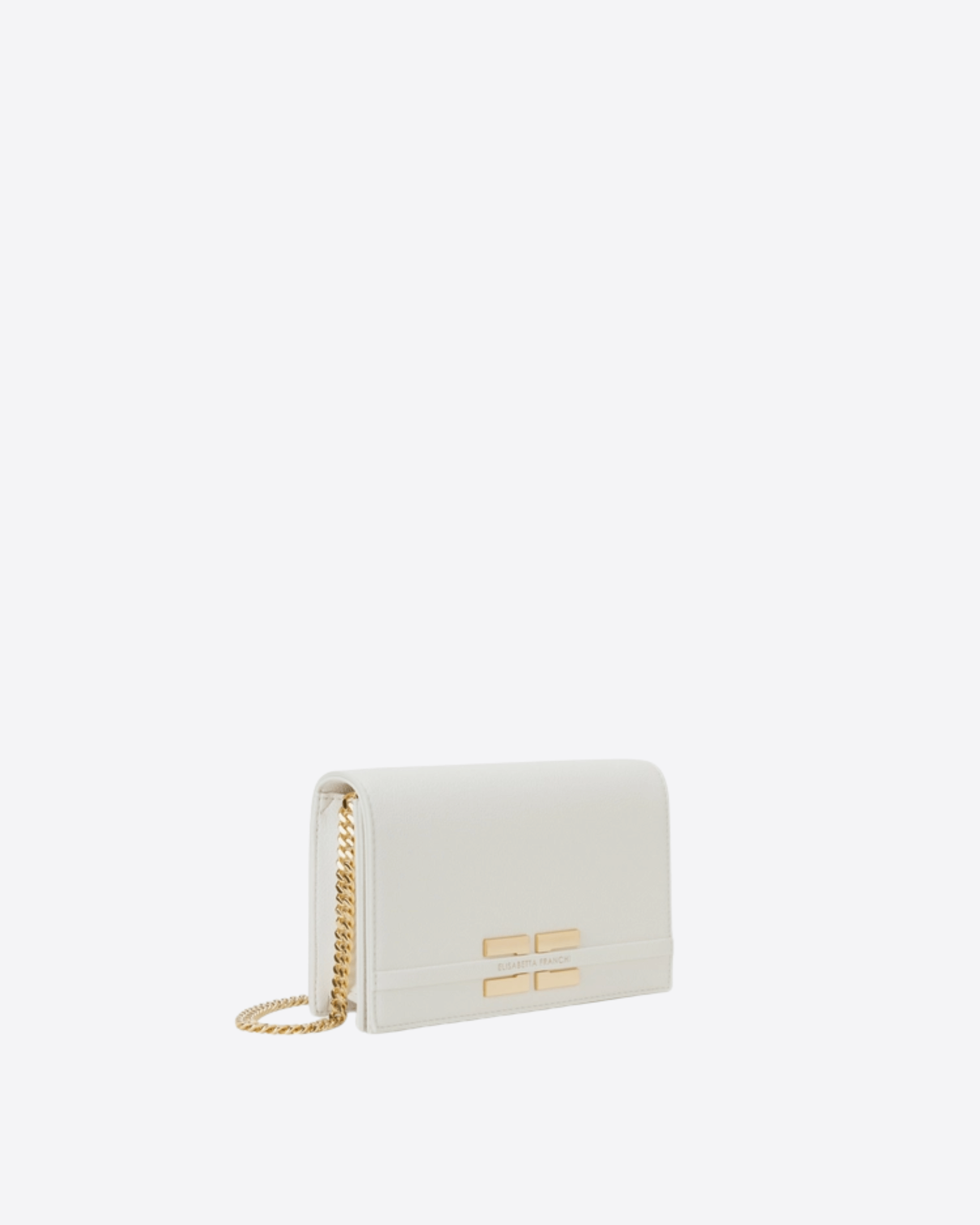 Borsa realizzata in materiale sintetico con texture effetto pelle, caratterizzata da una shape compatta e lineare. Il modello è dotato di tracolla in catena groumette con spallaccio ed è impreziosito dalla placca con logo applicata sul davanti, per un look essenziale e contemporaneo.