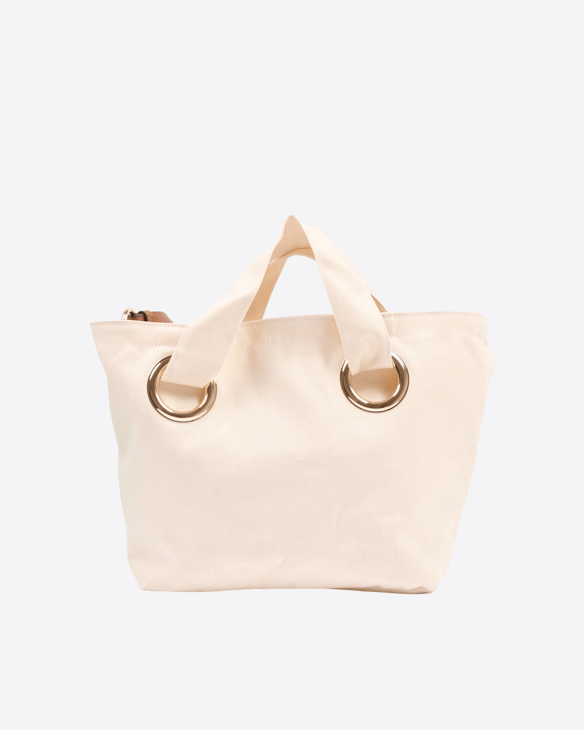 Borsa color avorio realizzata in cotone organico, pensata per unire praticità e stile. Dotata di manici superiori, chiusura con bottone magnetico e tracolla in pelle per una portabilità versatile. Il design è completato da tasche frontali funzionali, dettaglio con anello in metallo e logo ricamato sulla parte anteriore, per un tocco distintivo e raffinato. Dimensioni: 38 cm x 24 cm x 12 cm