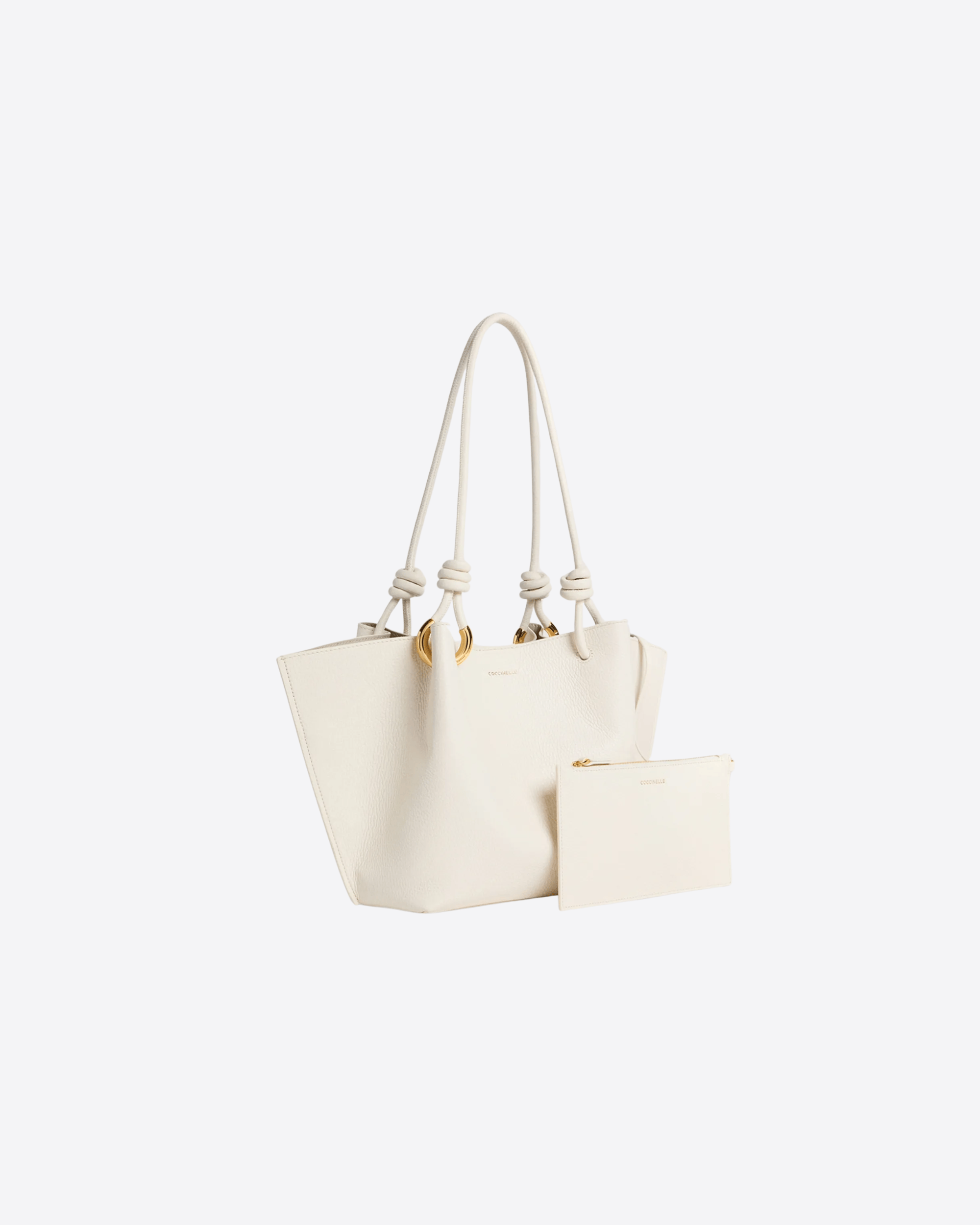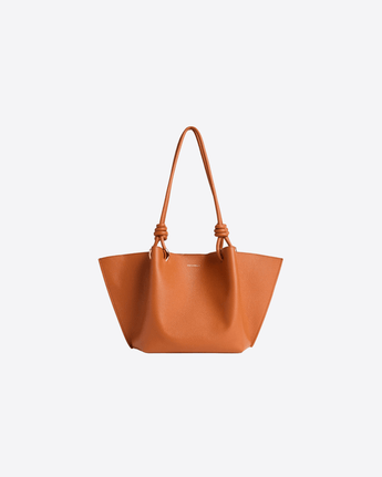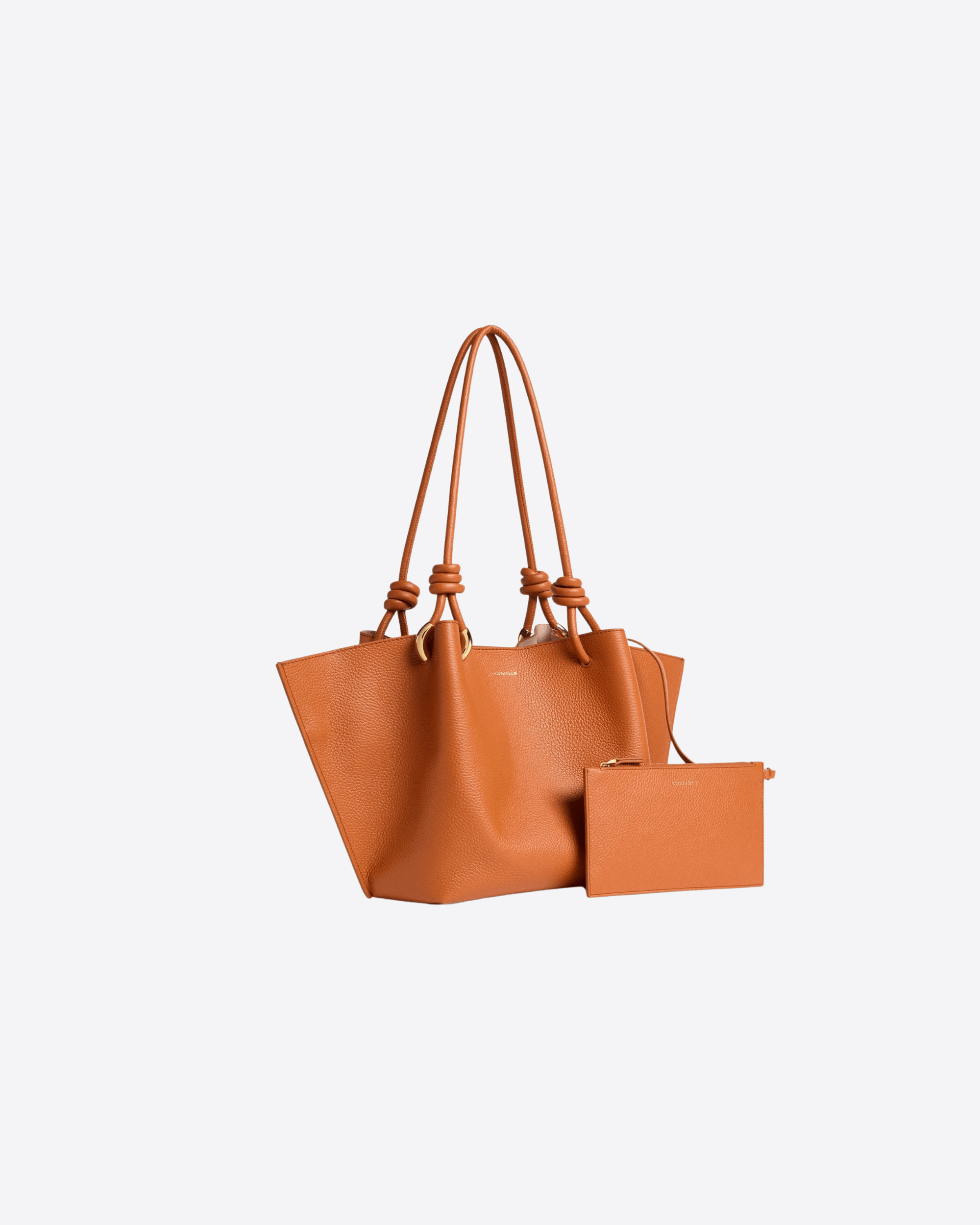 L’incontro tra pelle e metallo crea un equilibrio armonioso, mentre i manici tubolari, arricchiti da un raffinato dettaglio tondeggiante in metallo, si annodano e si inseriscono nei quadranti, generando morbide pieghe che valorizzano la forma.