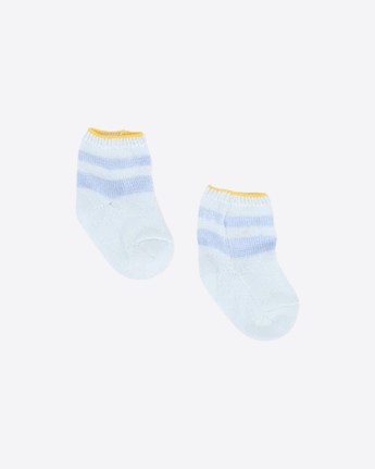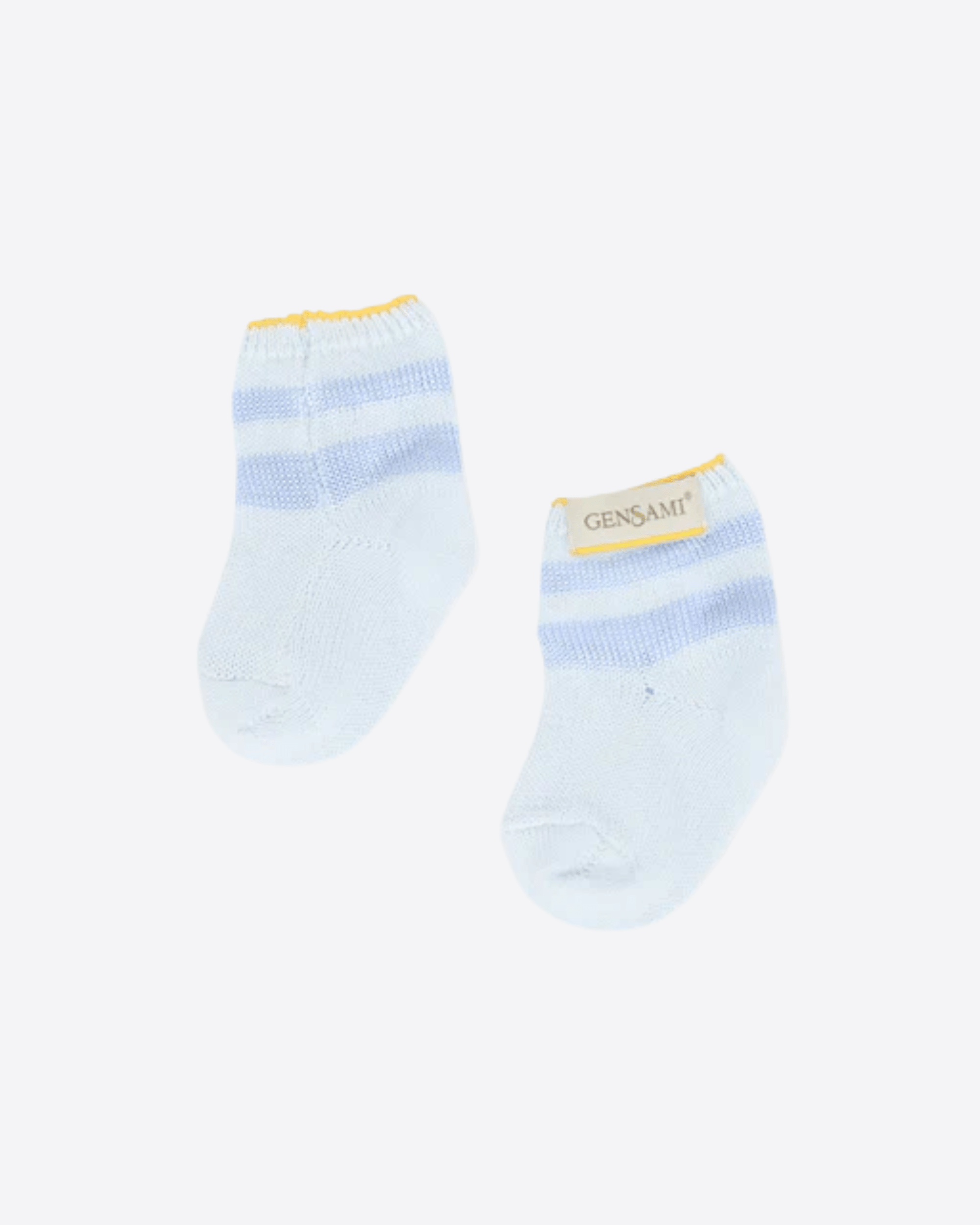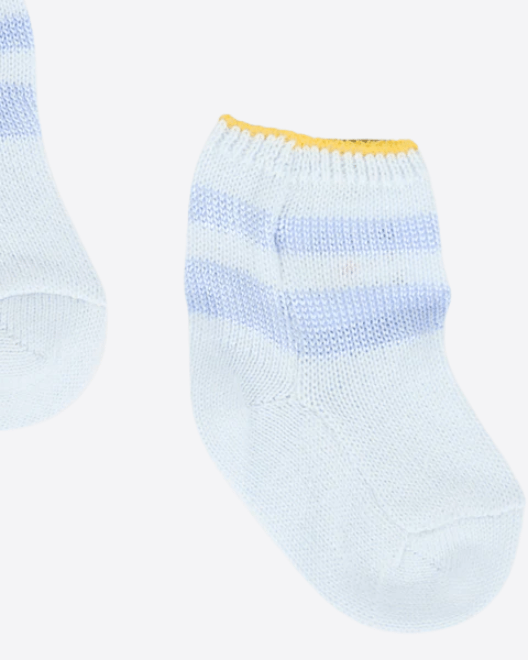 Calzini celesti in misto cotone, con orlo a costine. Sono decorate con patch laterale logato. La Linea Gialla che impreziosisce i capi simboleggia un raggio di sole, il ruolo che i bambini hanno nella nostra vita. Made in Italy