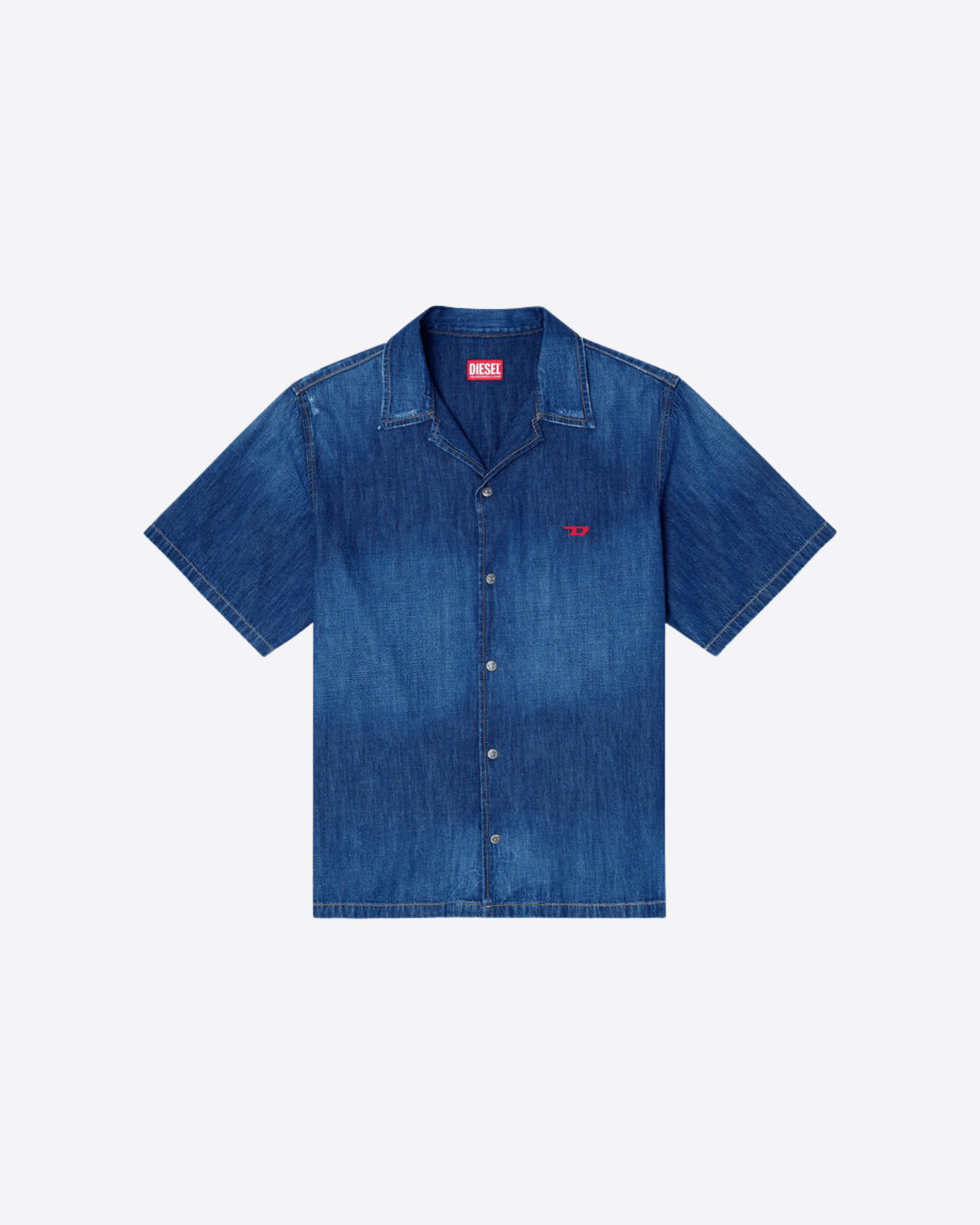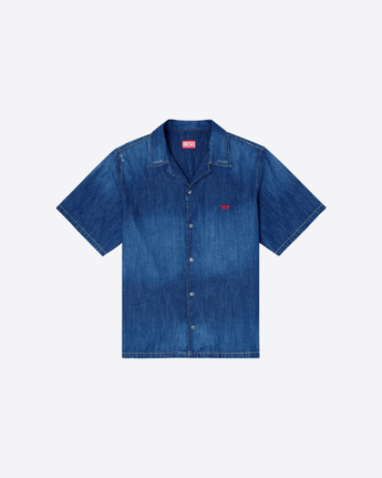 Camicia in denim a maniche corte firmata Diesel con abbottonatura frontale e colletto stile bowling per un look rilassato. Realizzata in denim rigido con caratteristico lavaggio DNA, è prodotta in cotone 100% biologico per una scelta sostenibile. Il logo Diesel a contrasto sul petto completa questo capo essenziale del guardaroba.