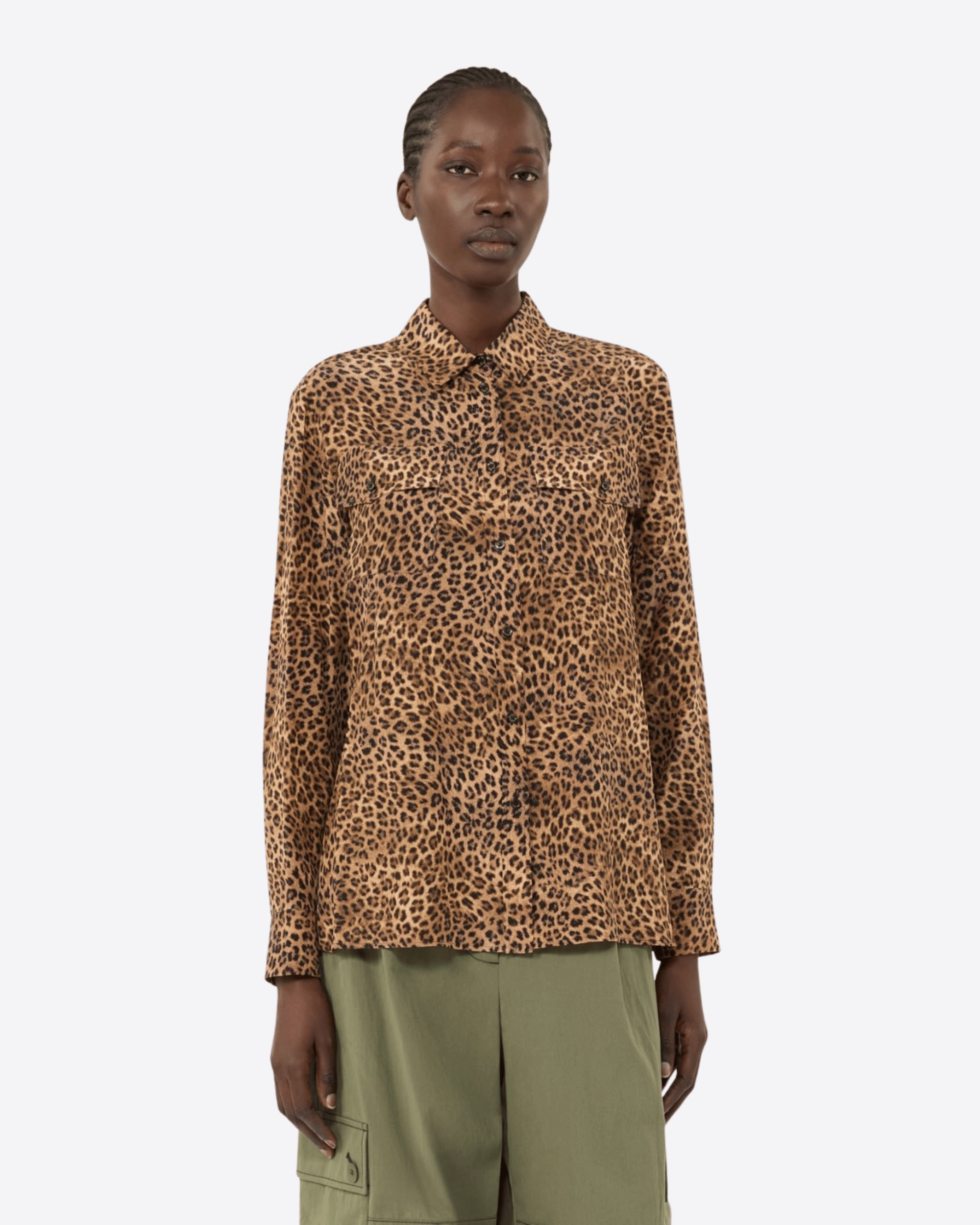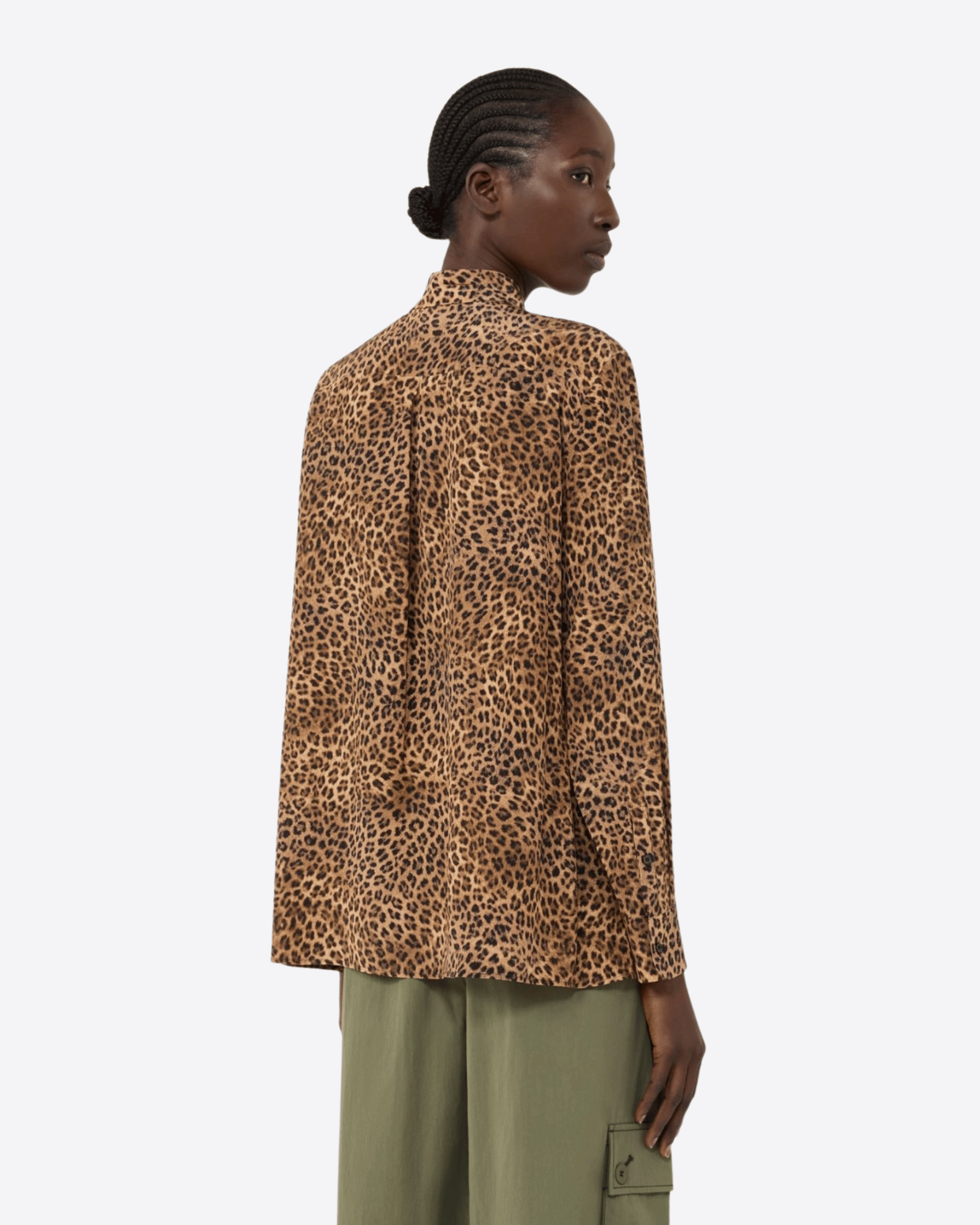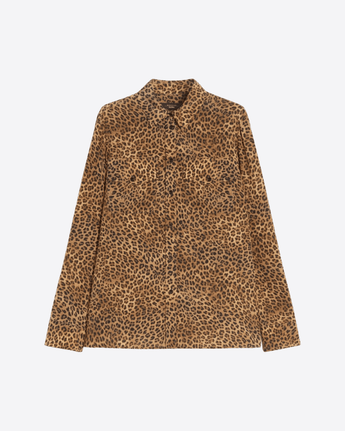 Camicia dalla linea morbida con motivo di collezione stampato all over. Realizzata in crêpe de Chine di pura seta, presenta una linea leggermente svasata e maniche lunghe con polsino e bottone. La chiusura frontale è con bottoni a vista e il taschino sul petto ha patta e bottone. Sul retro è presente uno sprone con piega centrale sulla schiena, mentre il fondo squadrato con spacchi laterali completa il design elegante e leggero della camicia.