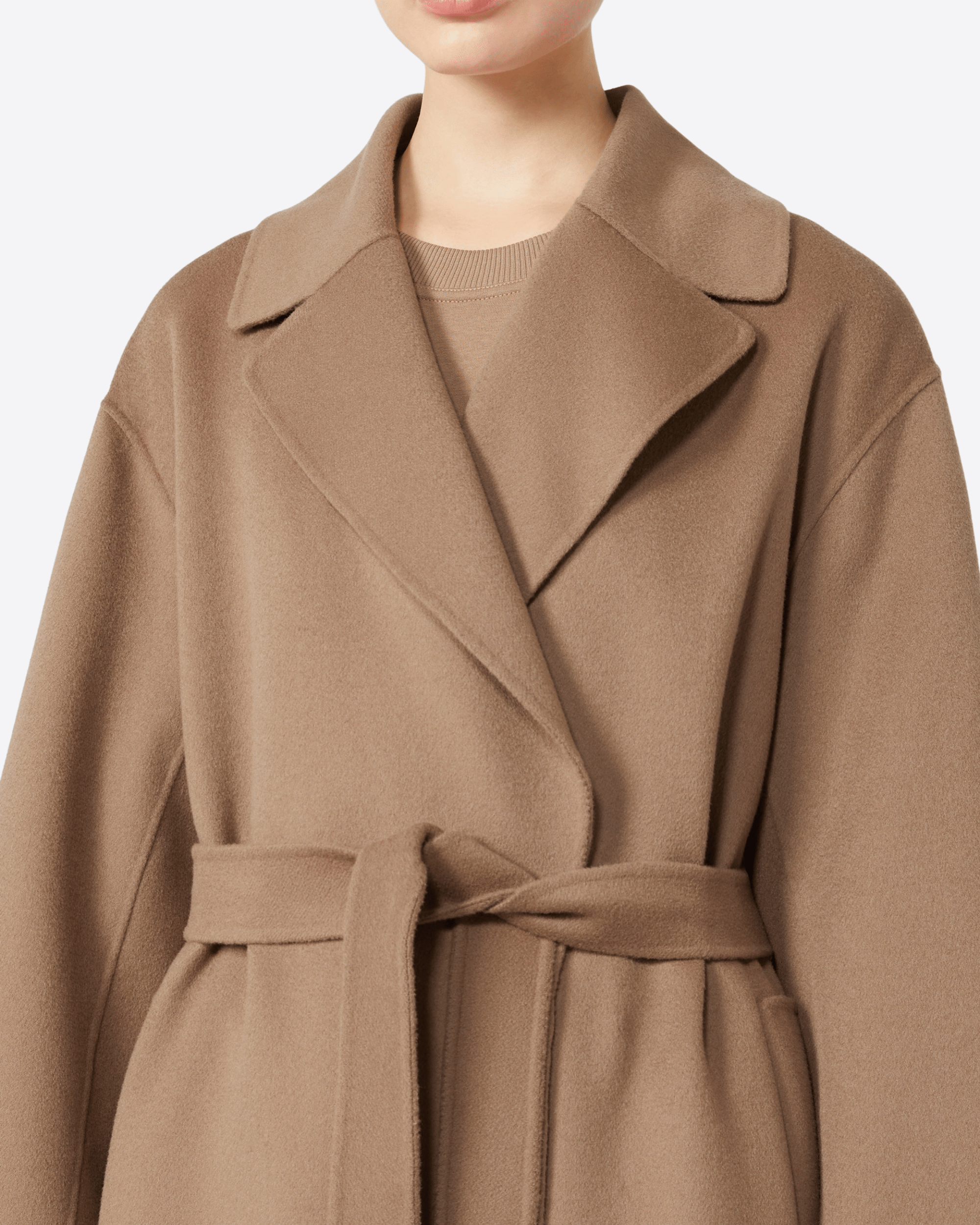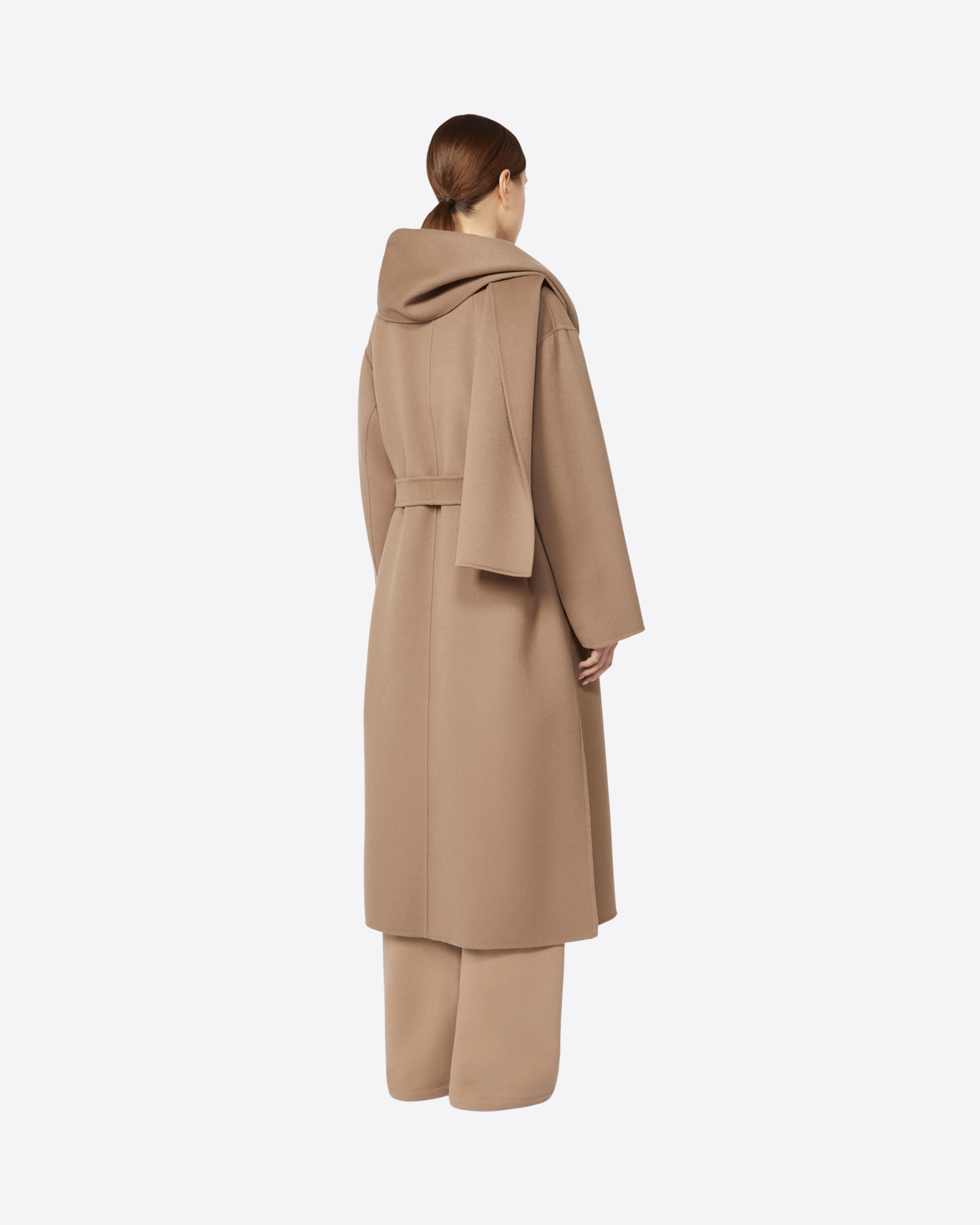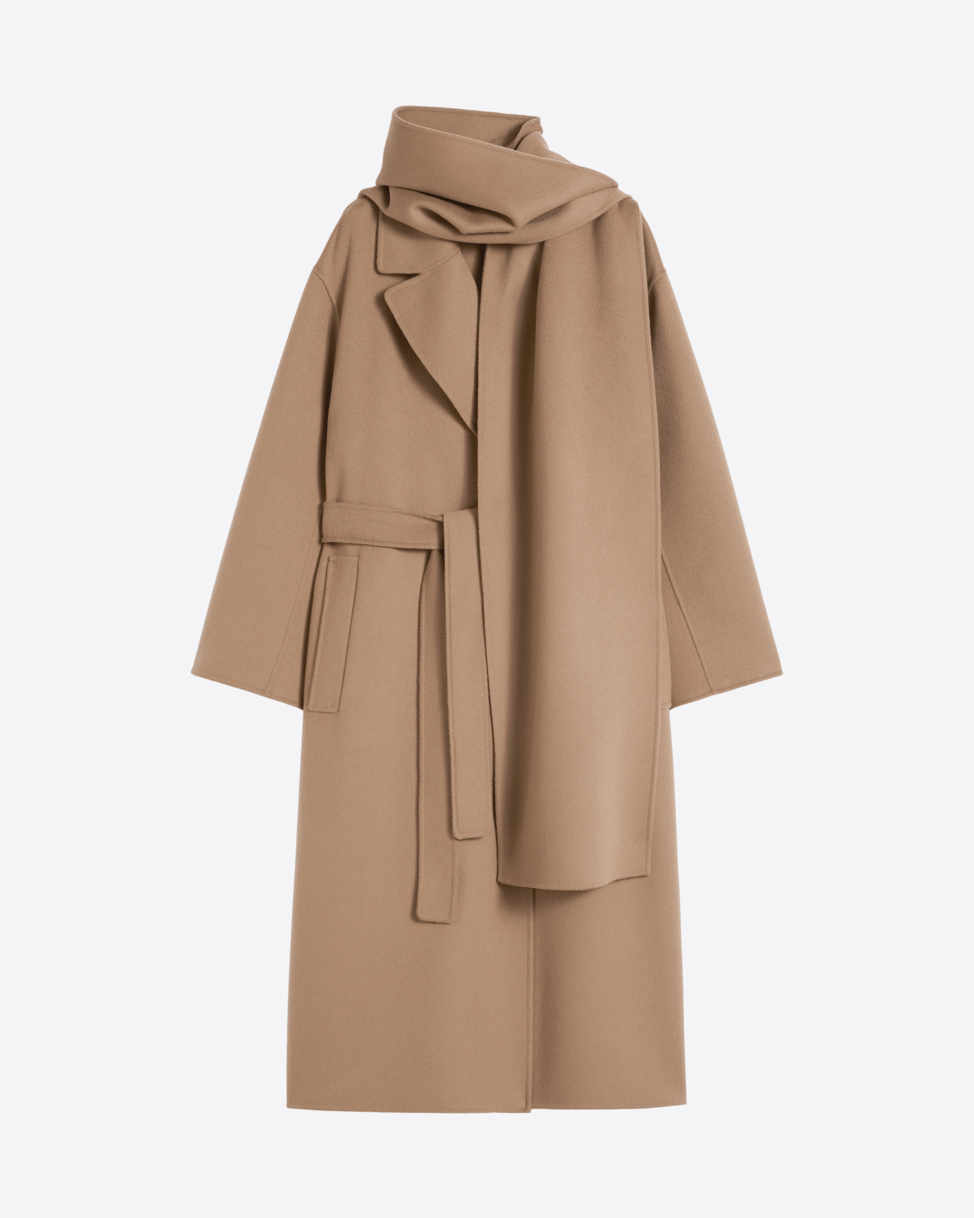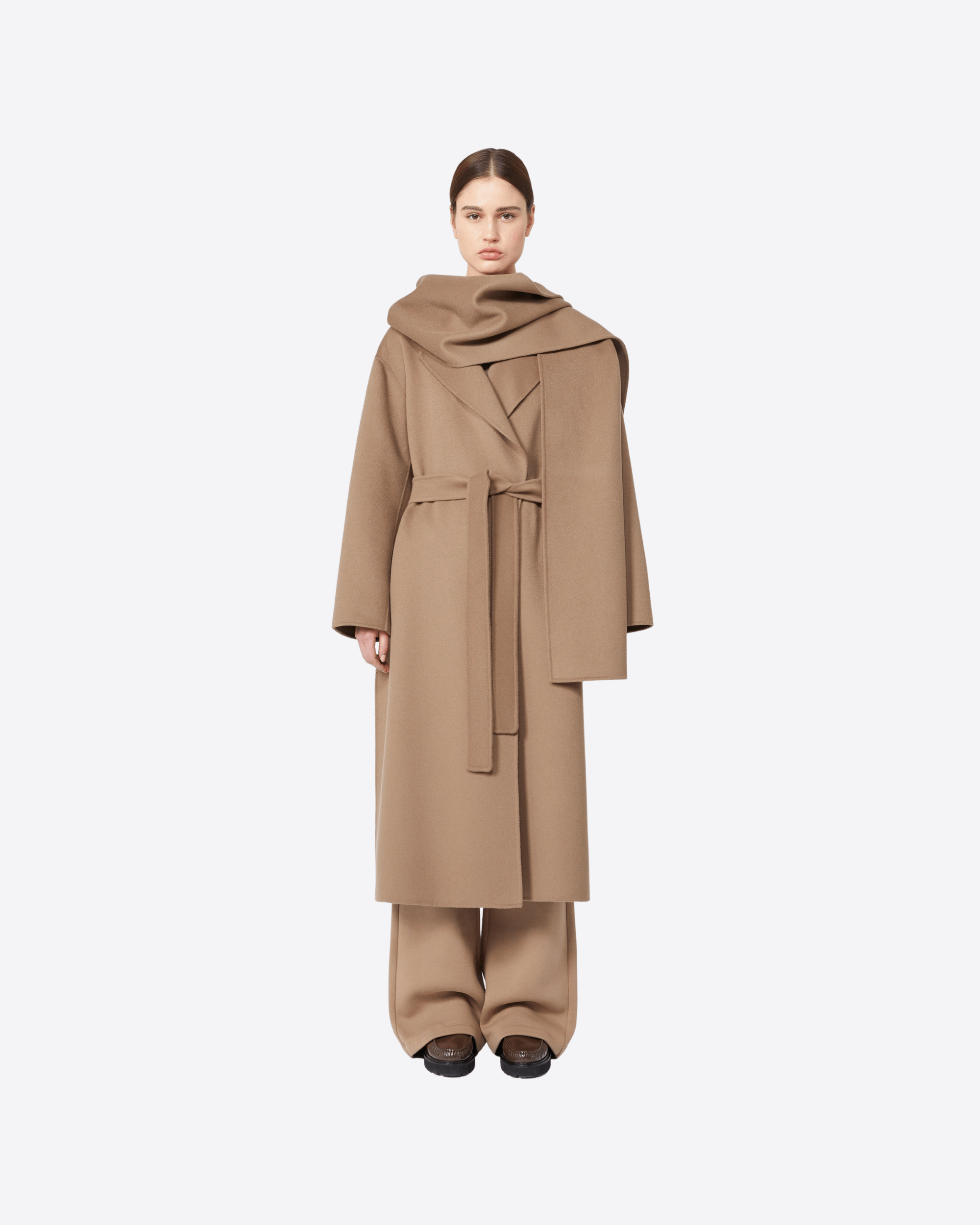 Cappotto lungo dalla silhouette a vestaglia, con sciarpa abbinata ampia per un perfetto total-look.