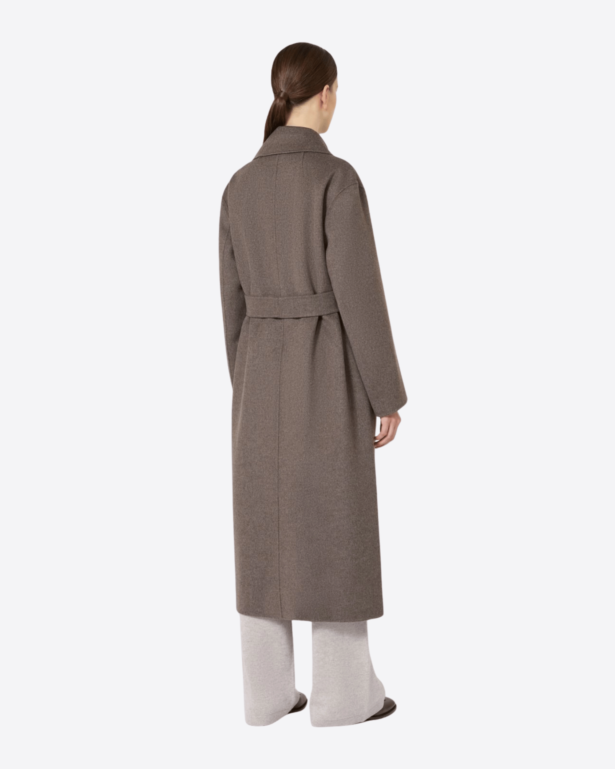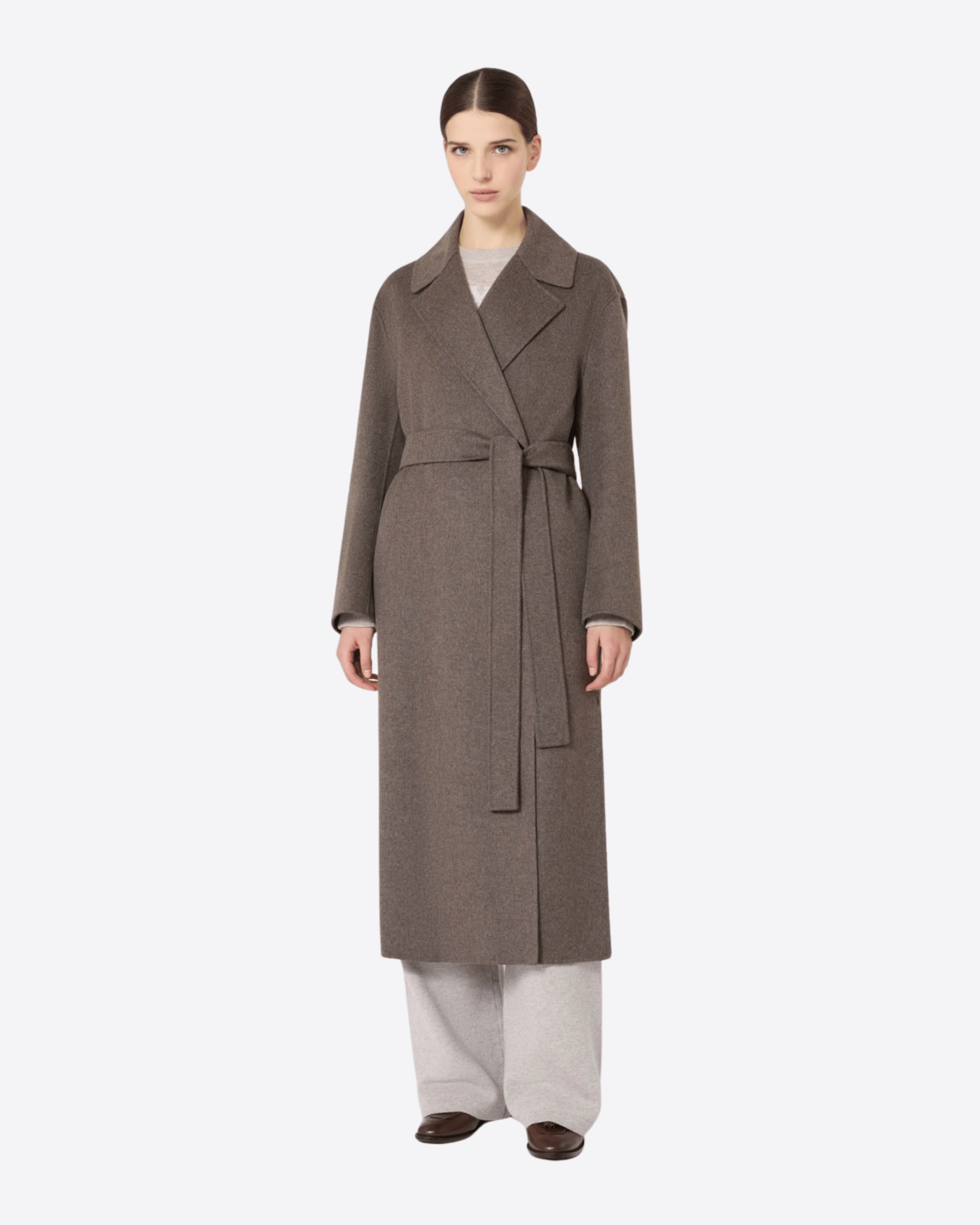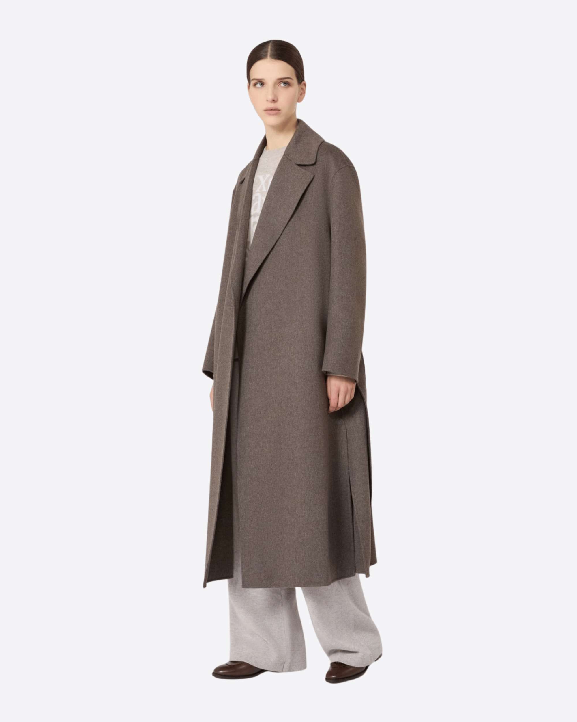 Cappotto lungo dalla linea a vestaglia realizzato in doppio drap di pura lana, cucito a mano. Il modello presenta una linea dritta con collo a rever e maniche lunghe a spalla scesa. La chiusura con cintura abbinata definisce la silhouette, mentre le tasche inserite nei fianchi e gli ampi spacchi laterali sul fondo completano il design con un’eleganza rilassata e contemporanea.