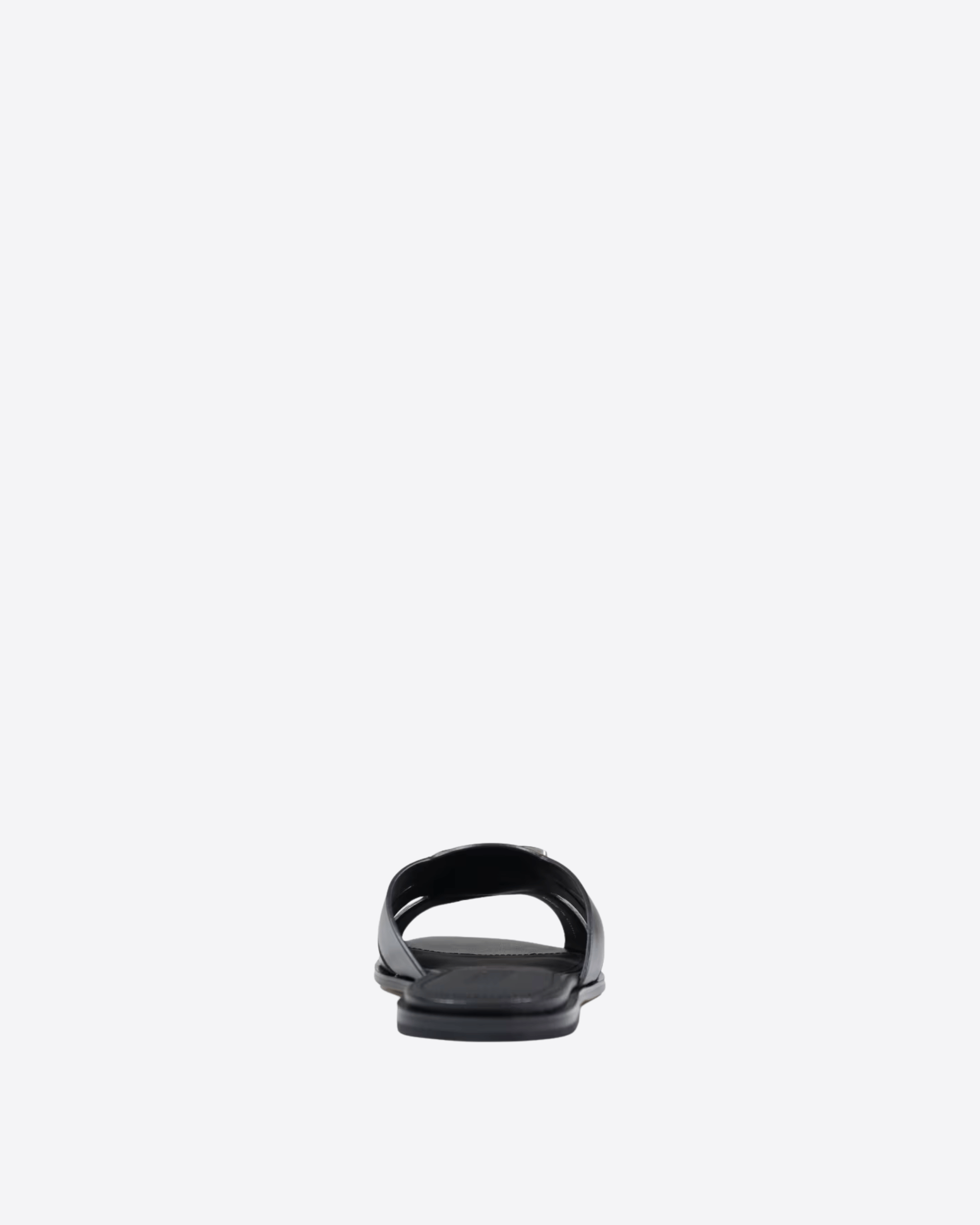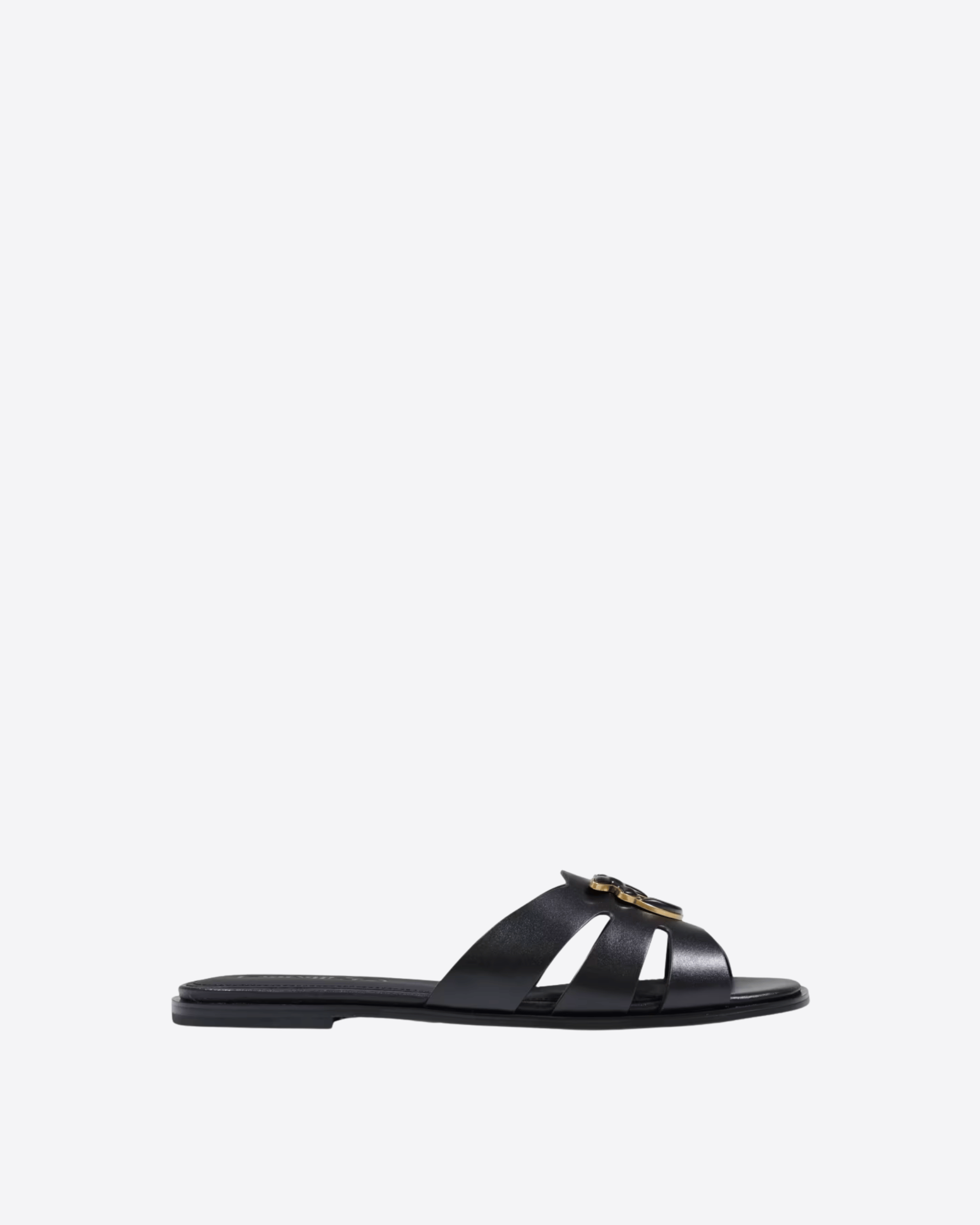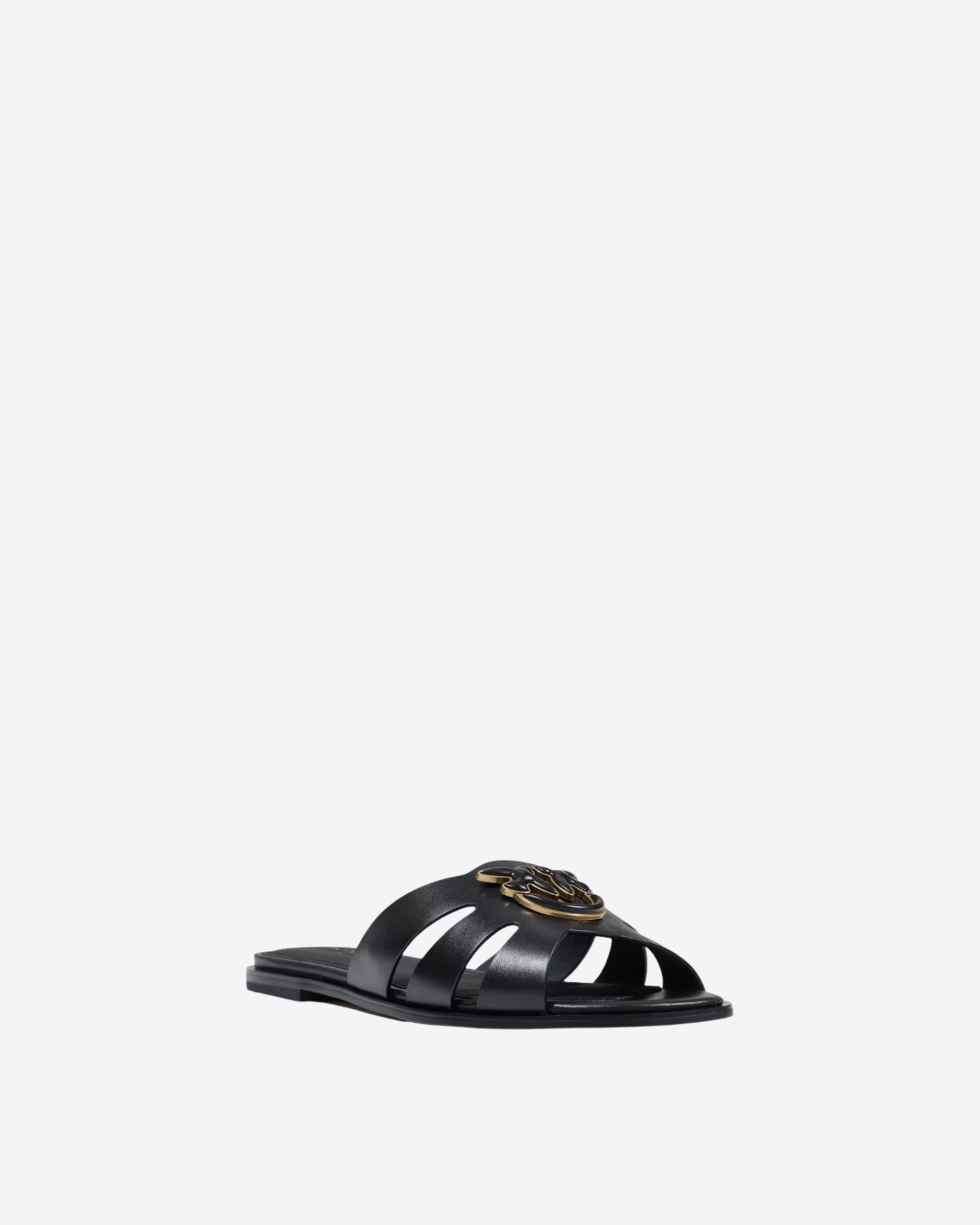 Ciabatta casual in pelle bovina liscia con interni in pelle e logo Love Birds Pinko. Il modello presenta punta tonda aperta, suola in gomma e tacco basso, decorato con fantasia monogram. Perfetta per look da giorno comodi e stilosi.