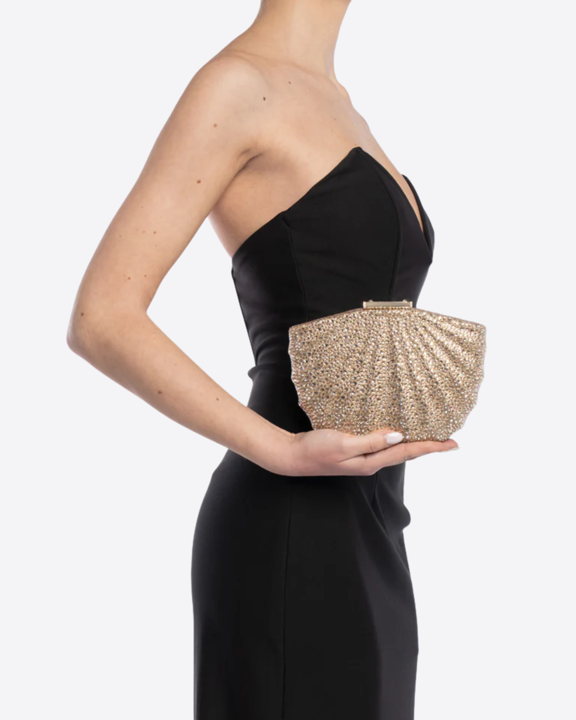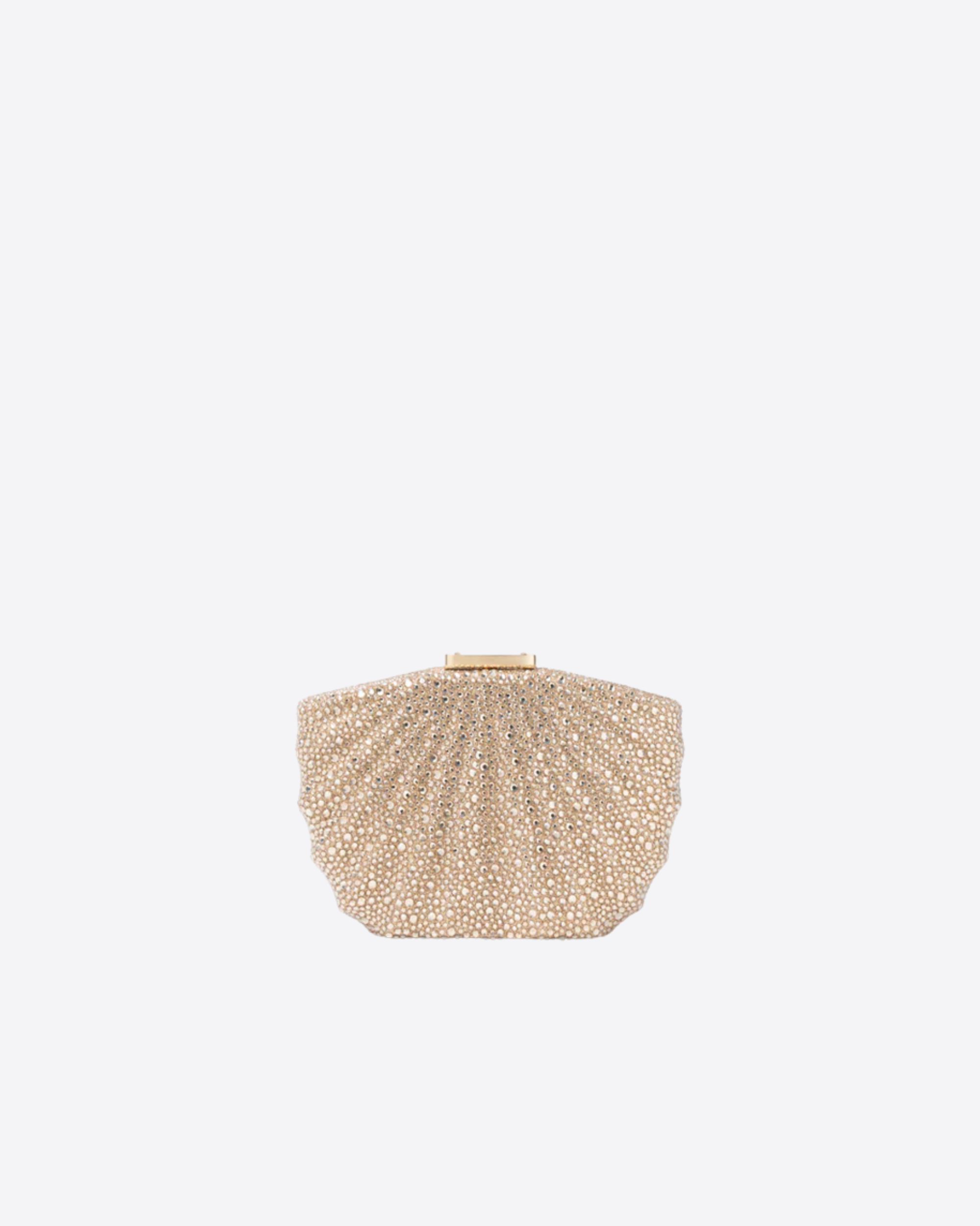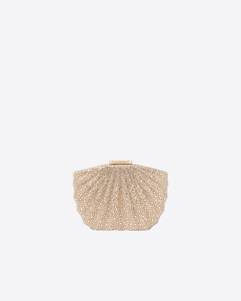 Clutch Bonita Twentyfourhaitch in luminosa tonalità oro, caratterizzata da un’originale silhouette a forma di conchiglia e completamente ricoperta di strass per un effetto brillante e sofisticato.