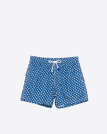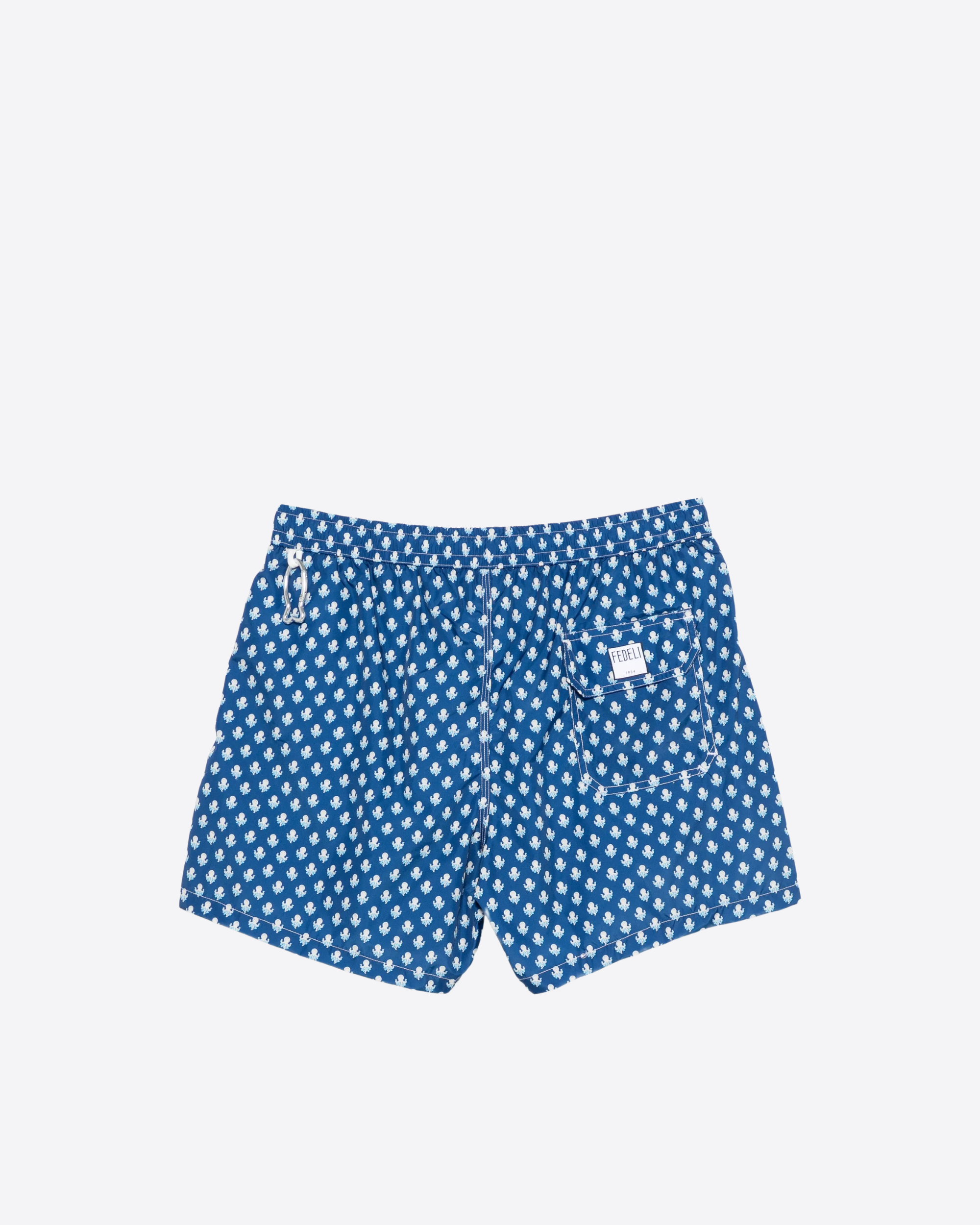 Costume da bagno in blu scuro con stampa, pensato per unire stile e funzionalità. La chiusura con coulisse consente una regolazione pratica e confortevole della vestibilità, mentre la tasca posteriore aggiunge un dettaglio funzionale. Un modello versatile, ideale per accompagnare con disinvoltura le giornate al mare o in piscina.