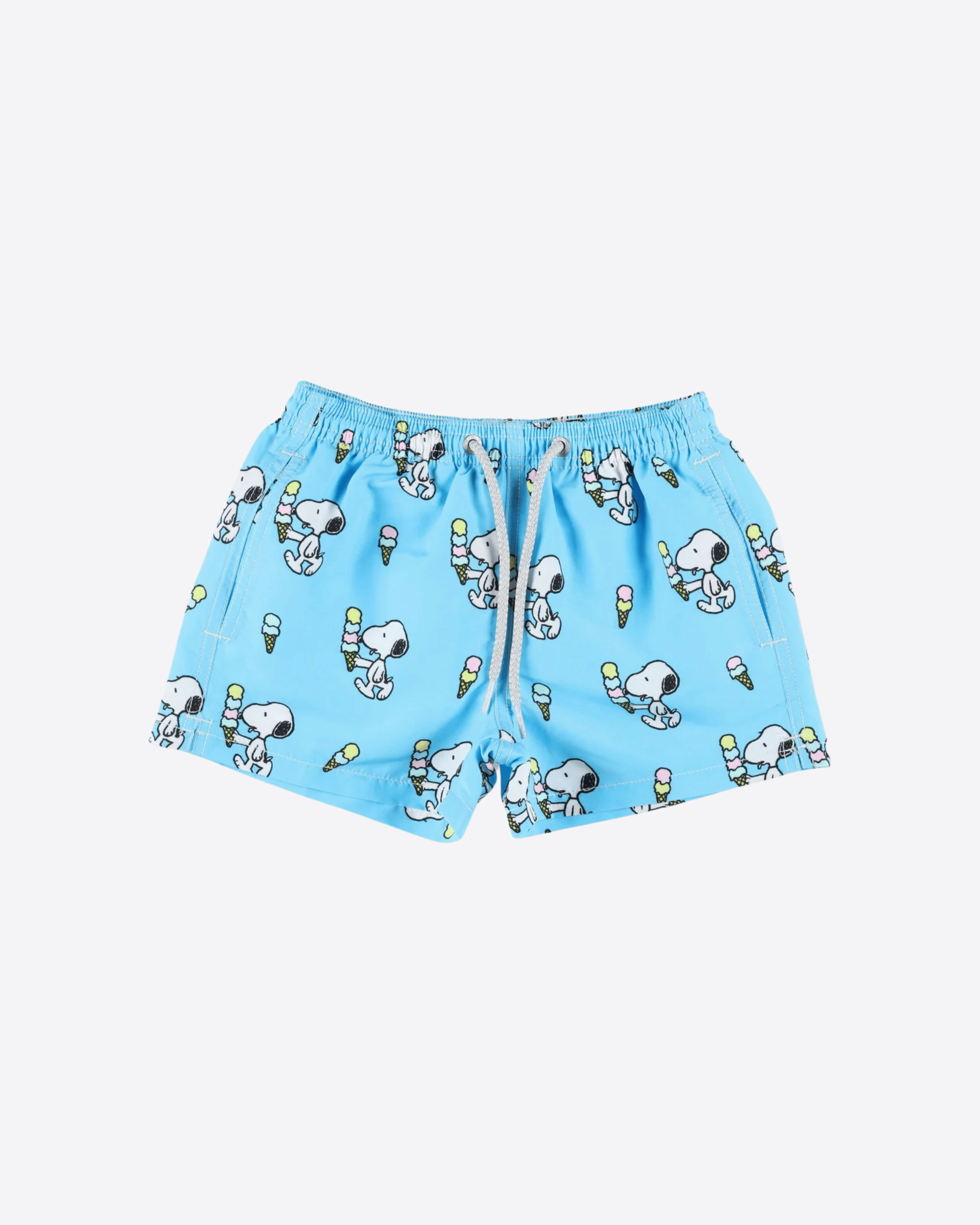 Il modello si distingue per la stampa all-over con Snoopy e coni gelato, che dona un tocco giocoso e iconico. La vestibilità regolare e la vita elasticizzata con coulisse assicurano una calzata comoda e regolabile per tutto il giorno.