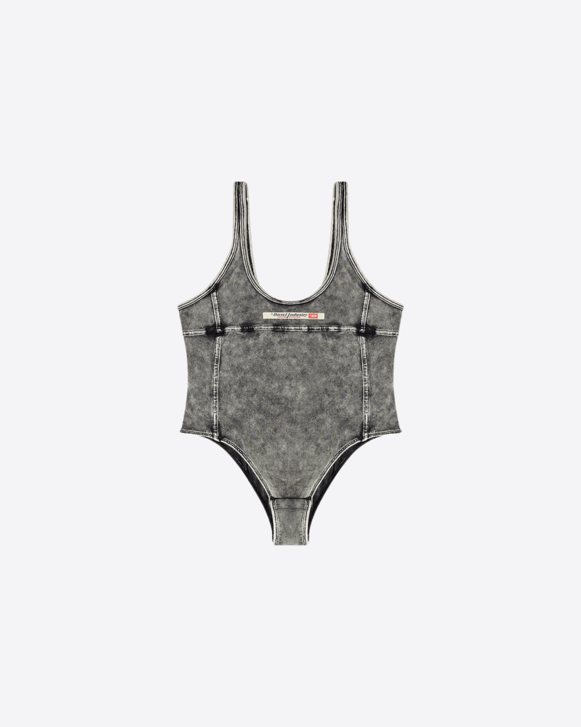 Body tank da donna firmato Diesel, realizzato in jersey stretch effetto denim per una vestibilità confortevole e modellante. Caratterizzato da un effetto marmorizzato unico e dall’iconico logo Diesel Industry, combina stile distintivo e praticità in un capo versatile.