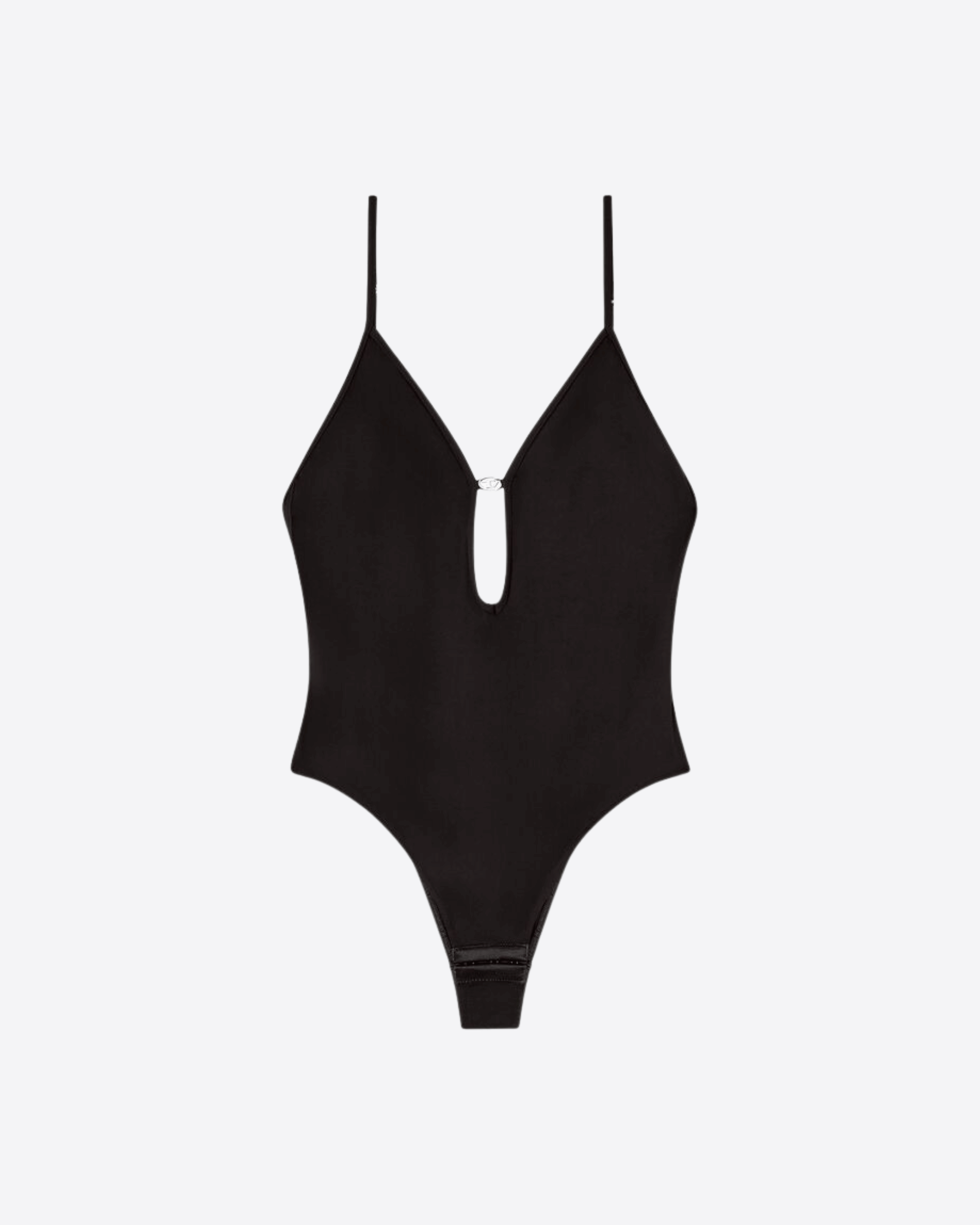 Questo body da donna firmato Diesel è realizzato in microfibra nera super morbida per un comfort avvolgente. La profonda scollatura a V sul davanti è impreziosita da una placca Oval D tono su tono in metallo, mentre il retro a schiena scoperta aggiunge un tocco elegante e sensuale al design.
