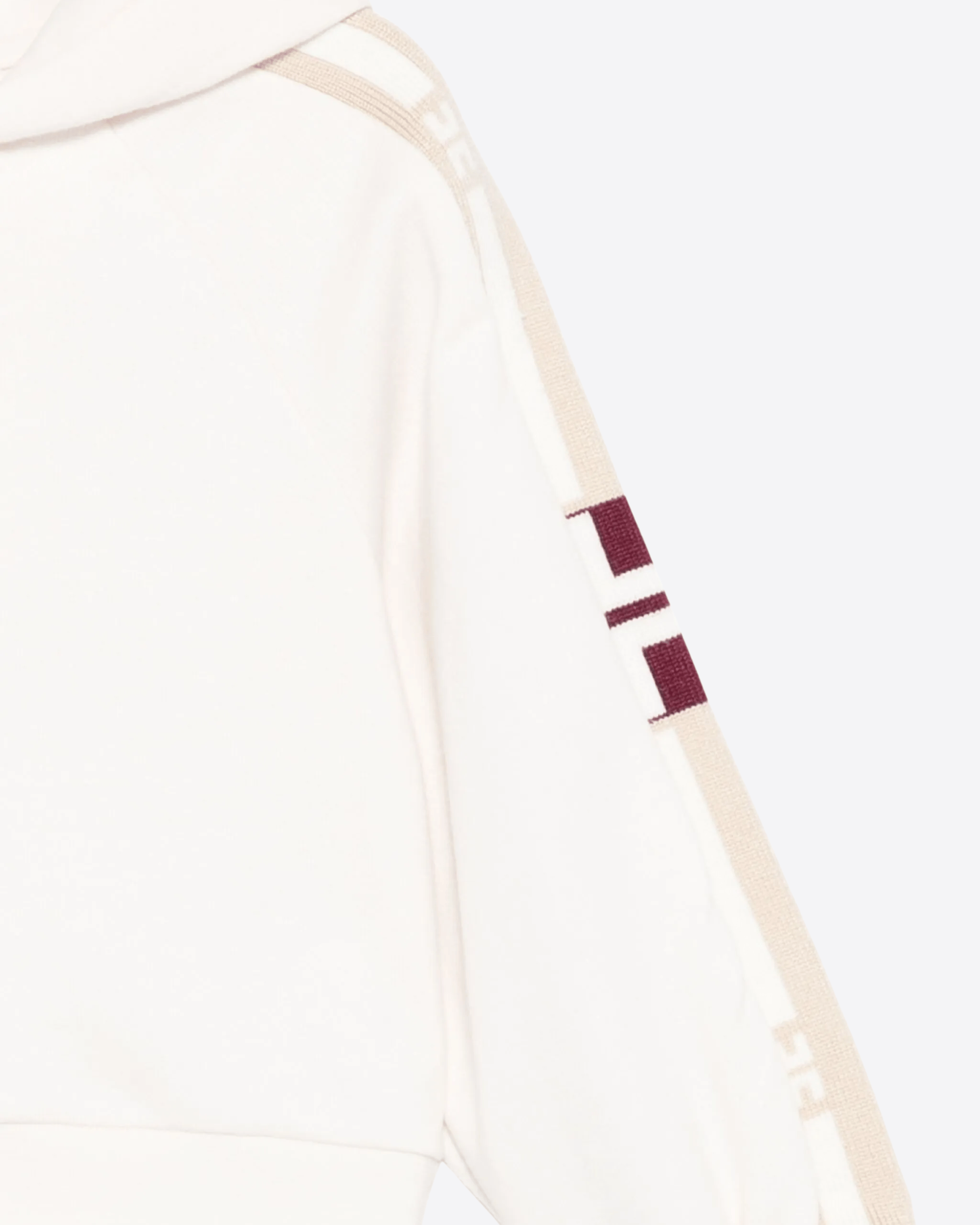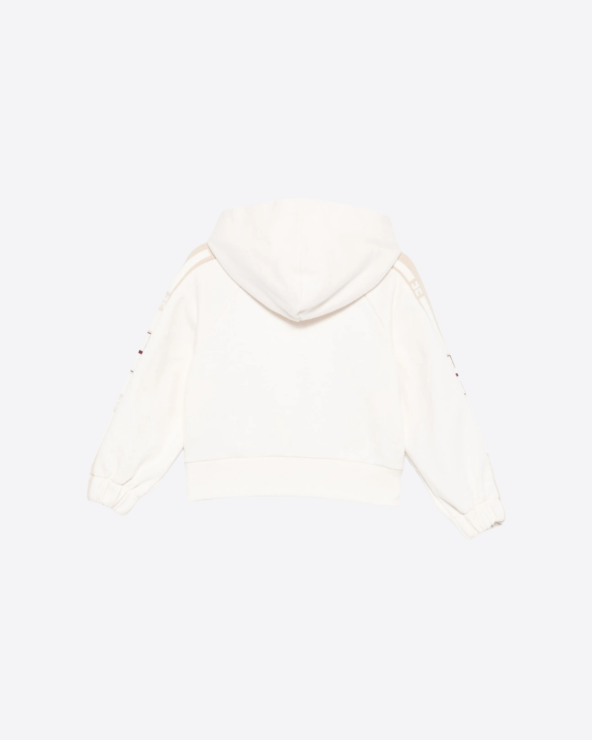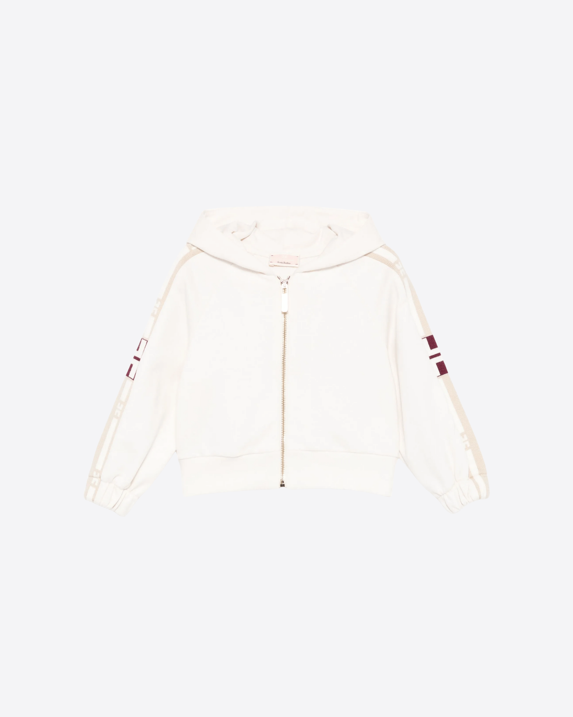 Giacca da bambina Elisabetta Franchi in beige chiaro, con cappuccio, chiusura con zip e maniche lunghe. Il dettaglio a righe dona un tocco moderno e raffinato, perfetto per completare con eleganza il look della tua bambina.