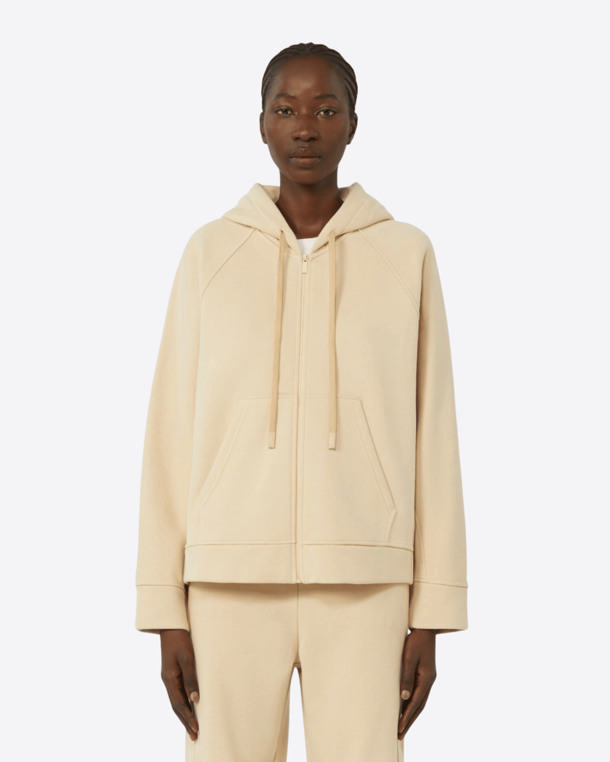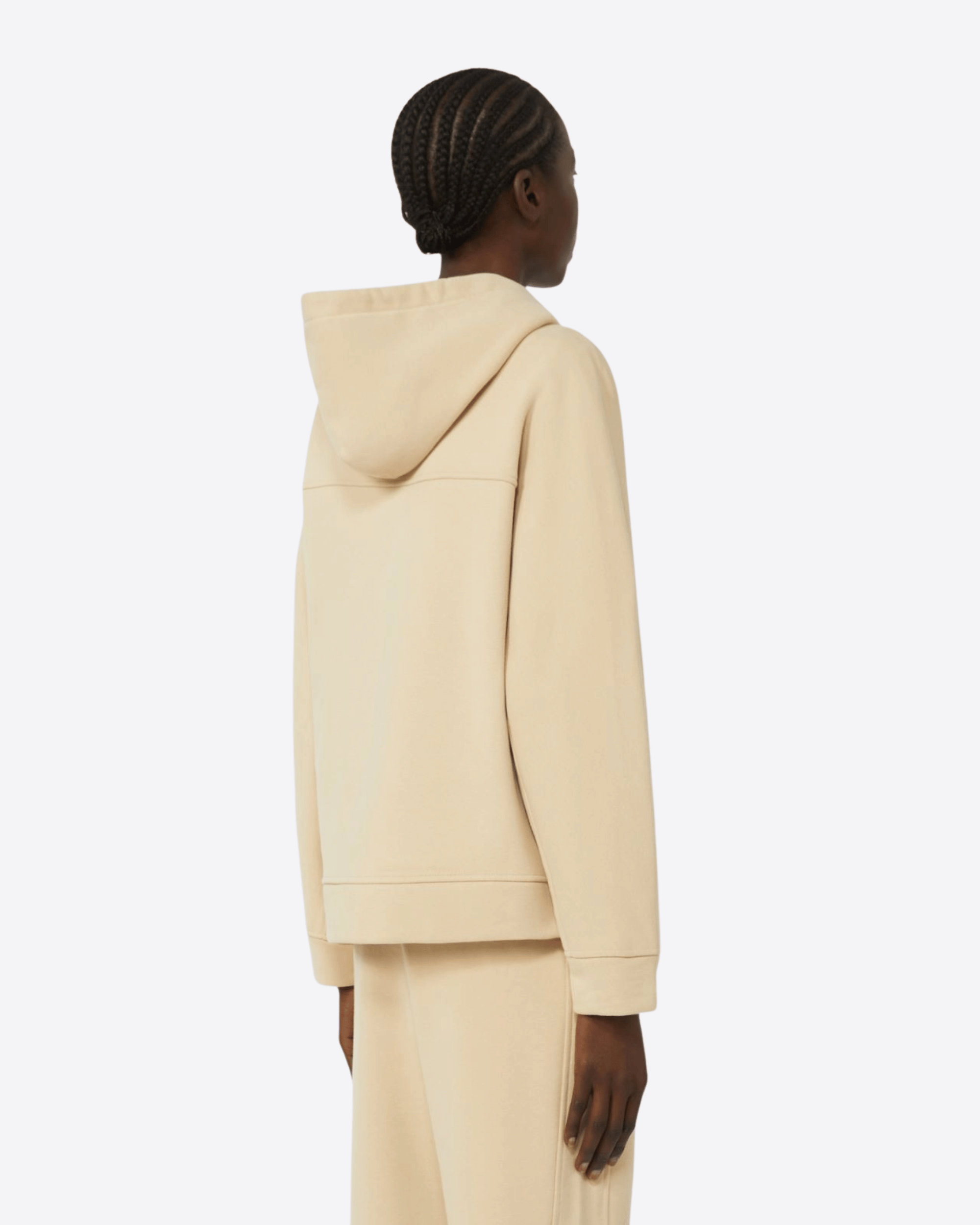 Felpa con cappuccio a coulisse in jersey di cotone garzato smerigliato, realizzata con tessuto principale contenente almeno il 50% di cotone proveniente da agricoltura biologica. Il modello presenta regular fit, maniche lunghe raglan e chiusura frontale con zip. Completano il design le tasche marsupio sul davanti, i lacci coulisse personalizzati e il motivo di impunture e intarsio sui fianchi con logo WKND stampato.