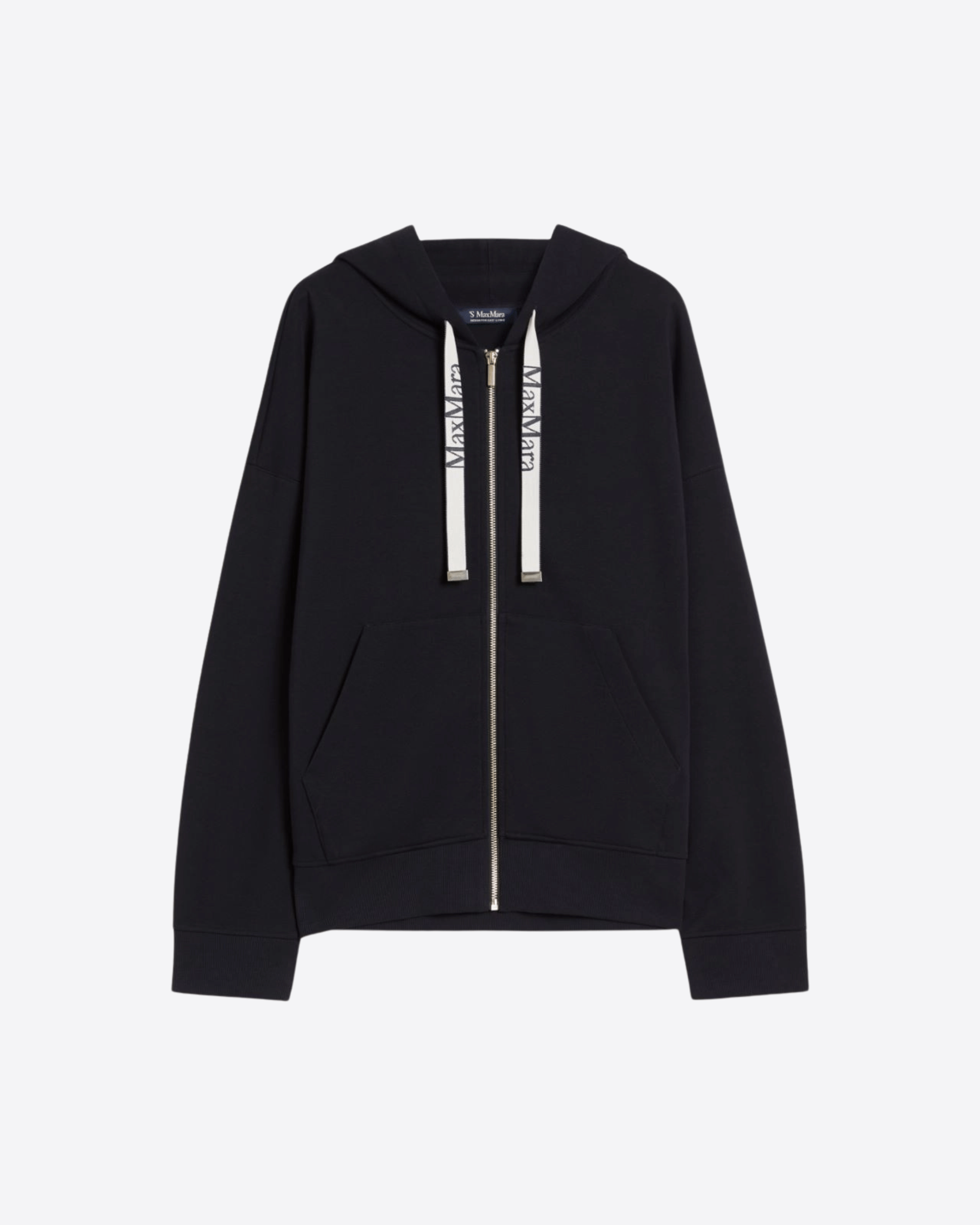 Felpa con cappuccio a coulisse in jersey di cotone tecnico, caratterizzata da nastri con logo jacquard. Il modello boxy presenta maniche lunghe a giro basso e chiusura frontale con zip. Completano il design le tasche marsupio sul davanti e i polsi e bordo a costine.
