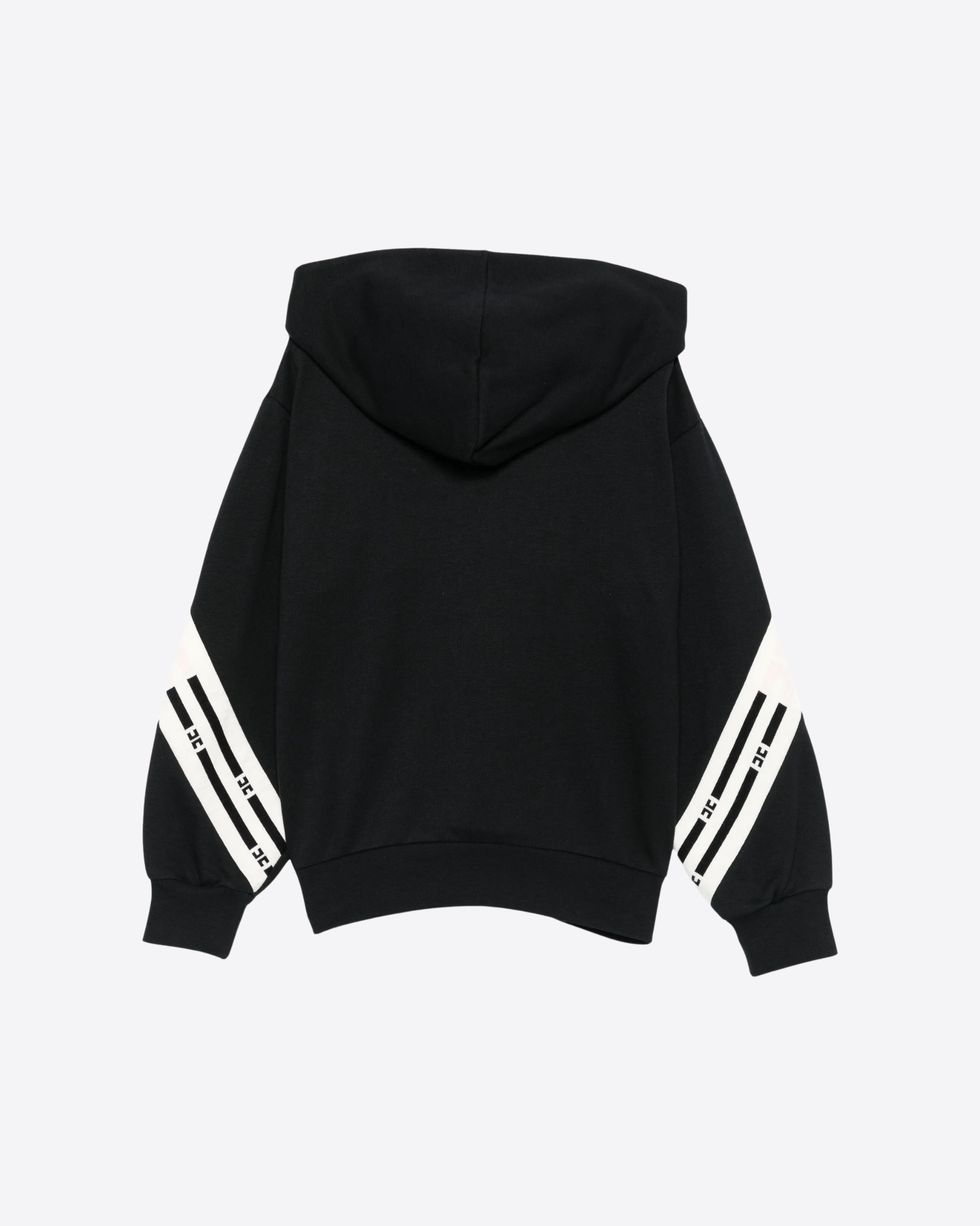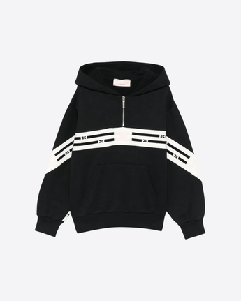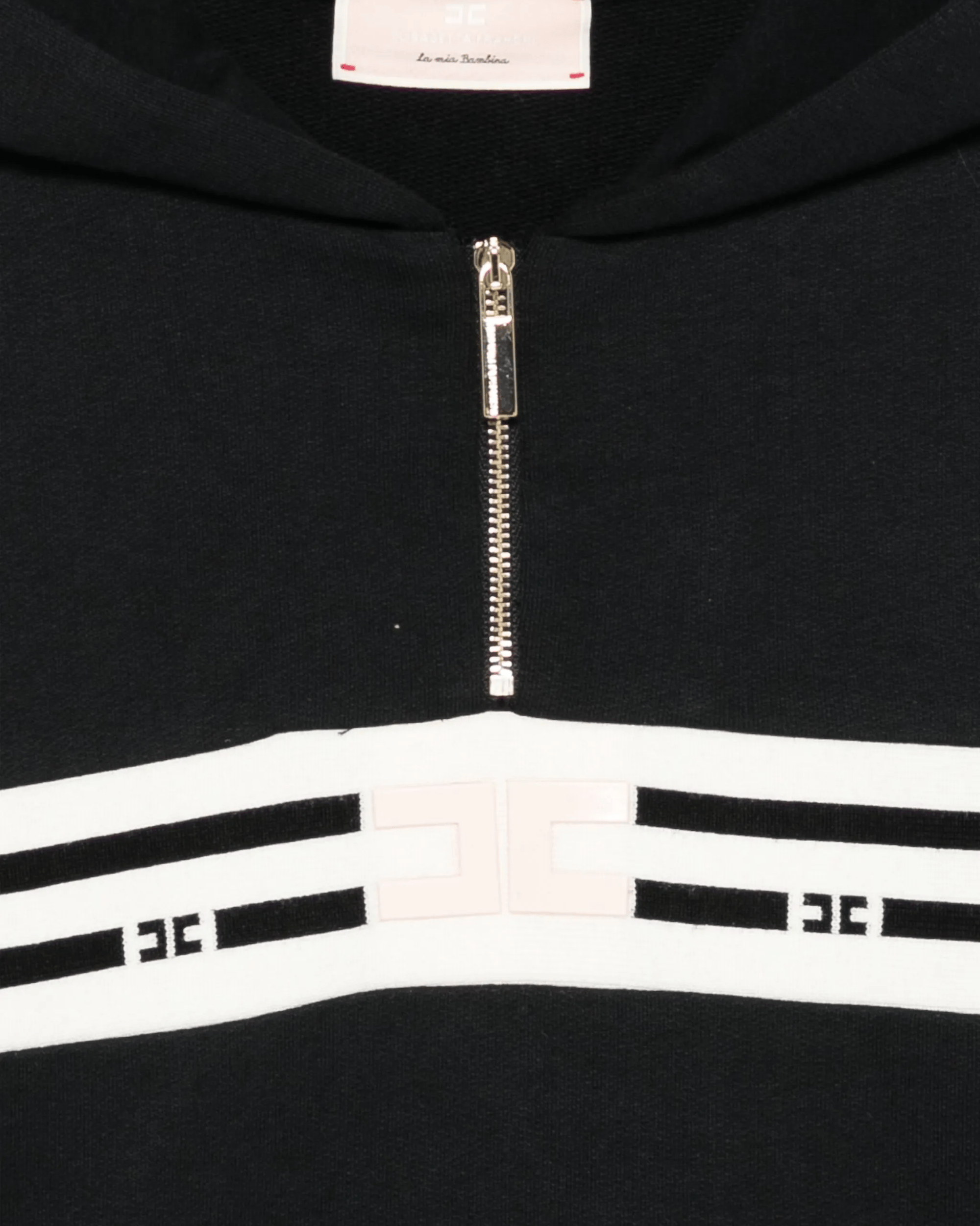 Felpa nera da bambina Elisabetta Franchi con mezza zip e cappuccio. Le maniche lunghe e il dettaglio a righe aggiungono un tocco elegante e moderno, perfetta per un look casual e raffinato.