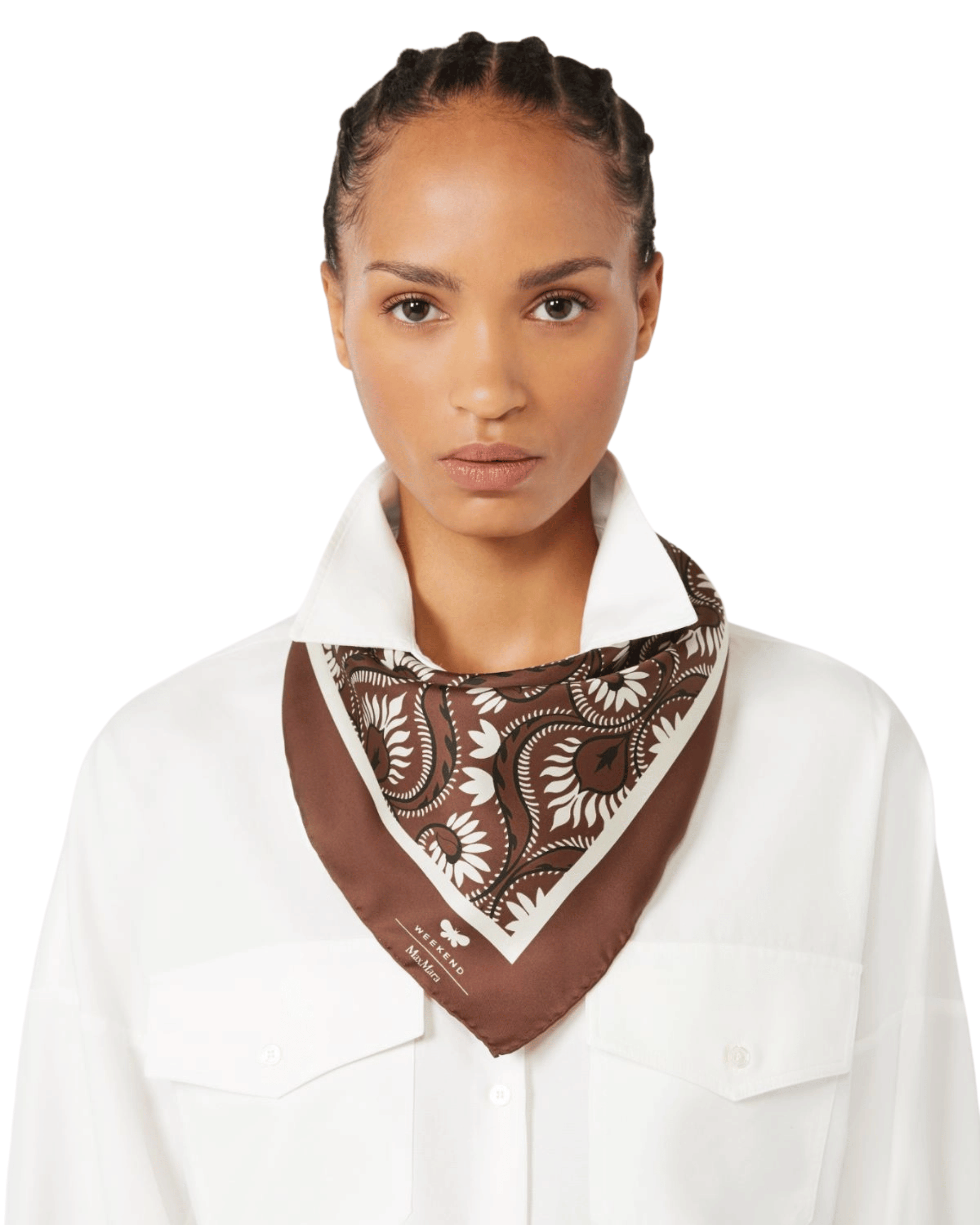 Foulard quadrato caratterizzato da un motivo di collezione stampato su tutta la superficie. Realizzato in twill di pura seta, presenta bordi finemente cuciti e logo Weekend Max Mara sull’angolo basso a destra. Le dimensioni di 90 x 90 cm lo rendono versatile da indossare in diversi modi, aggiungendo eleganza e stile a ogni outfit.