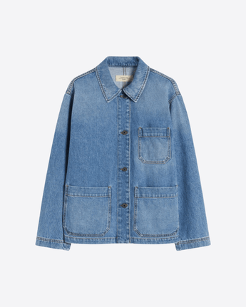 Giacca dalla linea a camicia rifinita da impunture ispirate allo stile denim, realizzata in autentico denim di puro cotone. La linea leggermente svasata con spacchi laterali conferisce comfort e libertà di movimento, mentre il colletto a camicia e le maniche lunghe definiscono un’estetica essenziale e versatile. La chiusura frontale con bottoni a chiodo e le tre tasche a toppa sul davanti completano il design. Modello sfoderato, ideale per un utilizzo trasversale nelle mezze stagioni.