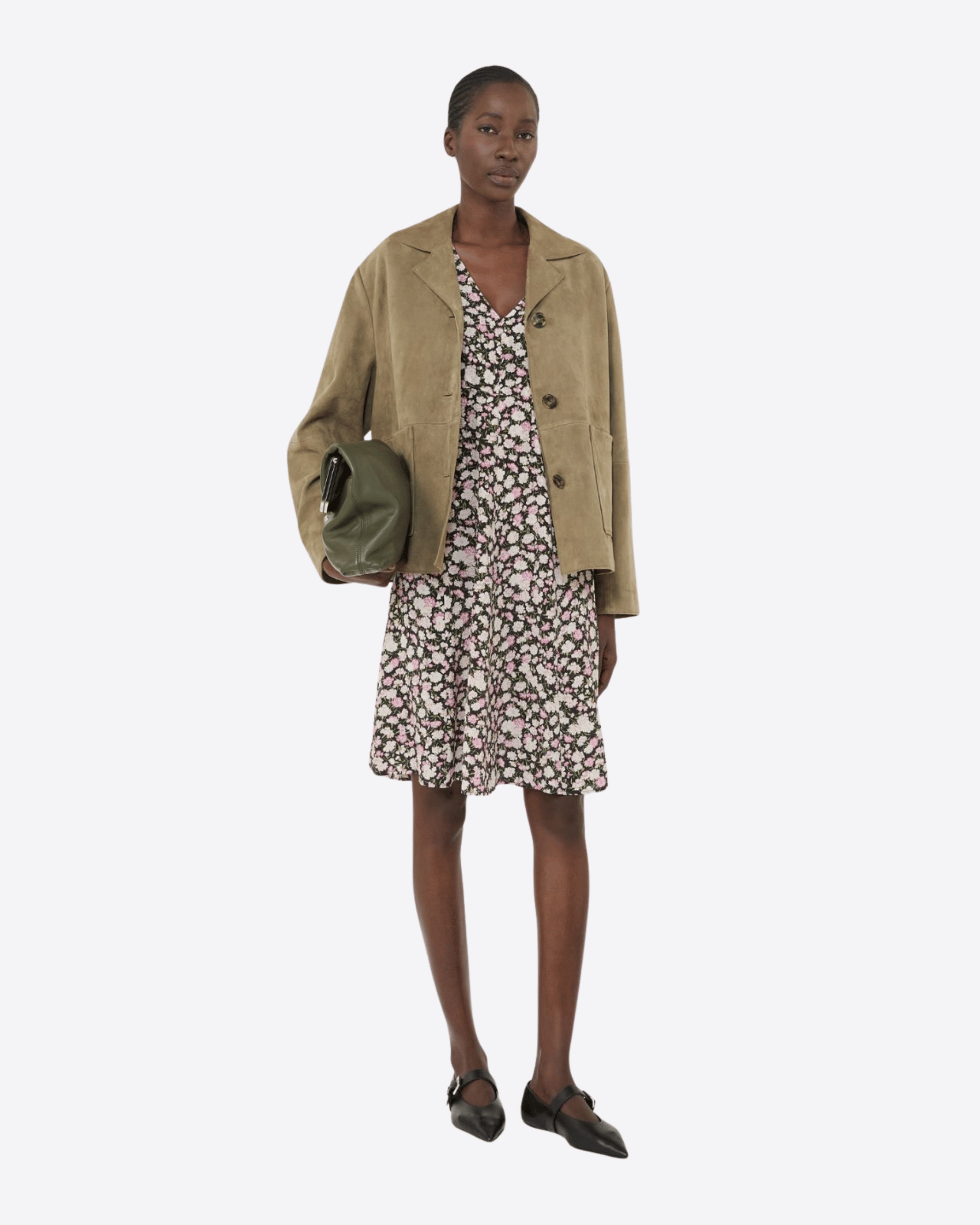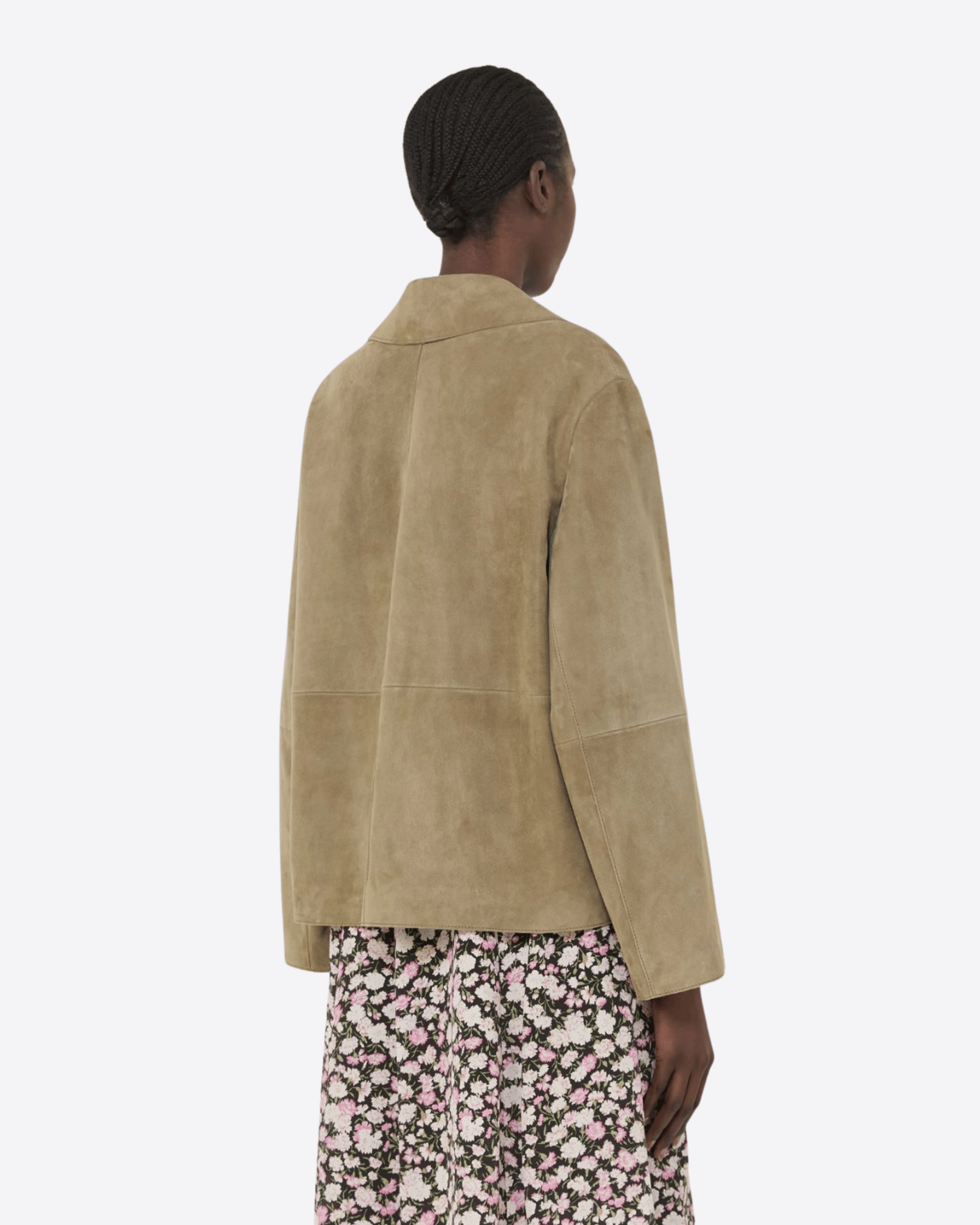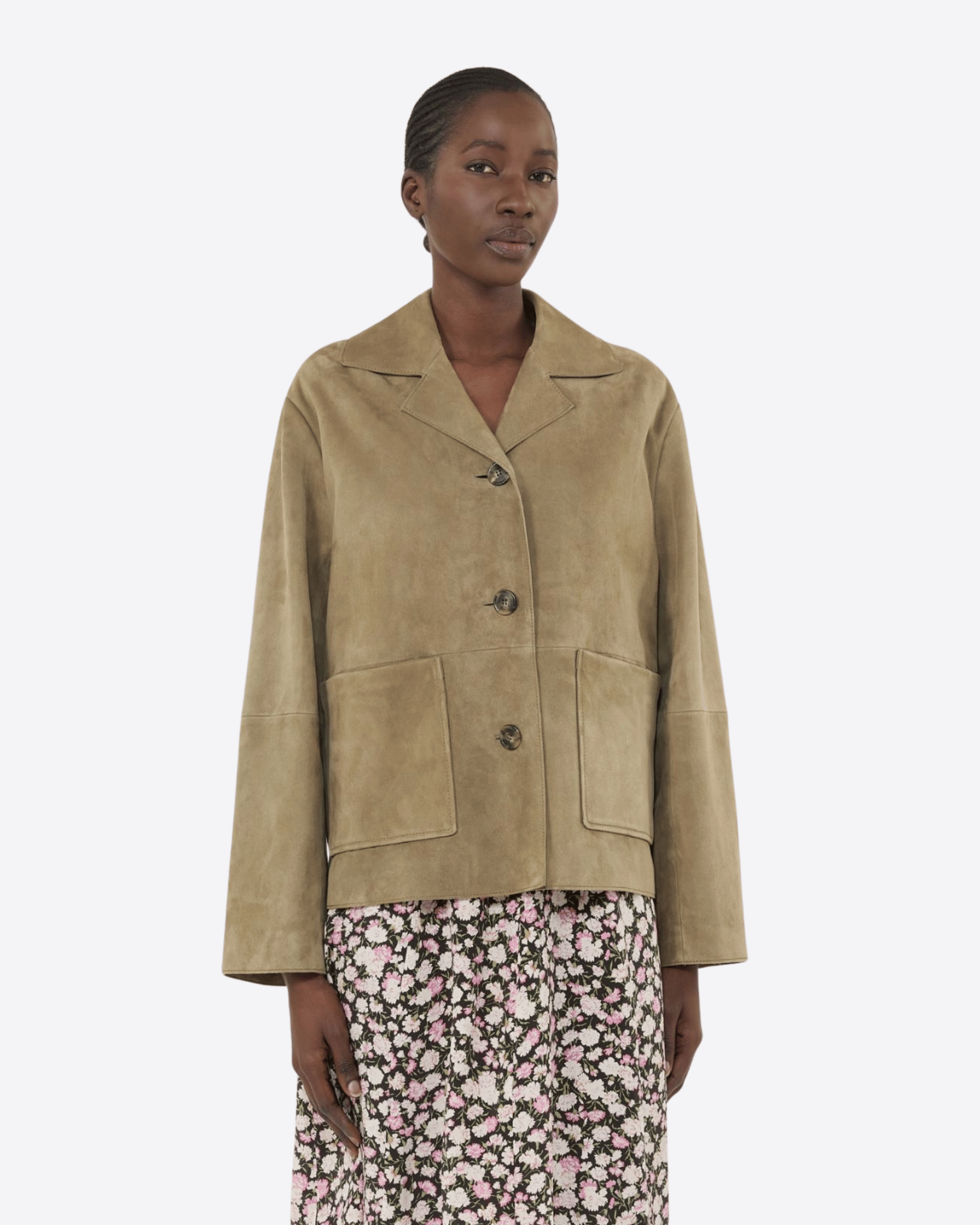 Giacca crop dalla linea boxy realizzata in morbida pelle scamosciata. Il modello è caratterizzato da un collo rever piccolo, maniche lunghe con spalla scesa e una silhouette moderna e strutturata. I tagli e le impunture ispirate allo stile della pelletteria definiscono il design, mentre la chiusura frontale con bottoni effetto corno e le tasche applicate sul davanti aggiungono funzionalità e carattere. Interno foderato per un comfort ottimale.