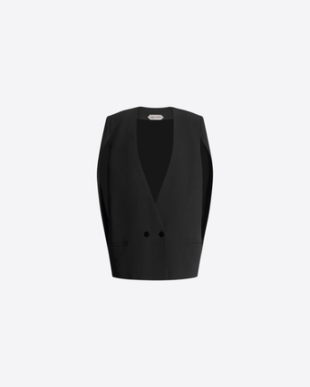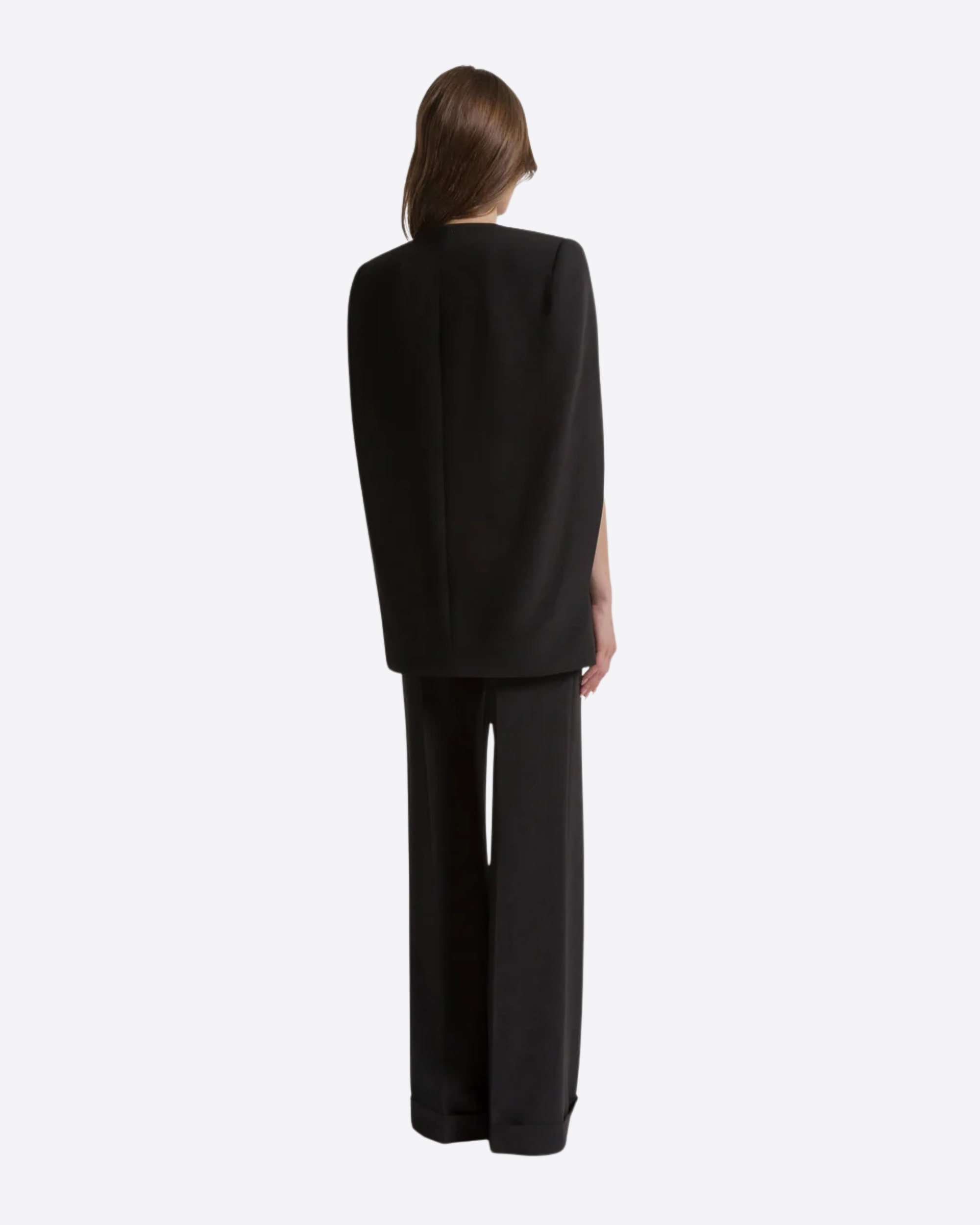 Il modello presenta un elegante scollo a V e originali maniche a mantella, che donano movimento e un tocco scenografico al capo. I bottoni frontali completano il design con un dettaglio classico e funzionale.
