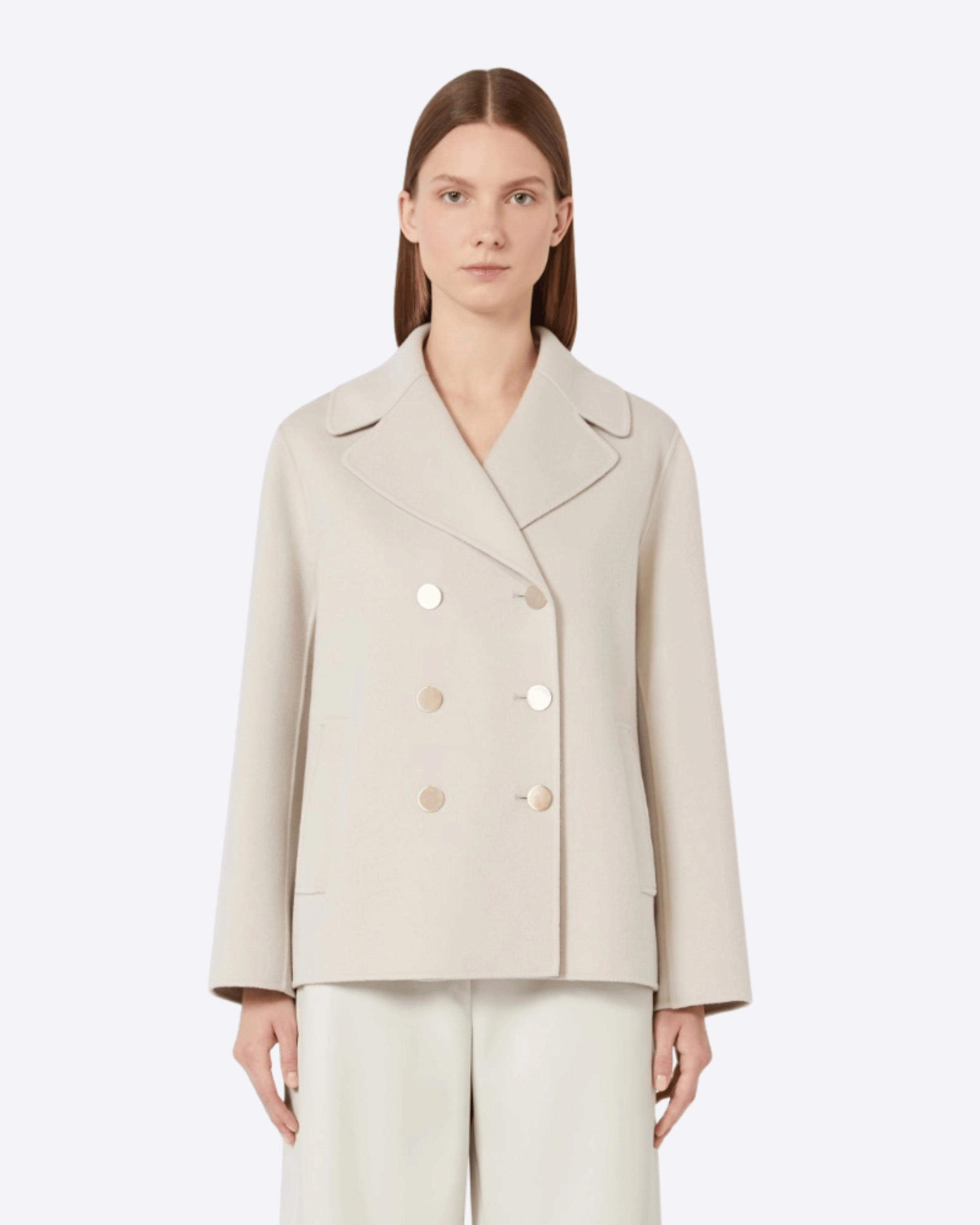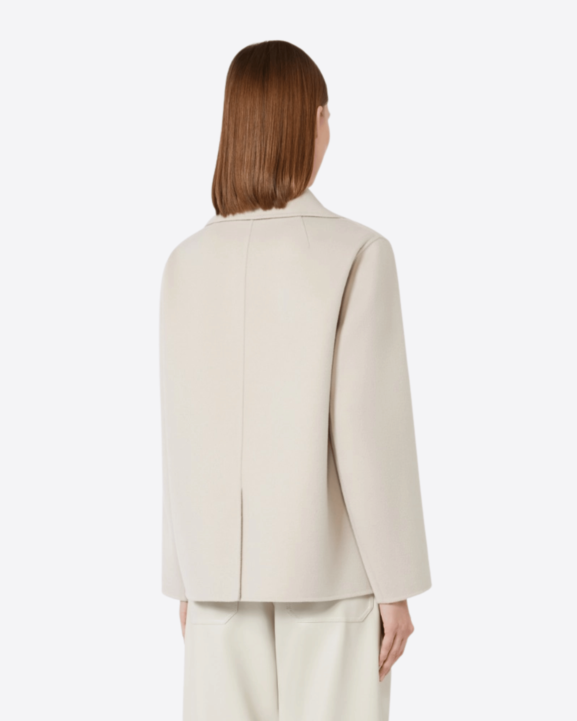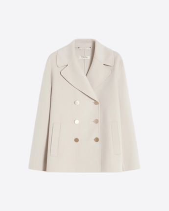 Giacca doppiopetto di ispirazione caban realizzata in doppio drap di pura lana, cucito a mano. Il modello presenta una linea boxy con collo a rever e maniche lunghe a giro. La chiusura frontale è definita da bottoni in metallo, mentre le tasche a filettone sui fianchi e lo spacco centrale sul retro completano il design con un equilibrio di funzionalità e stile.