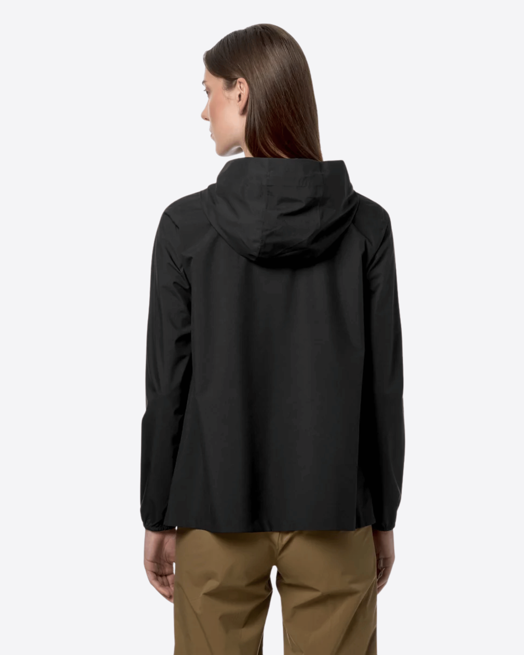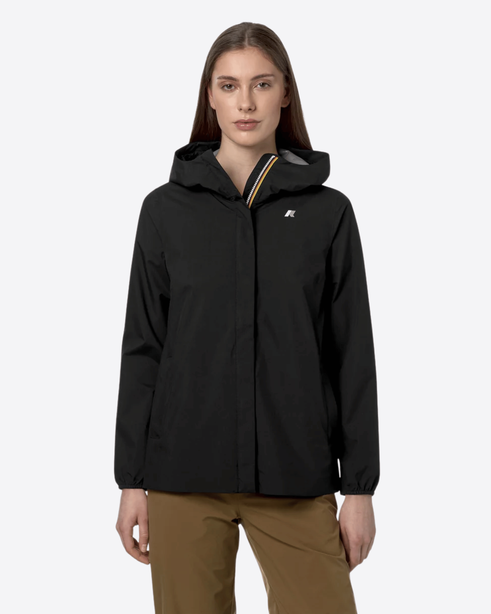 Marguerite è una giacca mid da donna ideale per le mezze stagioni, realizzata in tessuto tecnico elasticizzato che segue i movimenti e protegge dal vento e dalla pioggia fino a 10000 mm di colonna d’acqua. L’interno è foderato con una membrana isolante decorata con lettering K-Way stampato all over in tonalità argento. Le tasche laterali con zip, il cappuccio avvolgente, i polsini elastici e la chiusura zip con patta di copertura garantiscono funzionalità, aderenza e una vestibilità comoda. Il fitting regolare e il logo bianco stampato completano il design, unendo stile e performance.