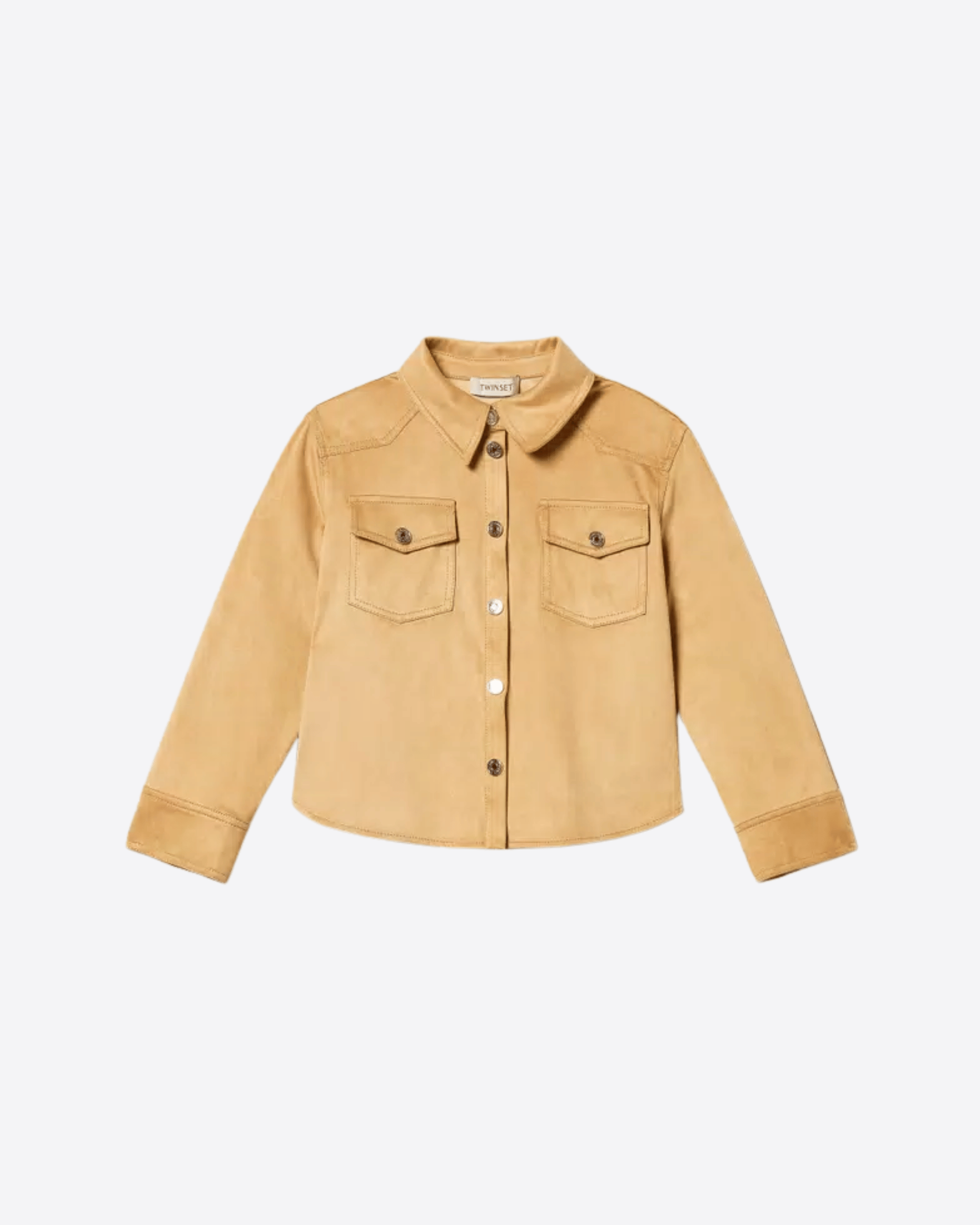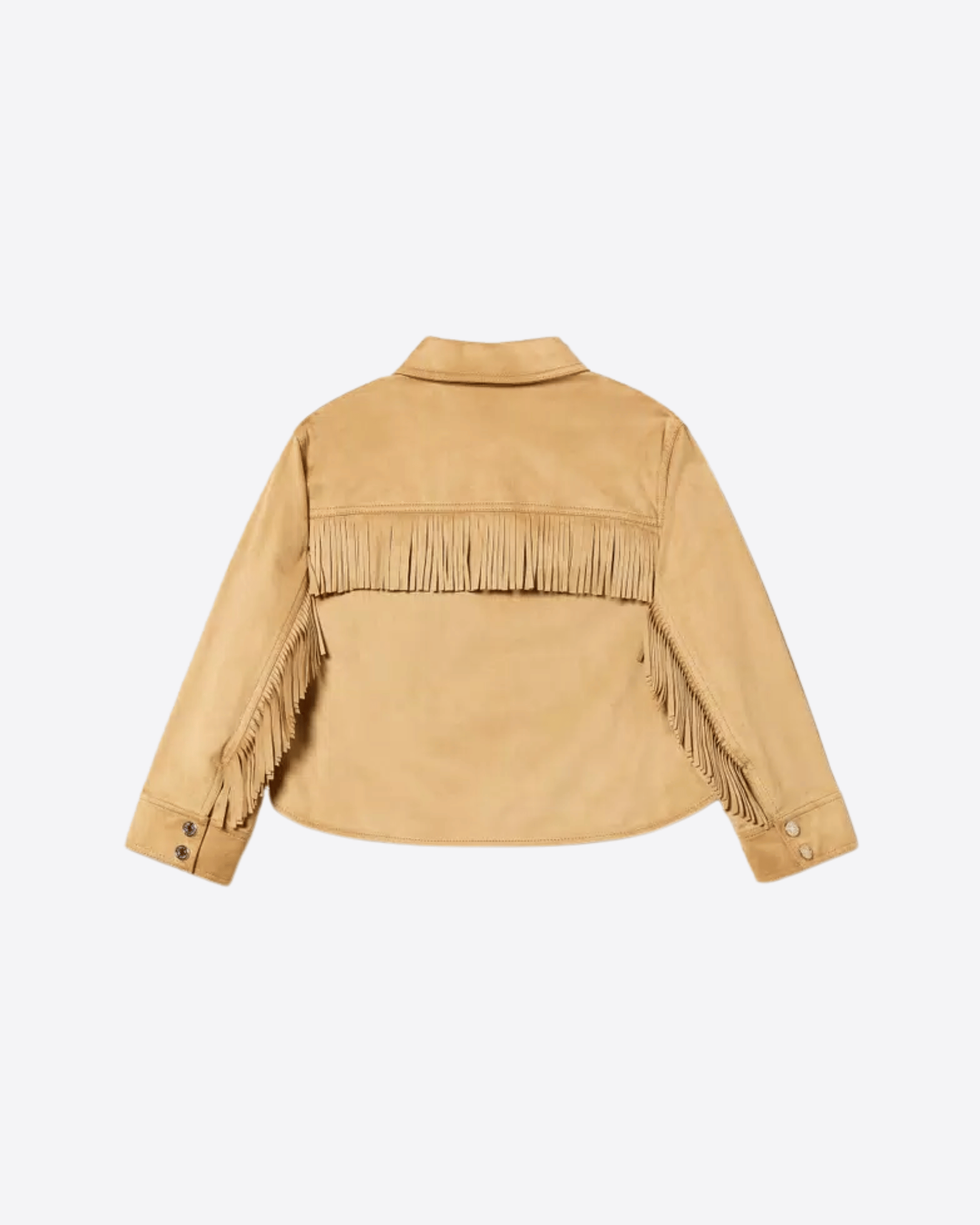 Giacca da bambina modello overshirt realizzata in tessuto effetto scamosciato, impreziosita da frange che rifiniscono le maniche e il taglio carré. Il modello presenta colletto a camicia, chiusura frontale con bottoni a pressione logati e maniche lunghe con polsino e bottone. Completano il design le tasche applicate con patta e una linea ampia, pensata per un look contemporaneo e confortevole.