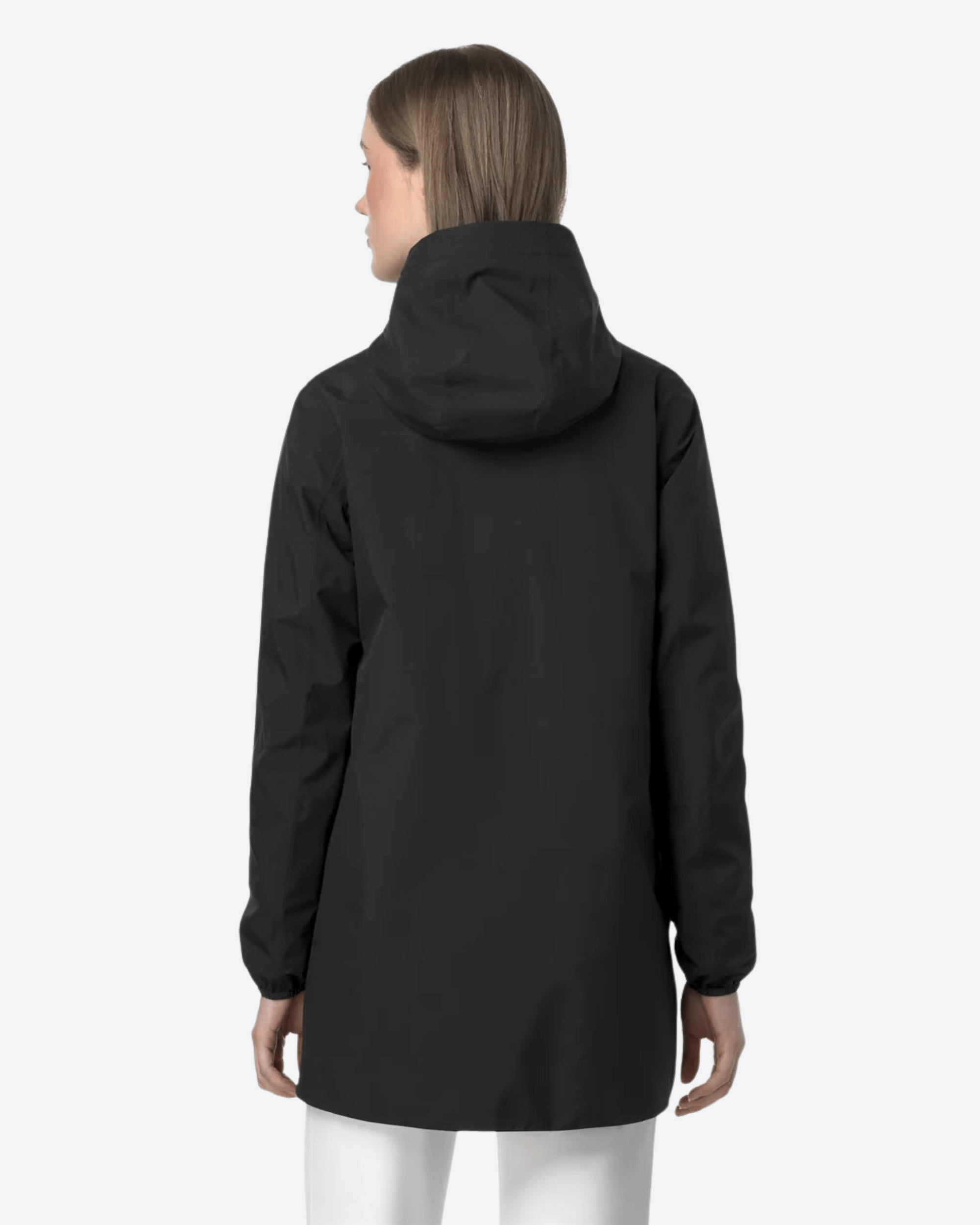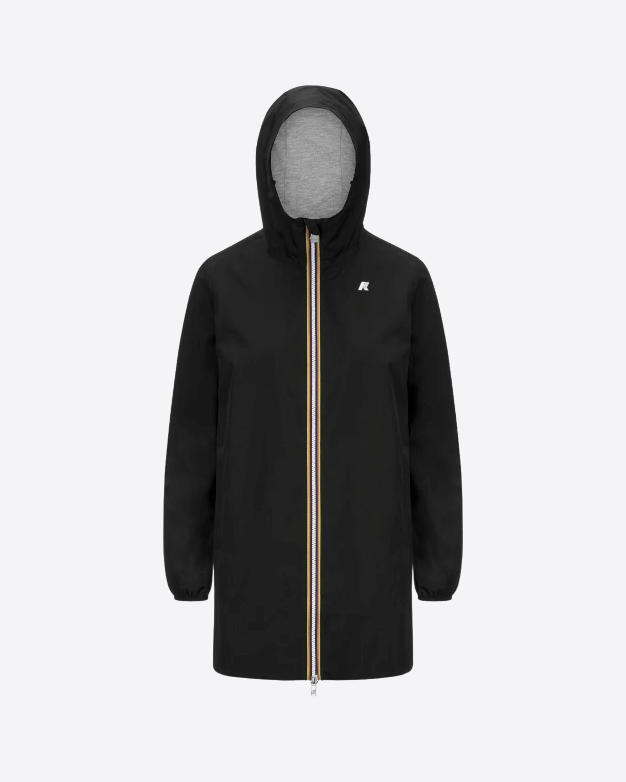 Sophie è una giacca da donna di lunghezza media con linea slim che valorizza la silhouette. Realizzata in poliestere stretch antipioggia, presenta una fodera in morbido jersey di cotone grigio melange sulla parte alta per comfort e protezione a contatto con la pelle. Le cuciture termonastrate, il tape multicolor K-Way al punto vita, il cappuccio non staccabile, la chiusura zip, i polsi elasticizzati, le tasche con zip e il taglio di ventilazione sul retro completano un design funzionale e distintivo, arricchito dal logo in silicone bianco.