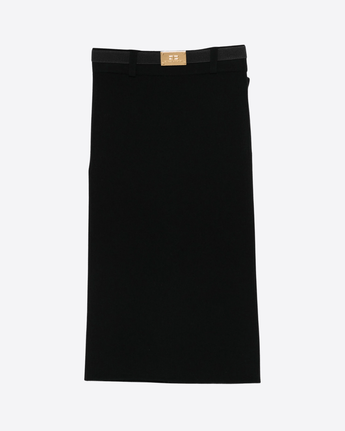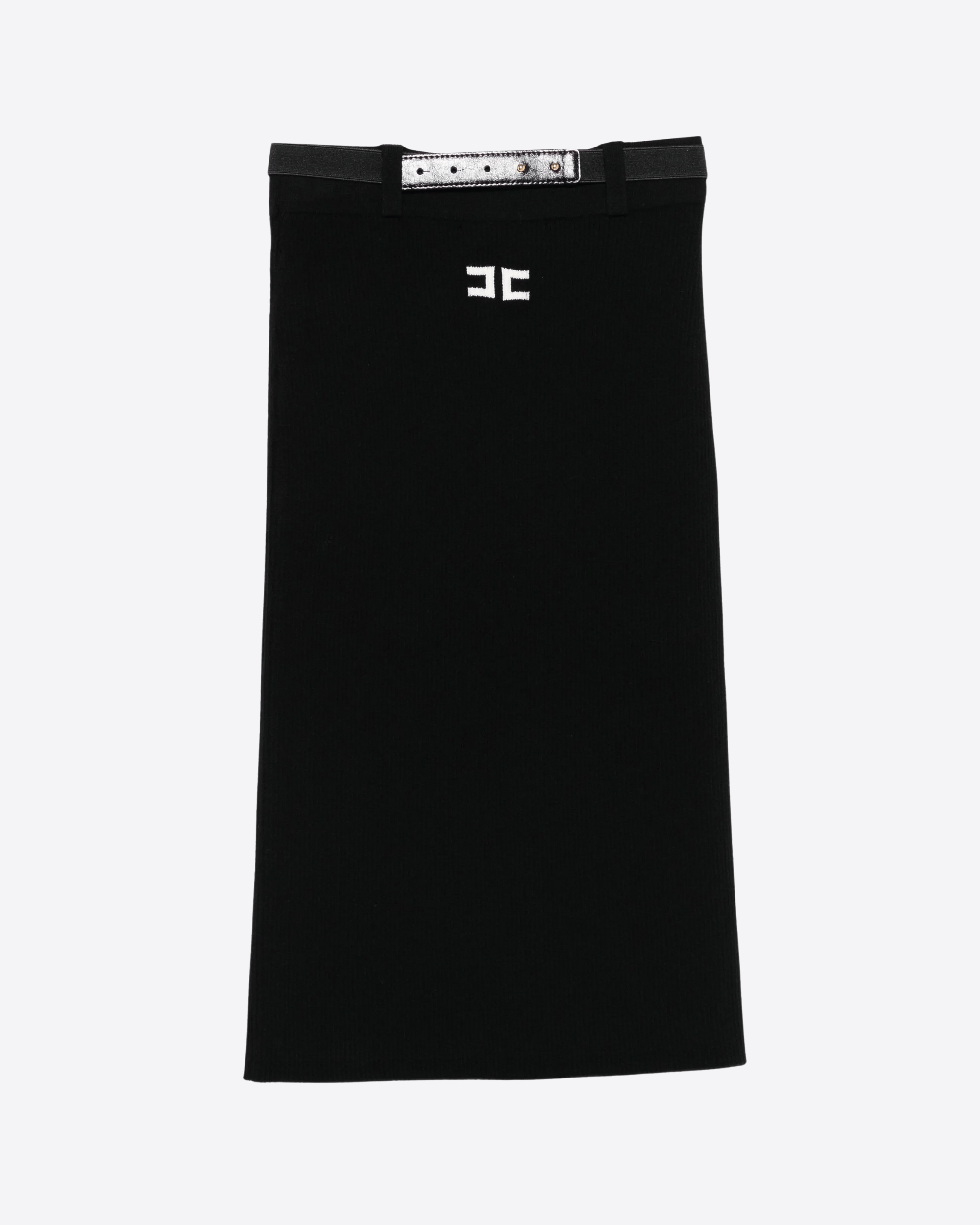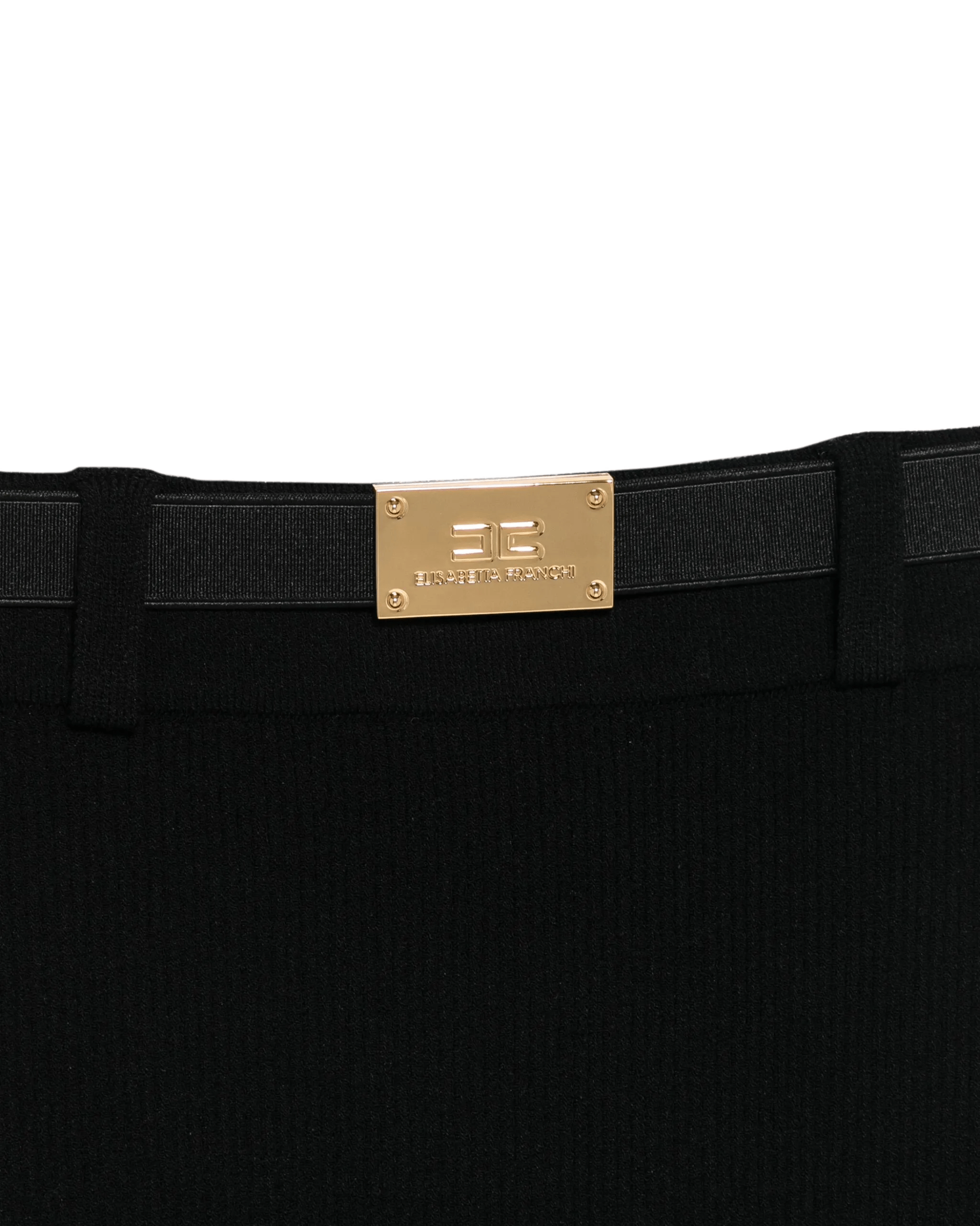 Gonna nera da bambina Elisabetta Franchi, realizzata in maglia a coste per un effetto morbido e confortevole. Presenta una vita elasticizzata e un dettaglio con placca, che aggiunge un tocco elegante e distintivo al capo.