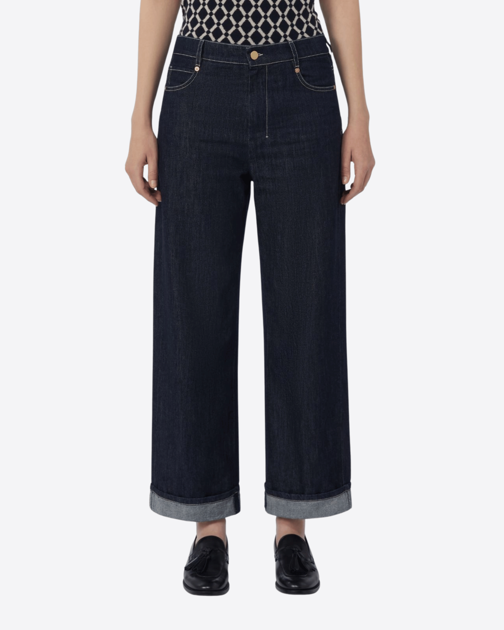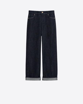 Jeans cinque tasche caratterizzati da ampio risvolto sul fondo, realizzati in denim indaco di puro cotone trattato in capo per un effetto morbido e vissuto. Gamba larga per una vestibilità comoda e moderna. Chiusura con zip coperta e bottone a chiodo logato. Tasche a toppa sul retro, rivetti in metallo e impunture a contrasto color ecru completano il design con dettagli funzionali e distintivi. Label personalizzata in vita sul retro per un tocco di riconoscibilità.