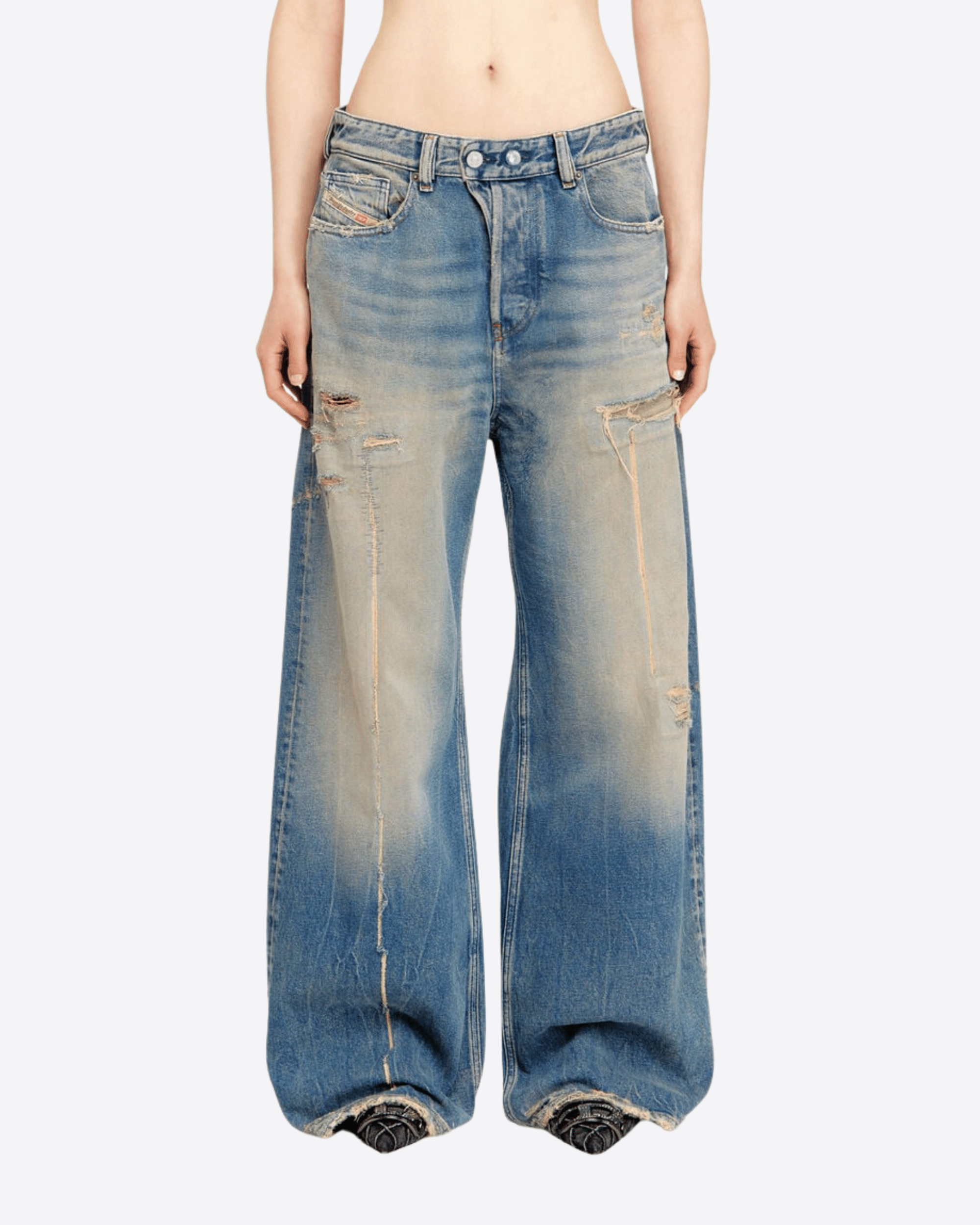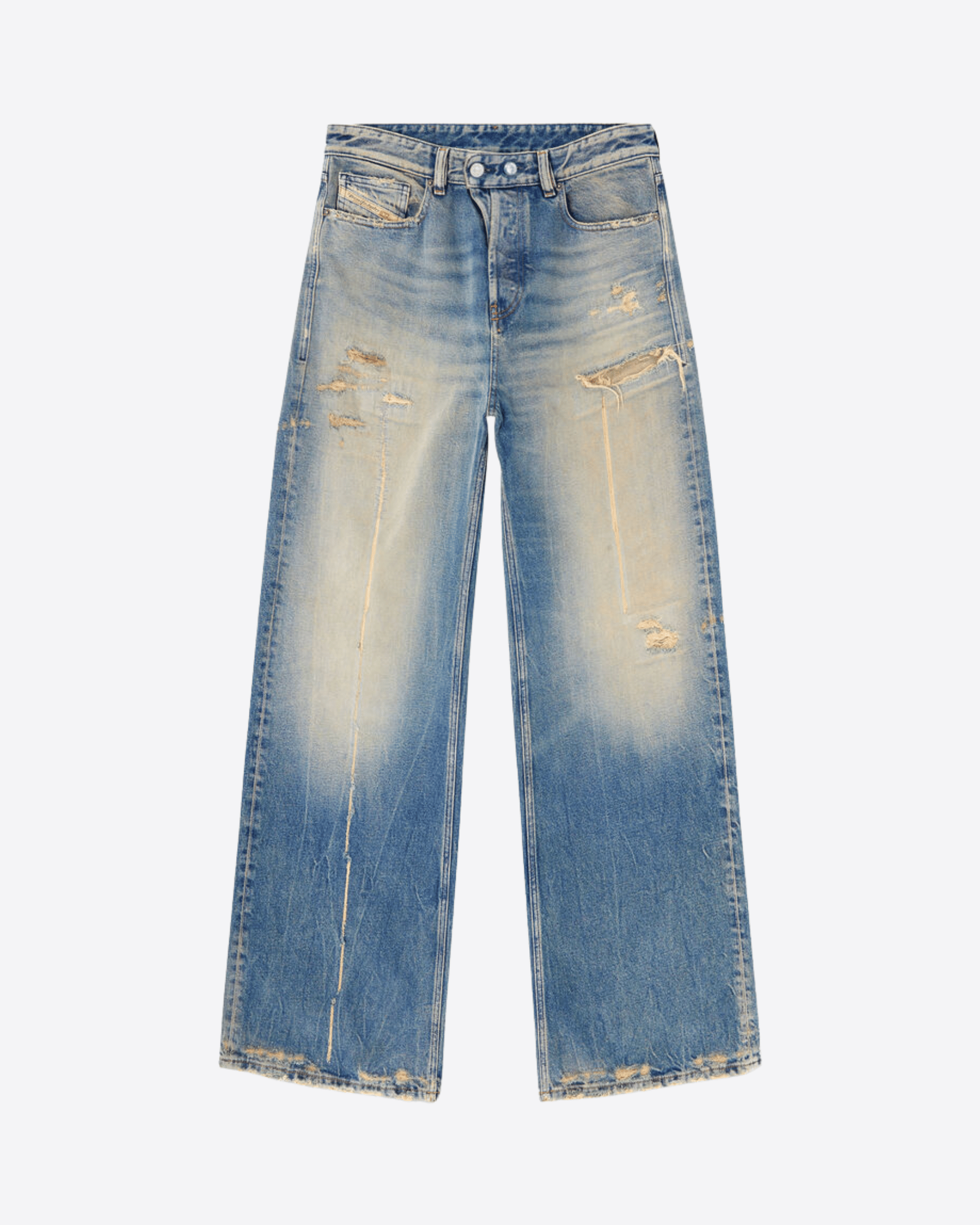 Relaxed Jeans 1996 D-Sire 09N29 firmati Diesel, a relaxed fit con vita bassa, cavallo basso e gamba extra-lunga e wide. La più ampia delle silhouette in denim del brand, offre un design morbido e oversize con chiusura a bottoni. Realizzati in denim 100% cotone blu chiaro, richiedono quasi due giorni di lavorazioni specializzate. Un’interpretazione artigianale dell’estetica destroyed, parte del DNA Diesel, presenta whisker e sfumature create con molteplici passaggi laser. I lavaggi enzimatici e nebulizzati esaltano l’effetto vissuto, mentre tagli, patch e abrasioni sono applicati e rammendati interamente a mano. Ogni capo è unico, rifinito con tintura a pigmenti naturali e modellatura 3D in resina, mentre bottoni e rivetti ricoperti in resina azzurra completano il look distintivo.