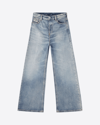 Relaxed Jeans 1996 D-Sire 0BEBL firmati Diesel, a relaxed fit con vita bassa, cavallo basso e gamba extra-lunga e wide. La più ampia delle silhouette in denim del brand, offre un design morbido e oversize con chiusura a bottoni. Realizzati in cotone biologico e TENCEL™ Lyocell, presentano un denim blu medio dalla texture fluida, completato da trattamenti tipici Diesel come whisker, sfumature ed effetti dirt, per un look distintivo e autentico DNA.