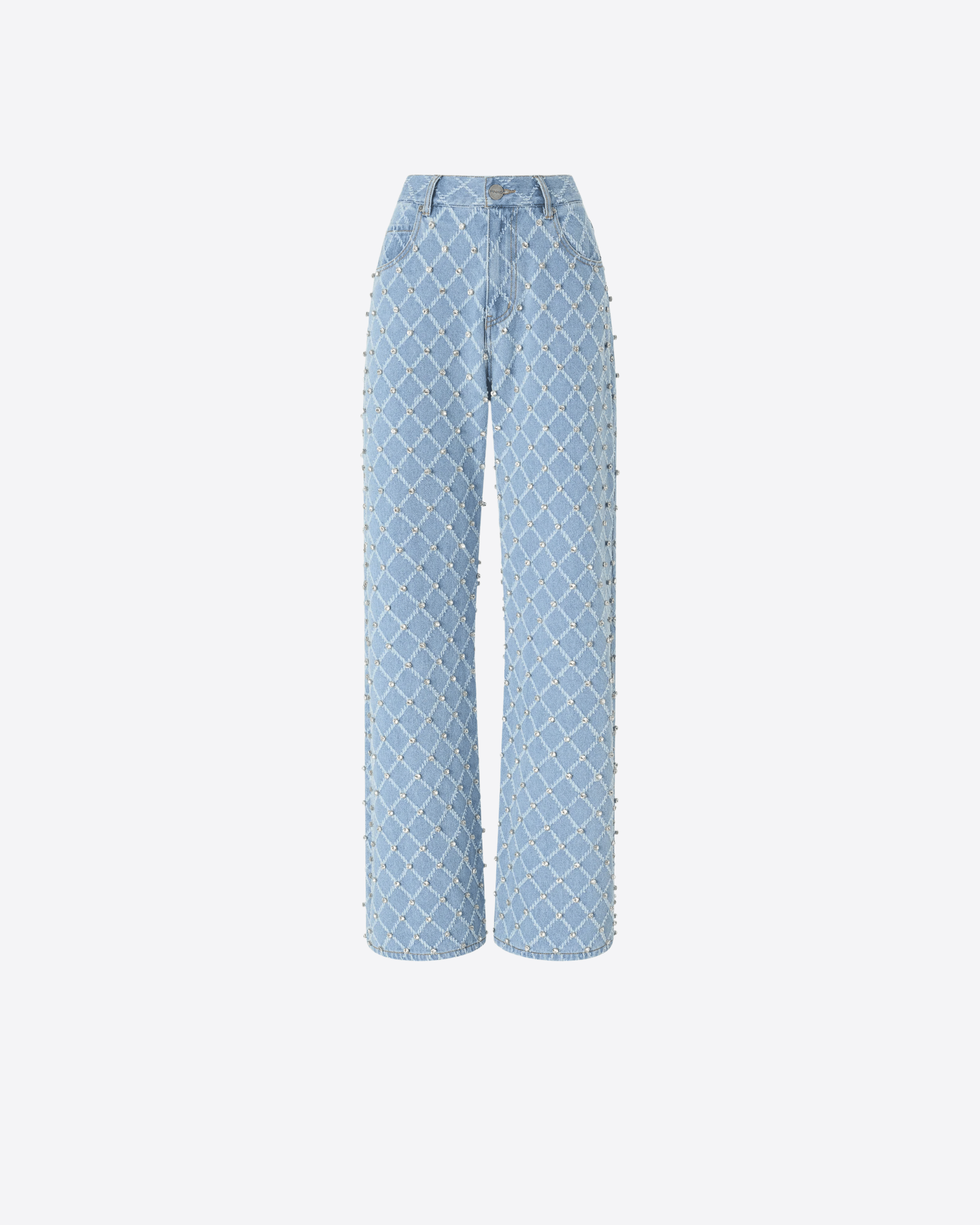Jeans cinque tasche wide leg realizzati in denim di puro cotone, caratterizzati dal logo lettering Pinko leggermente sfrangiato su una delle tasche posteriori. Il modello esprime un raffinato gioco di contrasti, cifra stilistica del brand: il design essenziale incontra un motivo a rombi laserato tono su tono, impreziosito da strass luminosi ricamati a mano. Un capo dal carattere contemporaneo, perfetto da indossare con la giacca coordinata per dare luce e personalità ai look di tutti i giorni.