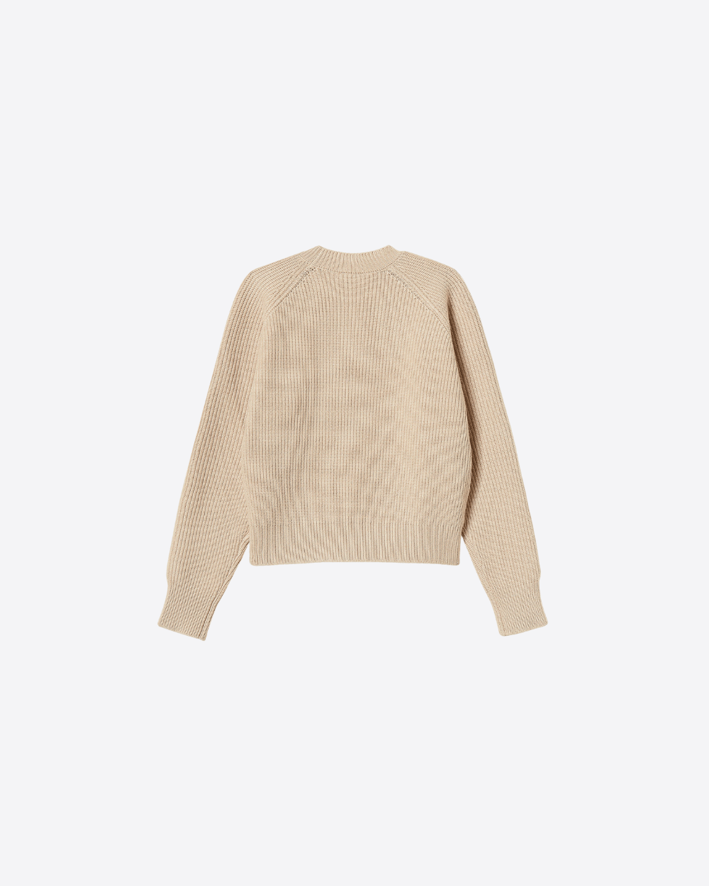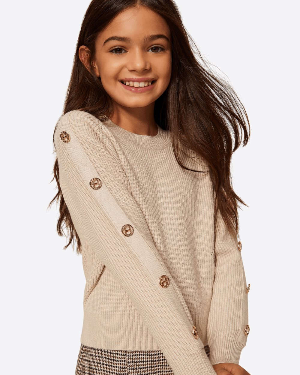 Maglia in misto viscosa con lavorazione a costa inglese. Ha collo tondo, maniche lunghe con applicazione di bottoni logati Oval T in metallo, spalle scese, linea dritta.