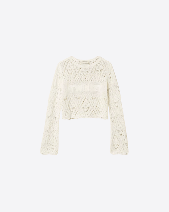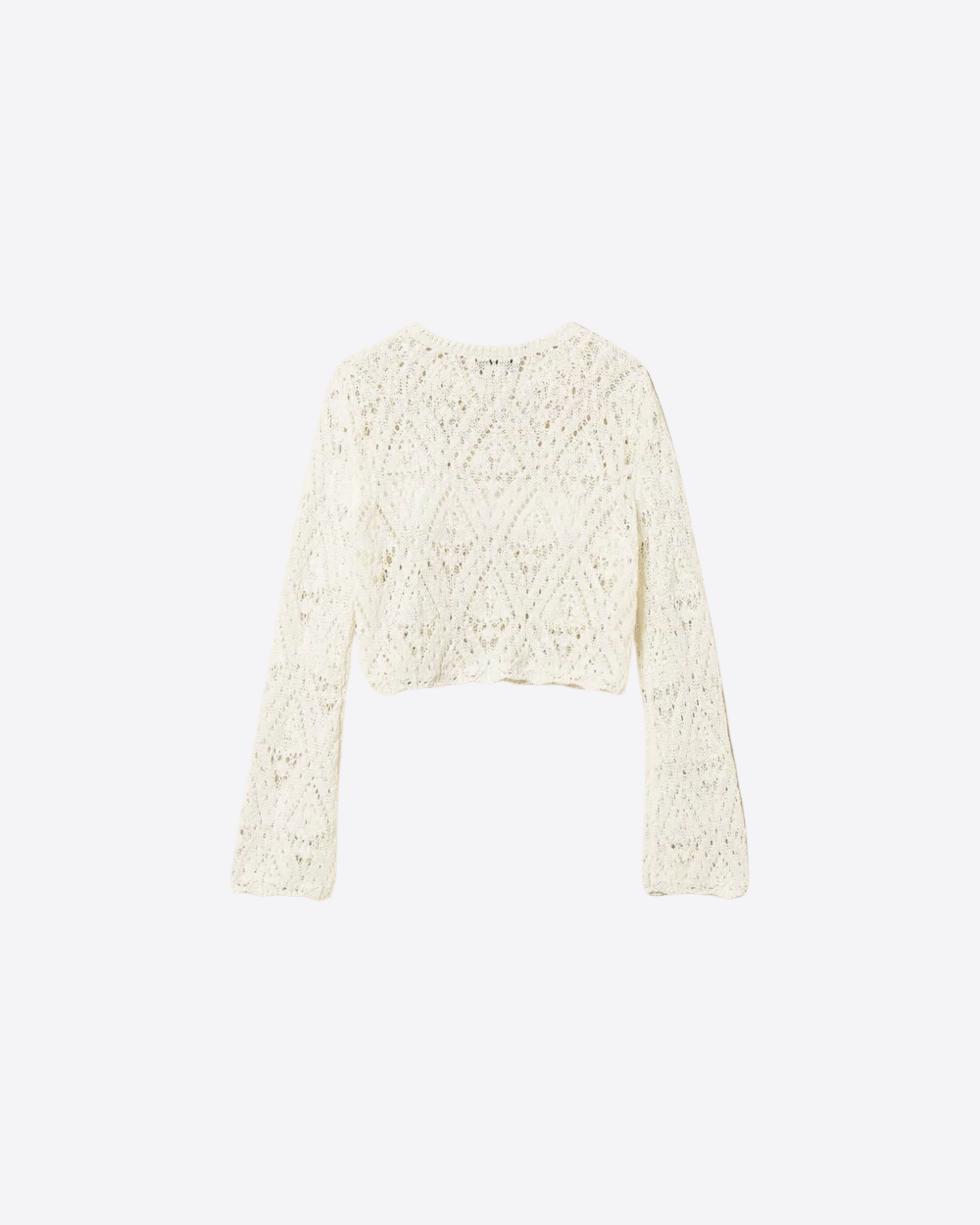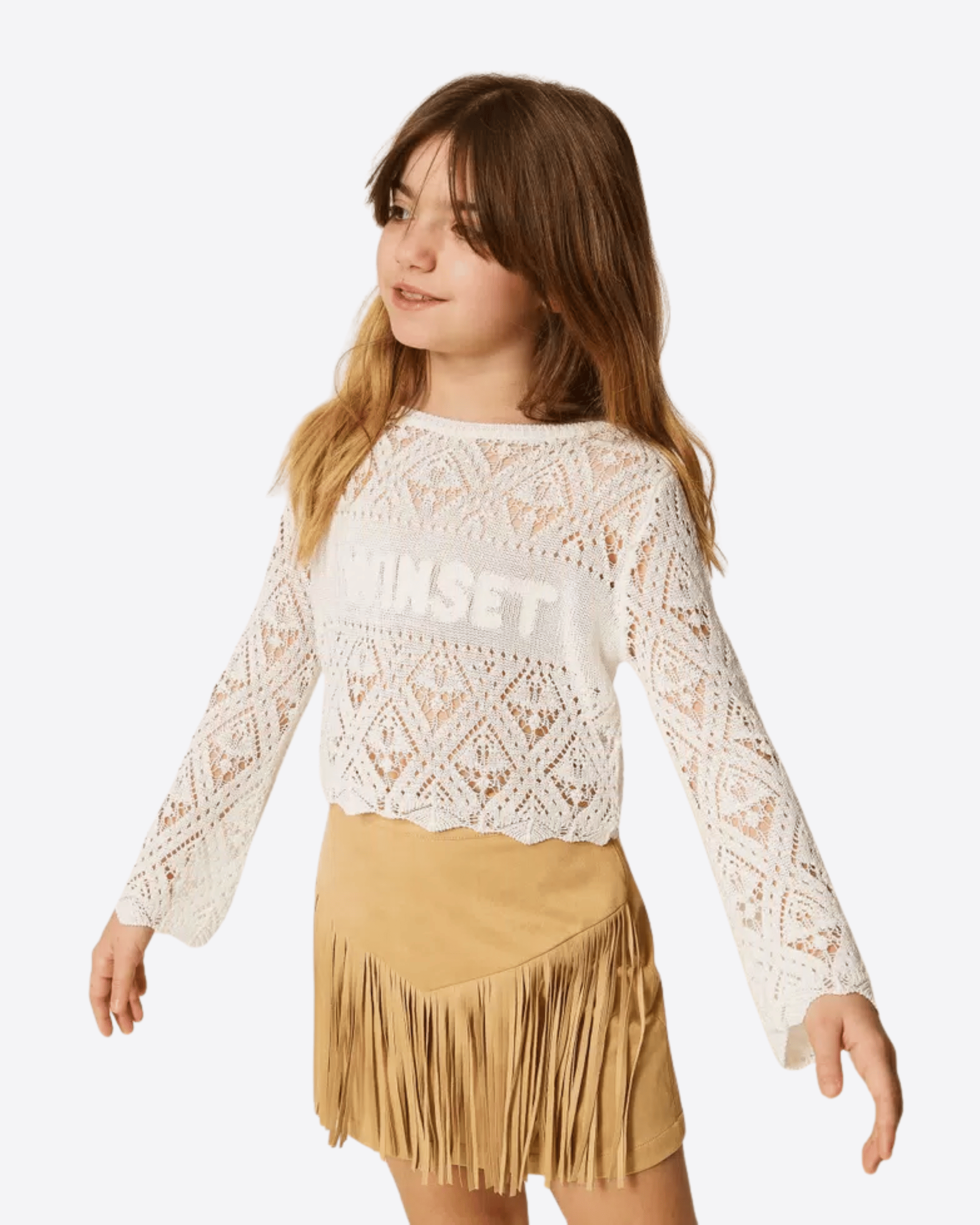 Maglia da bambina realizzata in misto cotone, caratterizzata da una lavorazione punzonata a motivo rombi che aggiunge texture e stile al capo. Presenta collo tondo, maniche lunghe e fondi smerlati per un dettaglio delicato e femminile.
