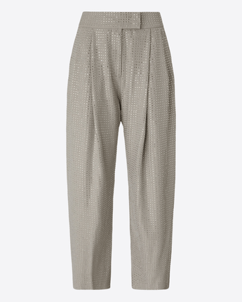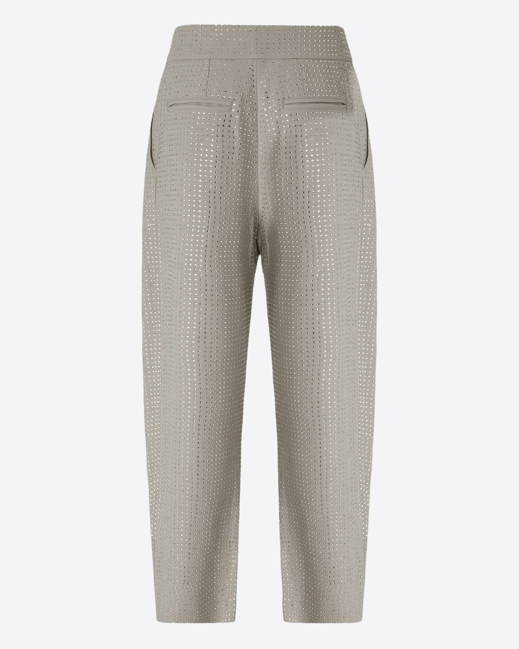 Dal design deciso e contemporaneo, questi pantaloni si distinguono per il volume oversize e la vestibilità confortevole. Realizzati in tessuto di misto viscosa stretch tinto filo, offrono una struttura fluida e una piacevole elasticità. L’applicazione di strass all-over, distribuiti su tutta la superficie, dona luminosità e un raffinato accento glamour.