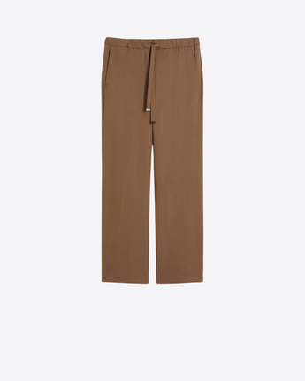 Pantalone modello jogging con coulisse e taglio cropped alla caviglia, perfetto per un look rilassato ma sofisticato. Realizzato in gabardina di pura lana crêpe, un tessuto fluido e leggero che garantisce comfort ed eleganza. La linea leggermente svasata al fondo valorizza la silhouette, mentre la vita elasticizzata regolabile con nastro tecnico assicura una vestibilità personalizzata. Tasche alla francese sui fianchi completano il design con un dettaglio funzionale e raffinato.