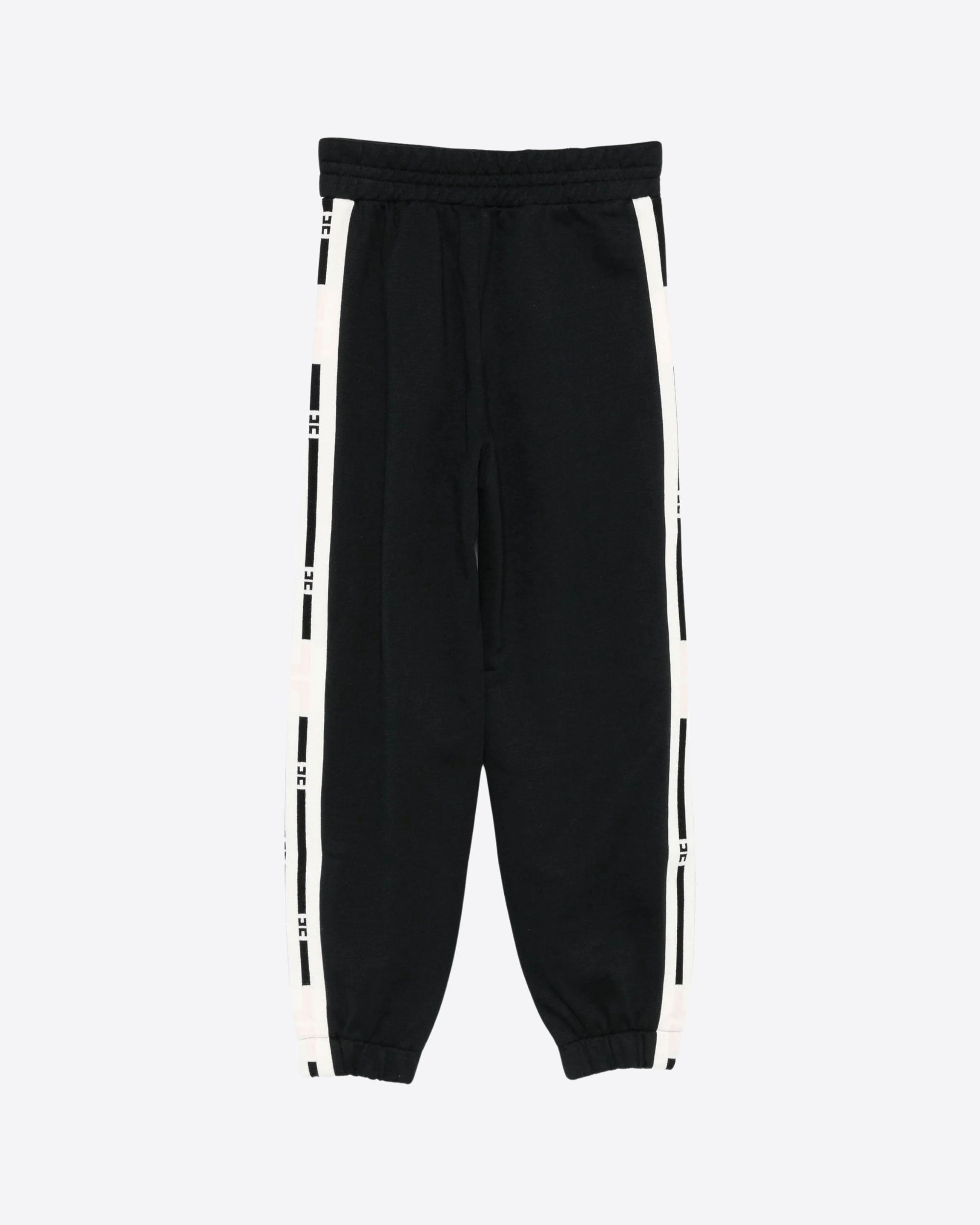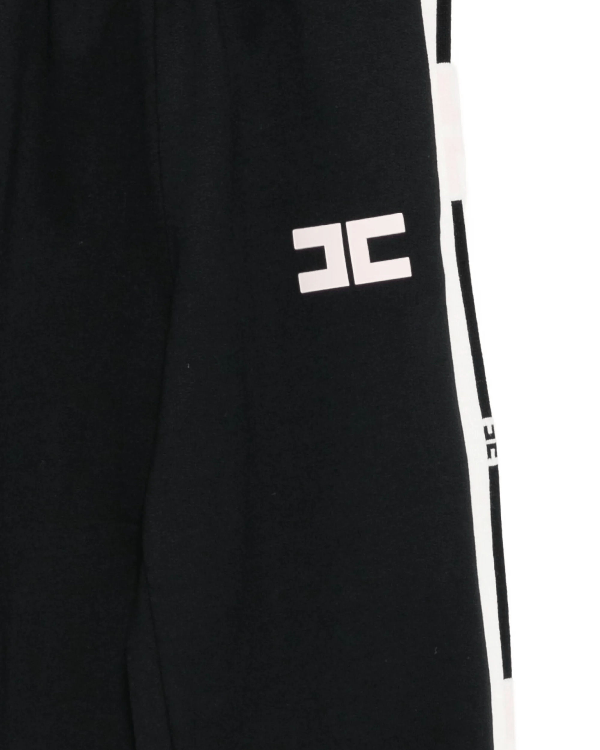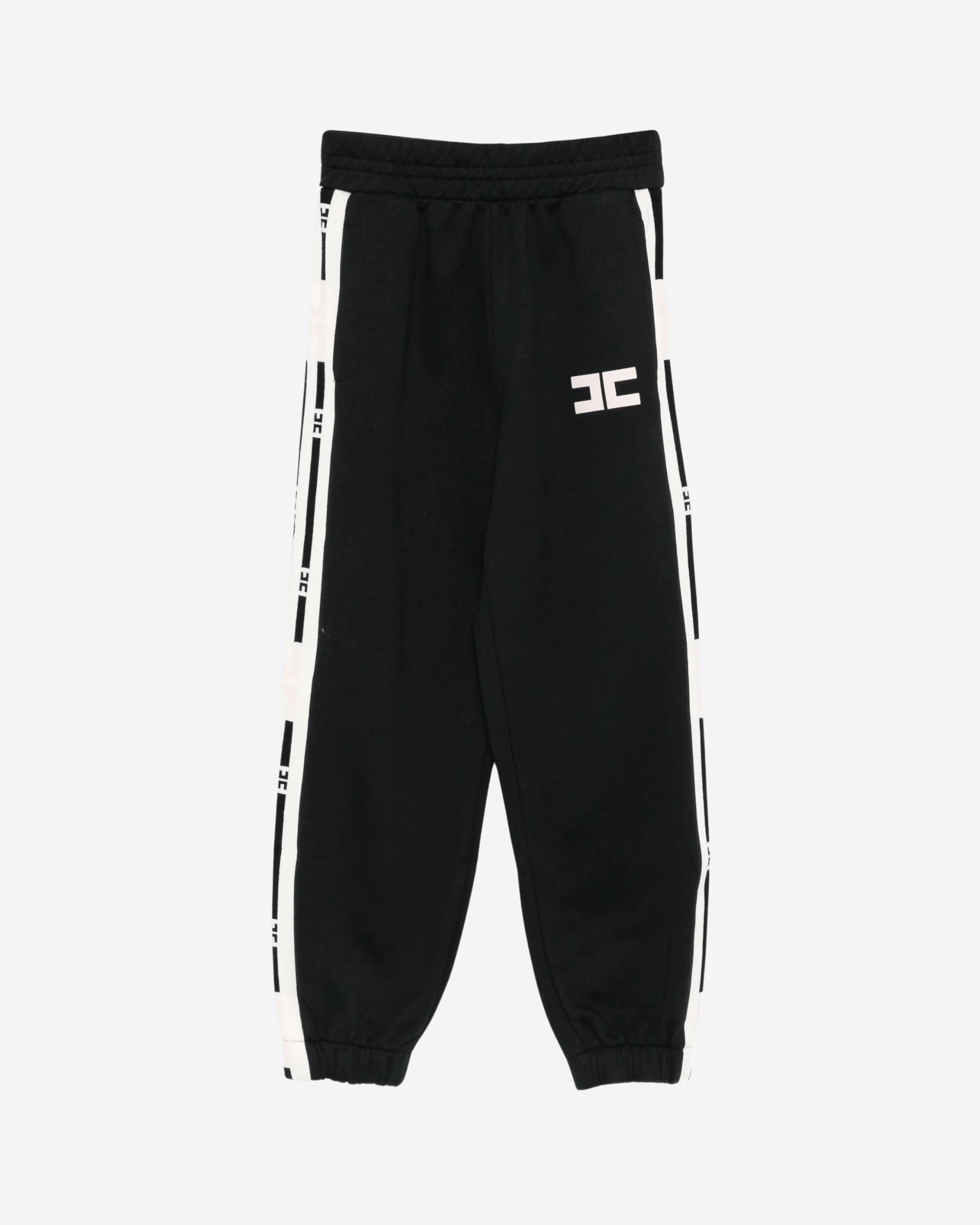 Pantalone nero da bambina Elisabetta Franchi con vita elasticizzata per il massimo comfort. Il dettaglio laterale a righe aggiunge un tocco di stile sportivo ed elegante, ideale per completare un outfit casual e raffinato.