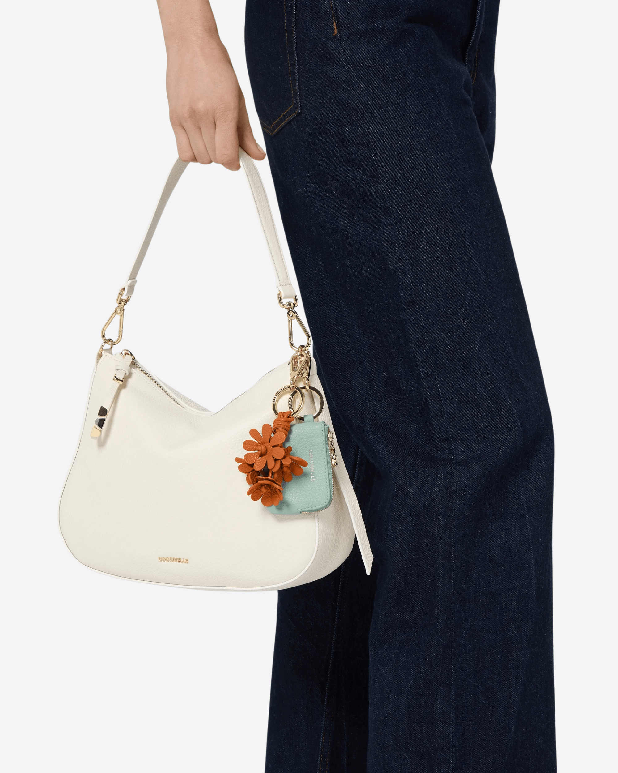 Coccinelle reinterpreta il portachiavi trasformandolo in un raffinato simbolo di femminilità. Il design a fiore, delicato ed elegante, è pensato per impreziosire borse e accessori, aggiungendo un tocco distintivo allo stile quotidiano.