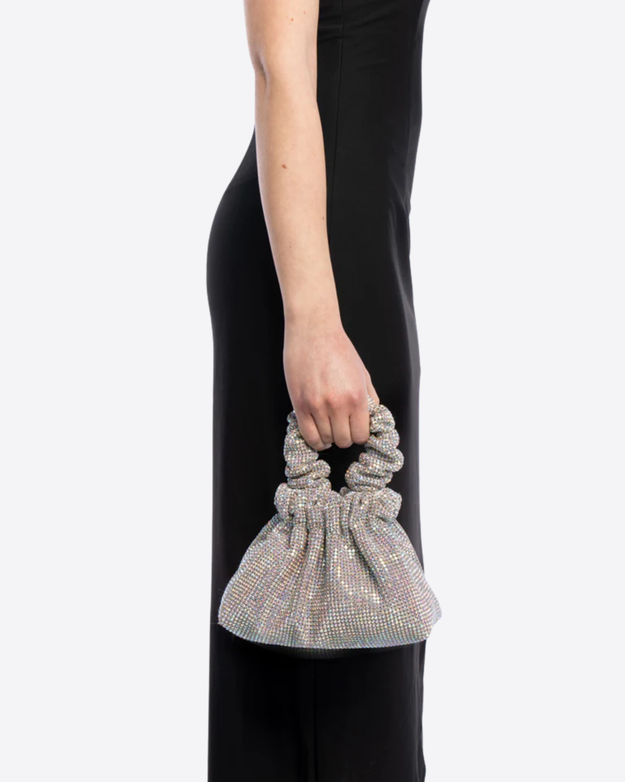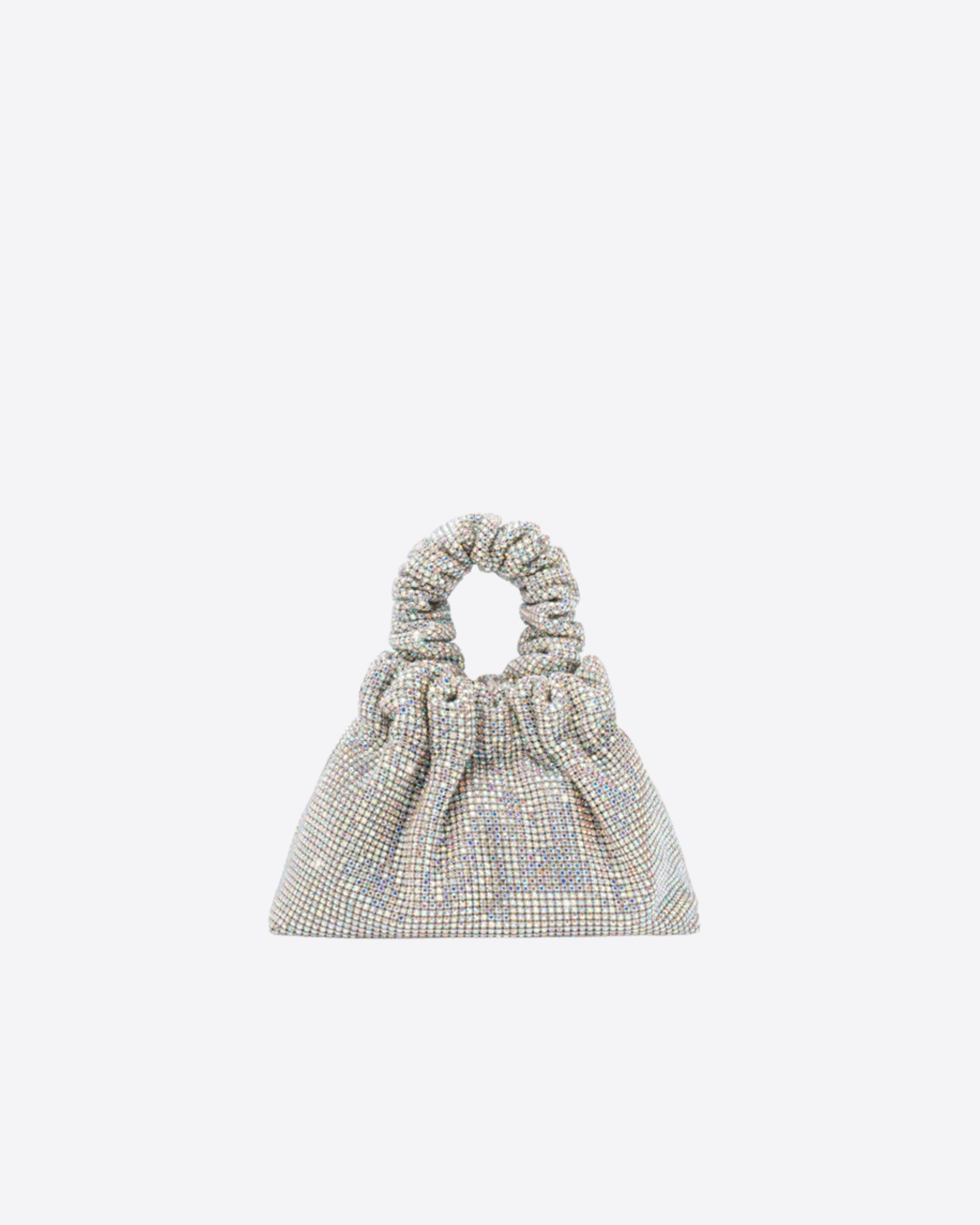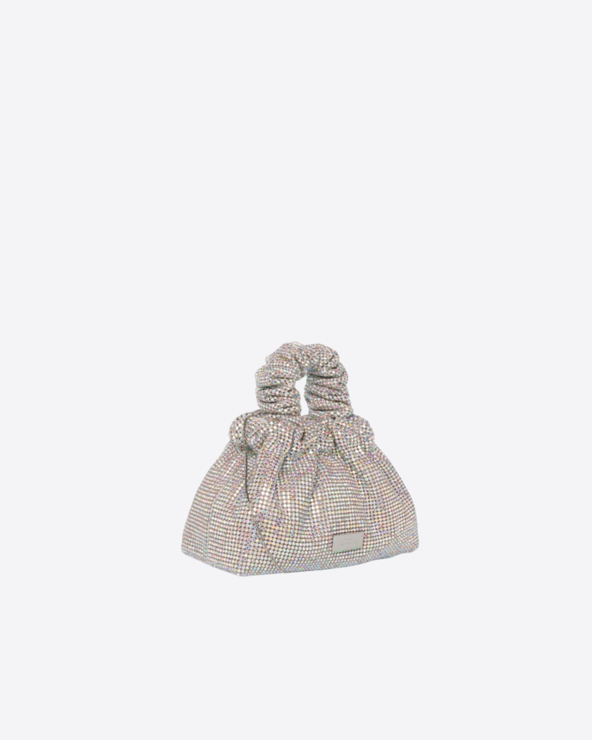 Il design è arricchito da un manico scrunchie, dettaglio contemporaneo e confortevole, e da una sottile tracolla che consente una doppia portabilità, a mano o crossbody. Compatta ma d’impatto, è l’accessorio ideale per completare outfit da sera o occasioni speciali con eleganza e brillantezza.